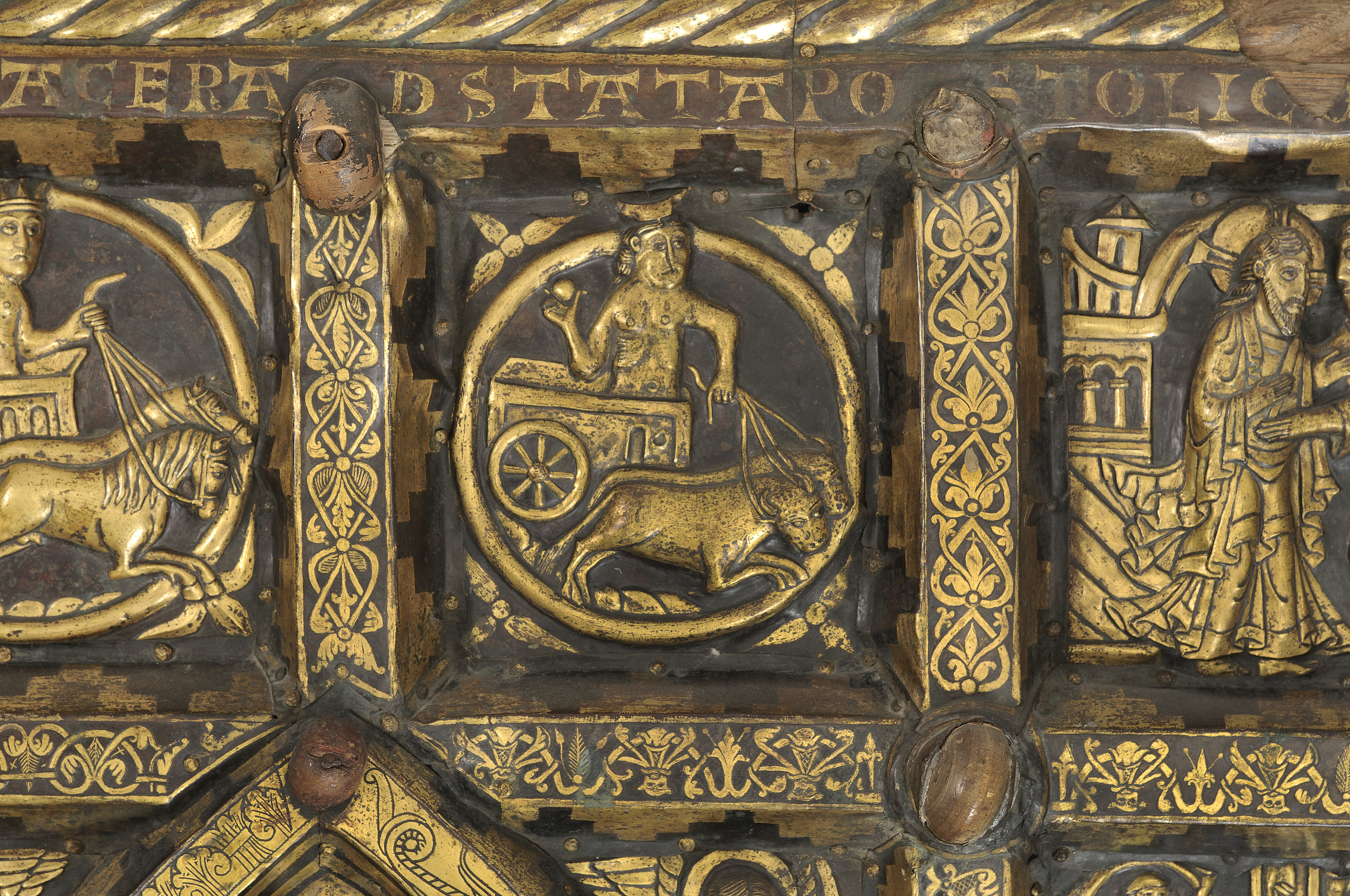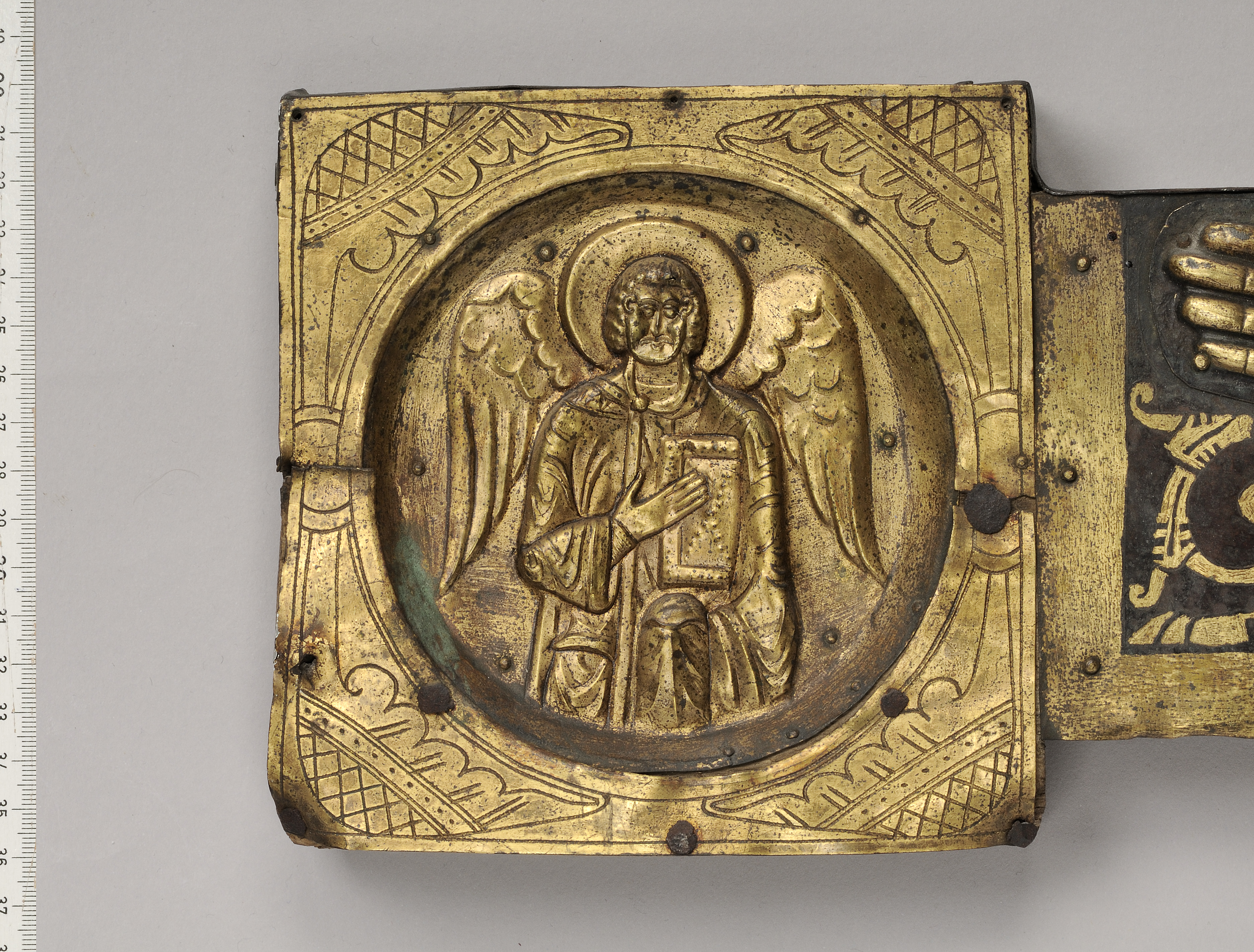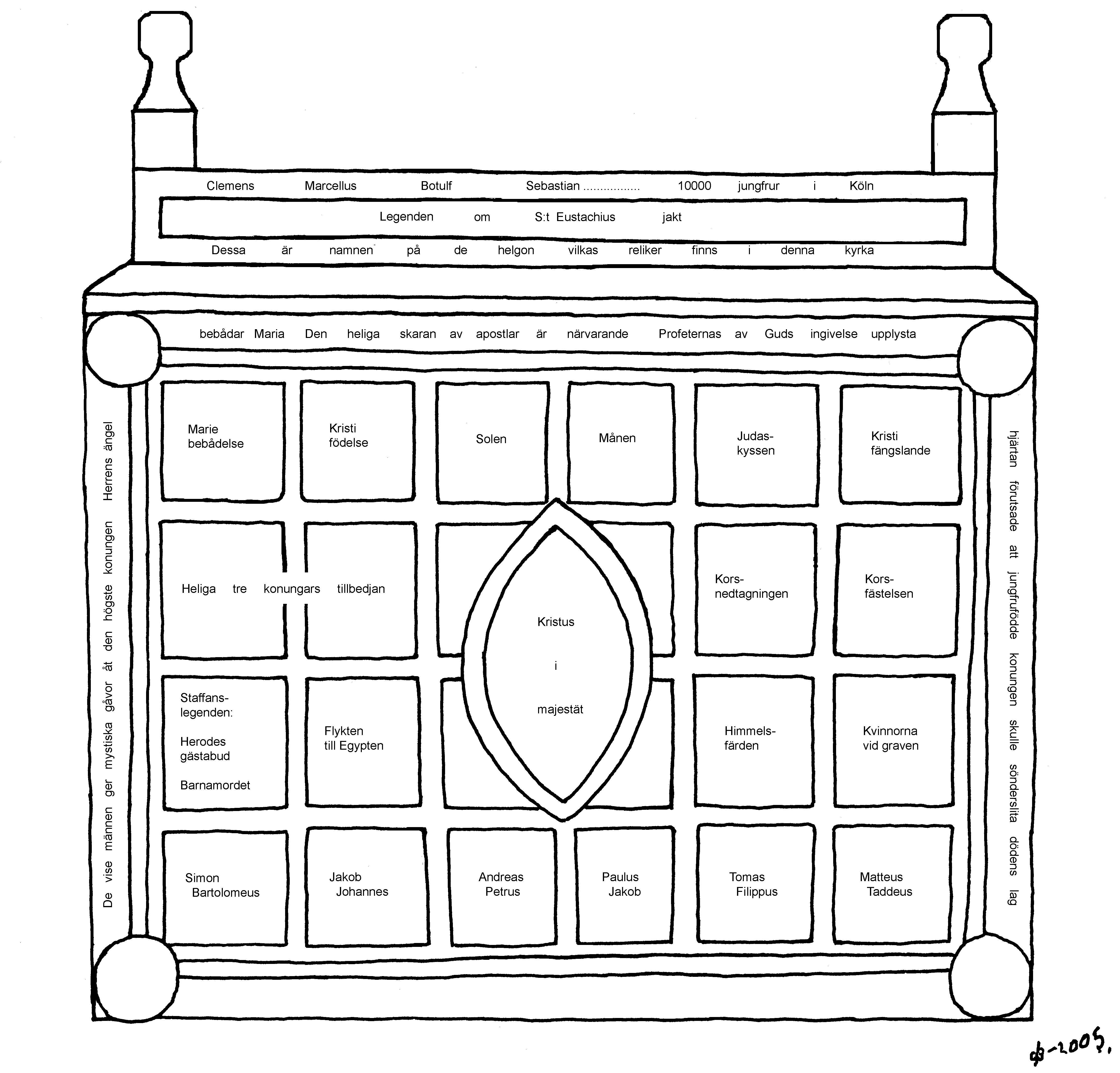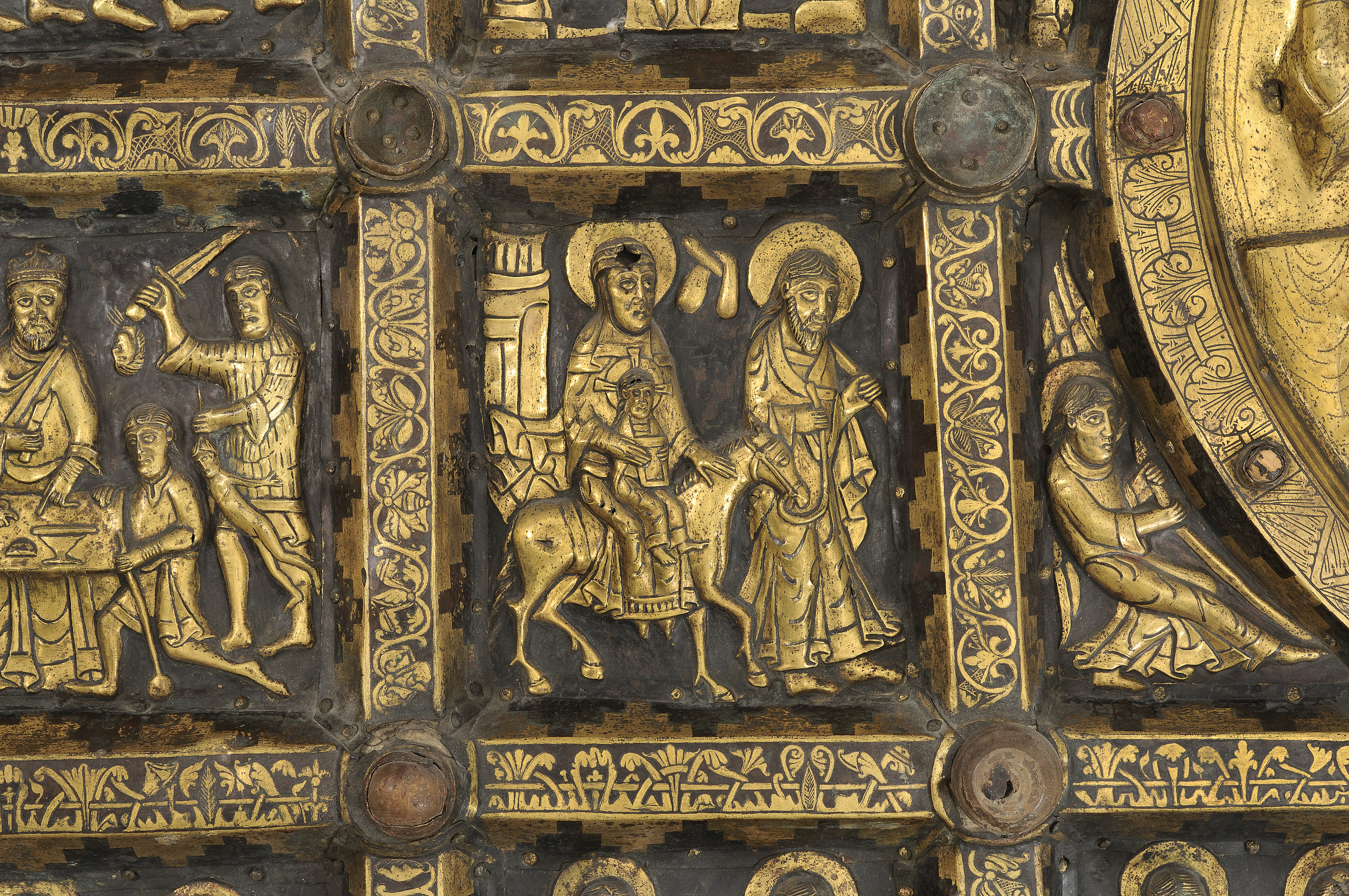 Antemensale av driven, förgylld koppar på träkärna samt tillhörande krucifix och superfrontale i samma teknik.