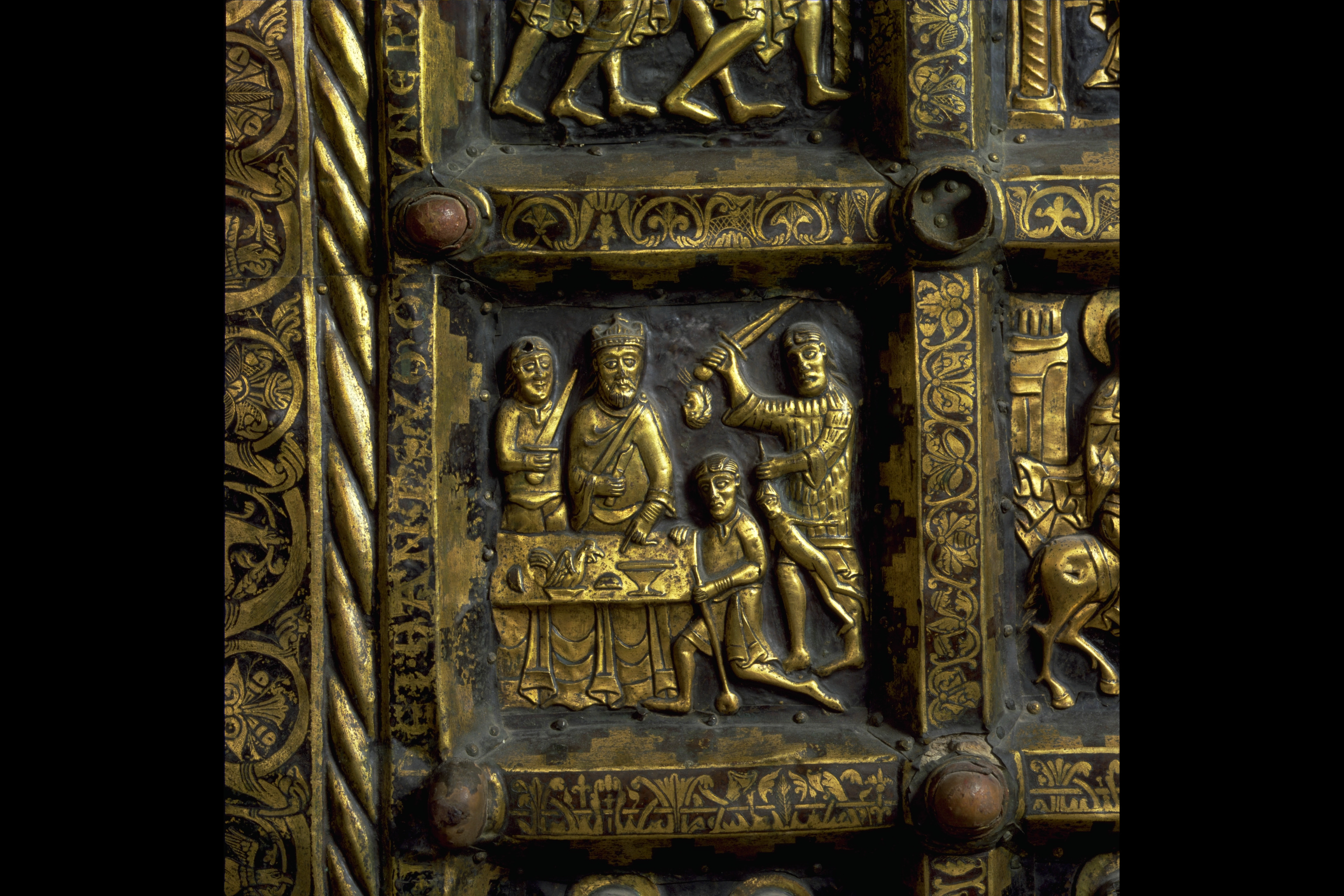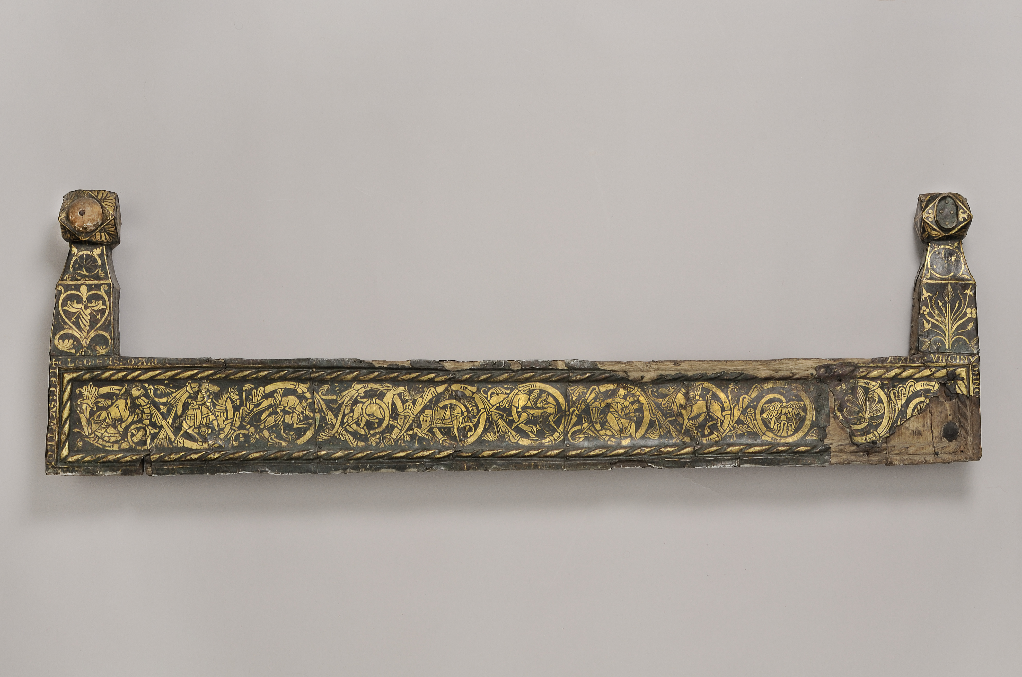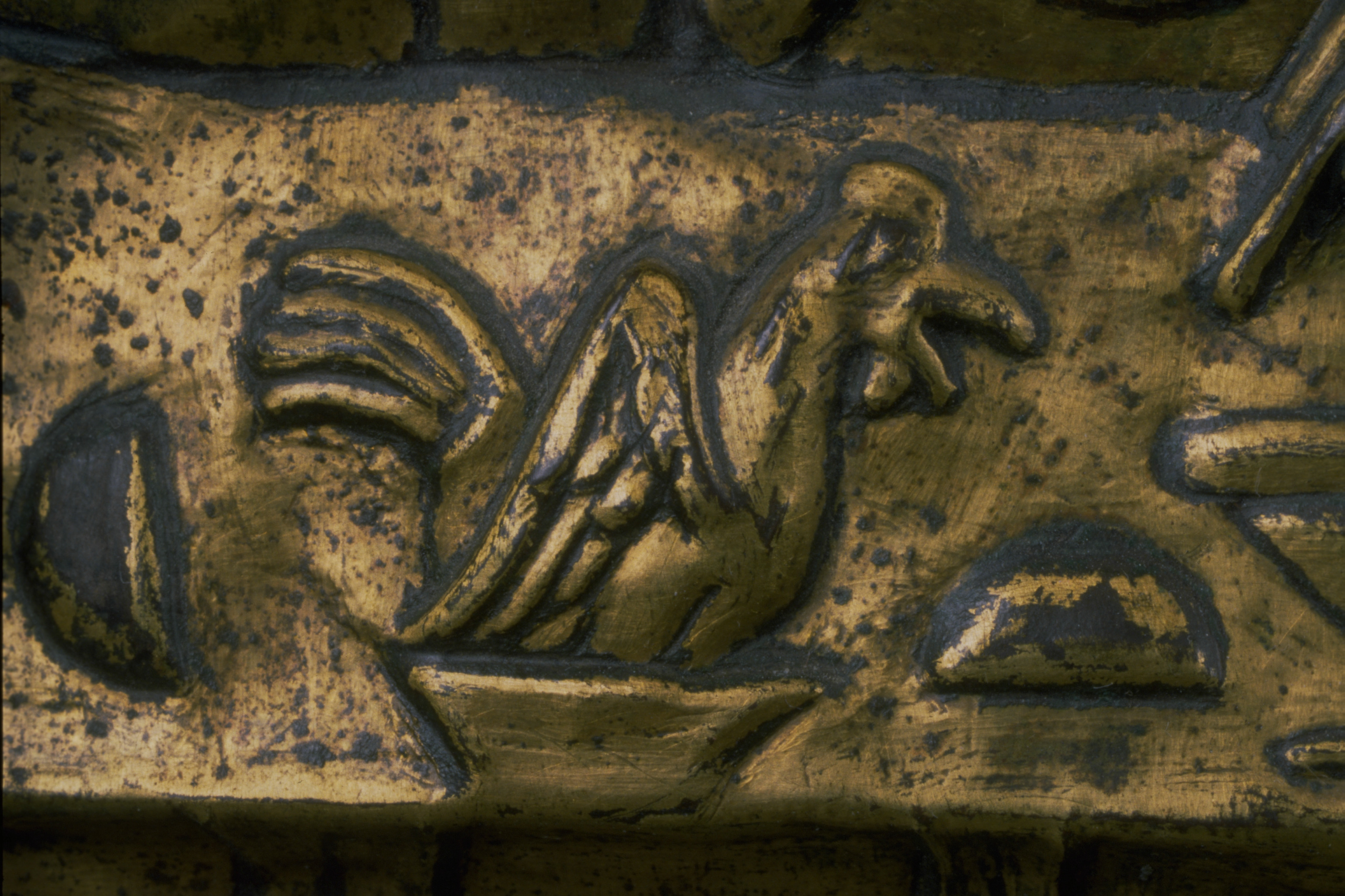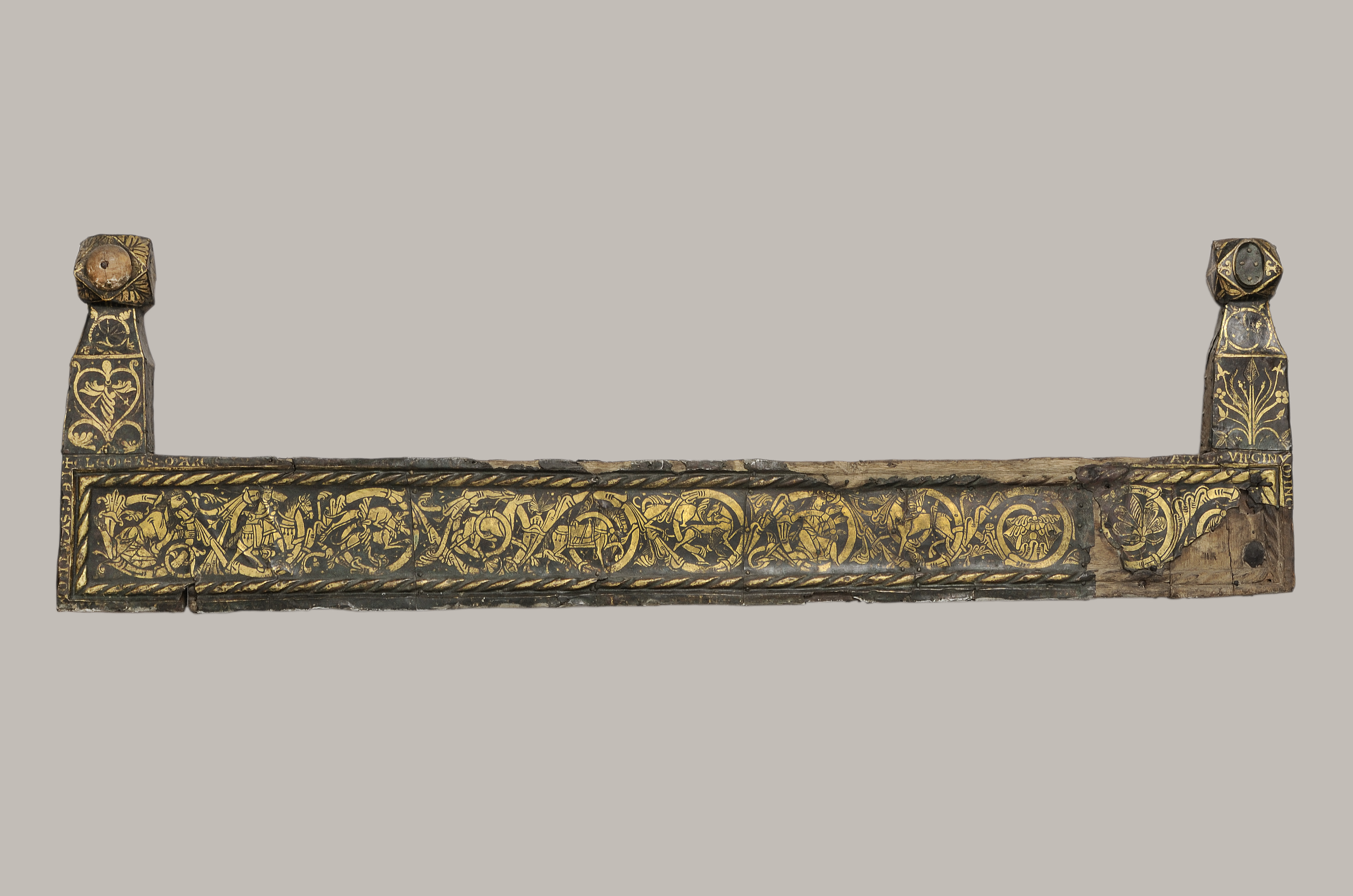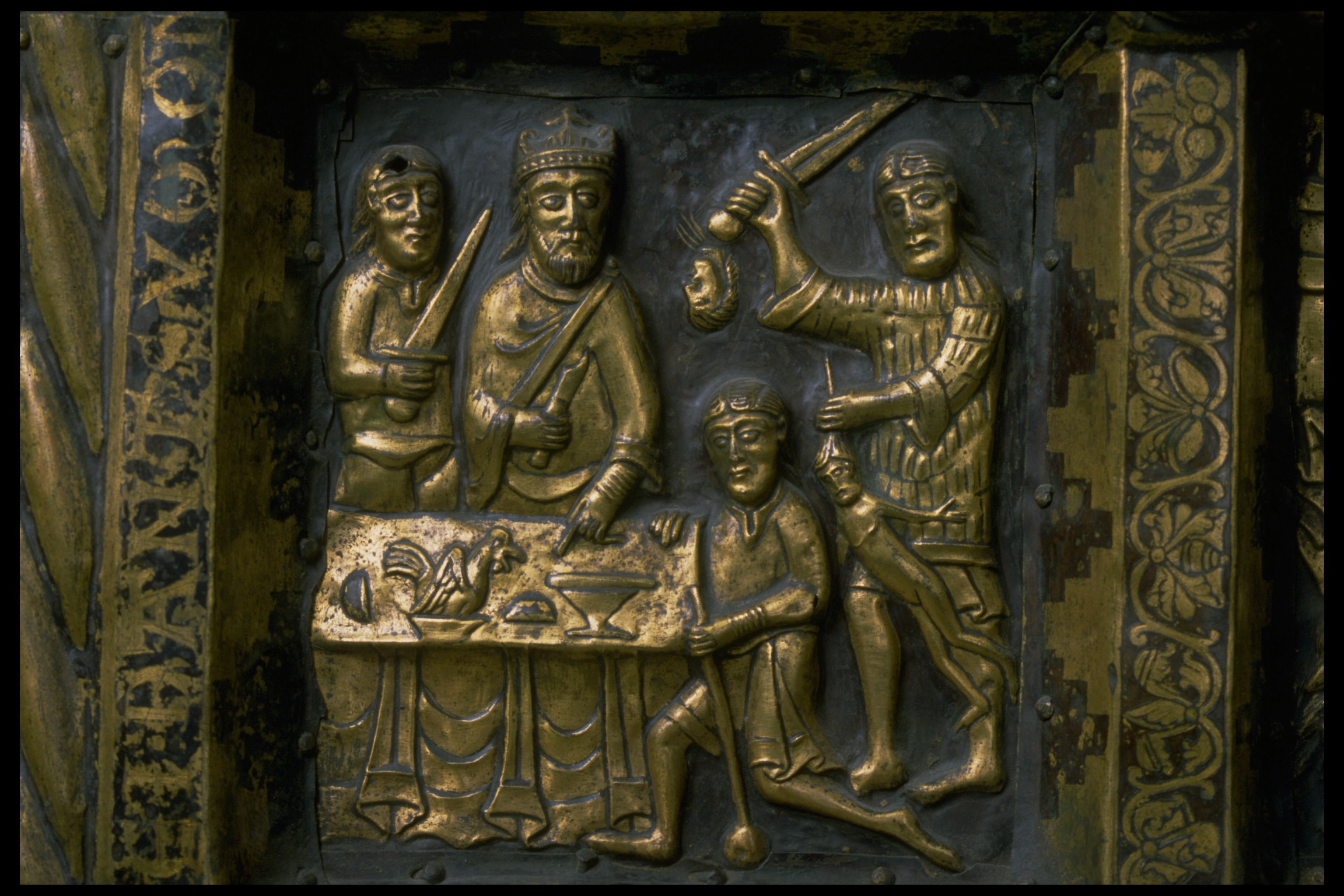 Antemensale av driven, förgylld koppar på träkärna samt tillhörande krucifix och superfrontale i samma teknik.