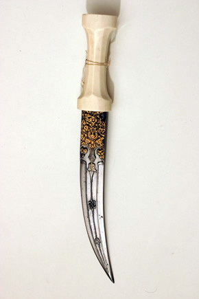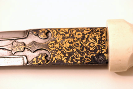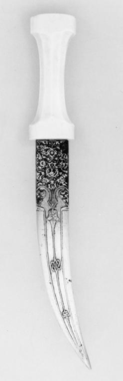 Fäste av snidat elfenben med formsnidat mittparti fästet har oval genomskärning. Tvåeggad klinga av stål, böjd, med ricasso 65 mm lång med dekor av påslaget guld i form av bladornament. Vid ricassons övergång till klingan finns etsad dekor i kraftiga konturer i form av blad. Klingan har tre smala åsar med etsat mellanrum. På mittåsen är två ornament utsparade genom etsning. Friherre Georg Abraham Fleetwoods samling 124. Enligt dr Jurij Miller, Eremitaget, 1991-05-30, turkiskt arbete, 1600-talets början.