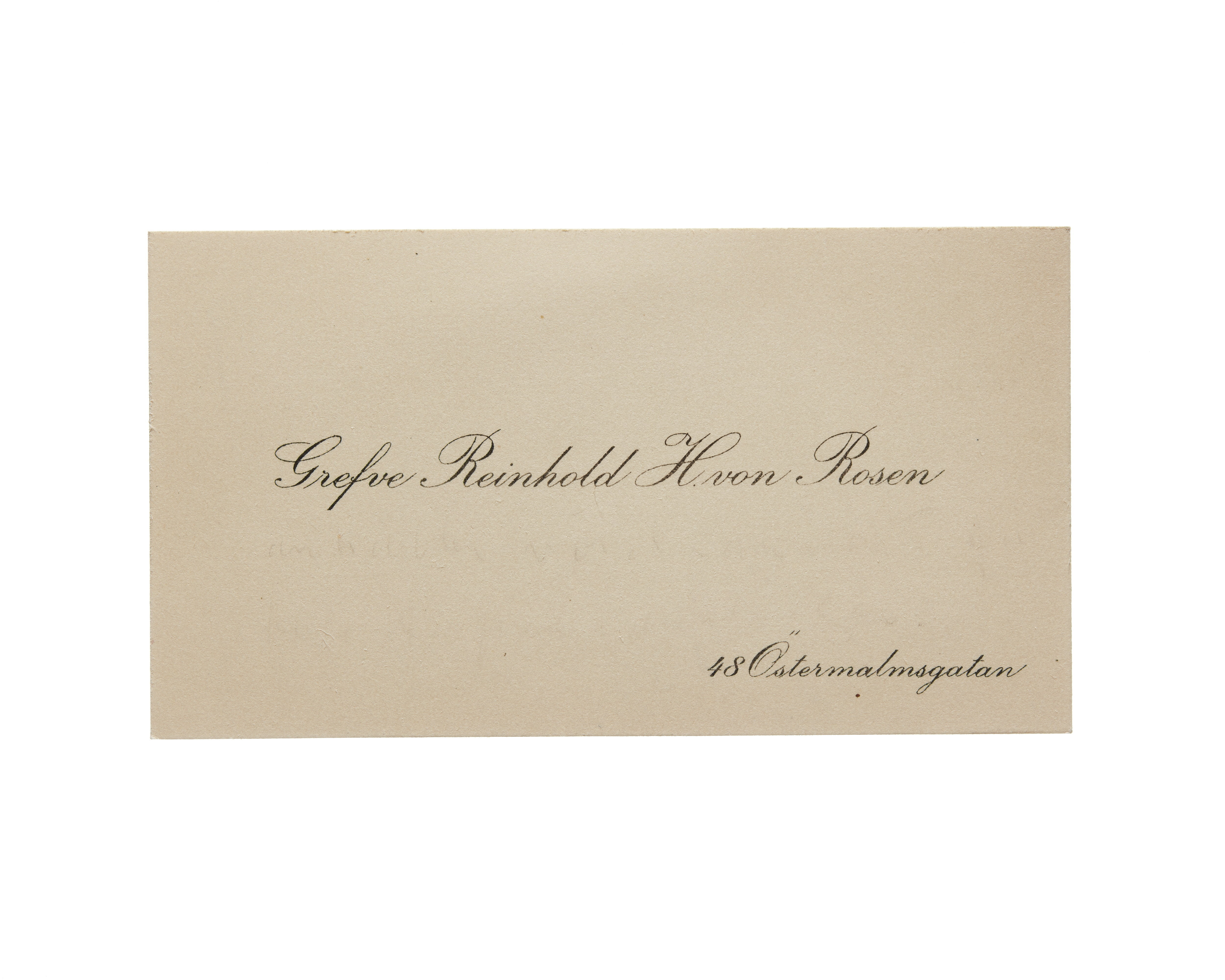 Ett visitkort från Greve Reinhold H. von Rosen, daterat 1919. Adress (nedre högra hörnet) 48 Östermalmsgatan.