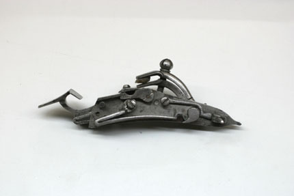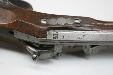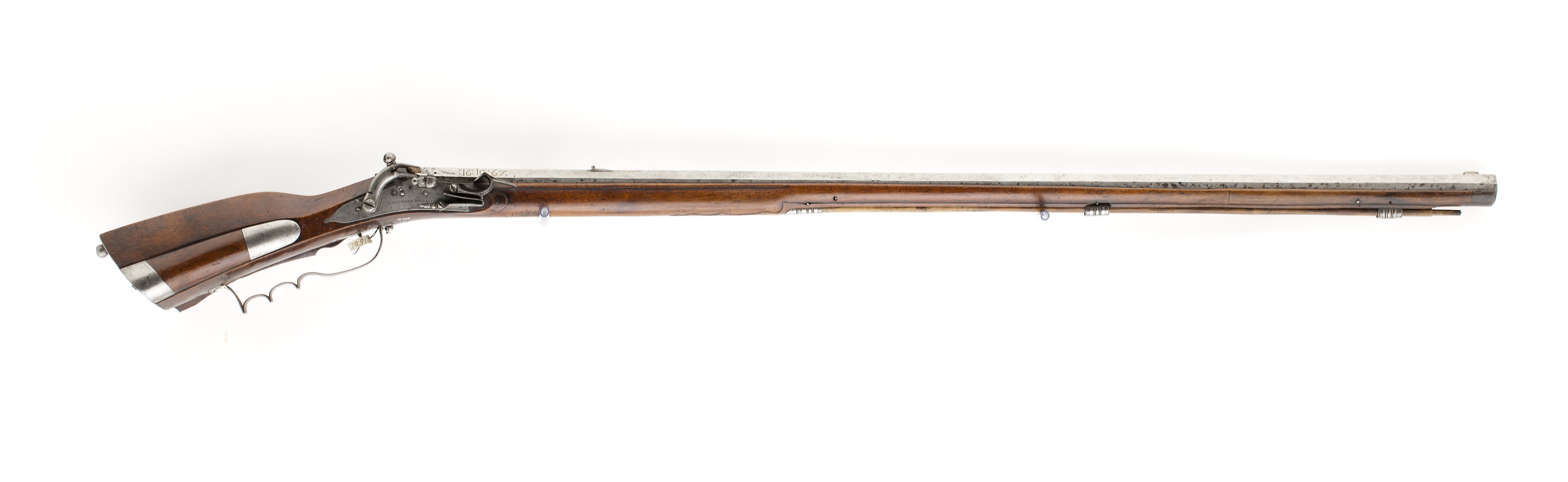 Åttsidig pipa av stål, åtta räfflor. På kammaren en stämpel: ISPC (Stöckel nr 3619) samt inlagt med mässing: "1667 IC". Riktmedel: Över kammaren siktskåra fram till ståndsikte av stål. Stolpkorn av silver. Fästning: Två häften.Pipan fäst med krysskruv underifrån (främrevarbygelskruven). Snapplås, lägglås, infjäderslås av stål med plant, något graverat låsbleck med kantmarkering och bladdekor. Kraftigt böjd hane med hake på foten, inlaxad överkäke. Fängpanna rundad med rörligt lock, eldstål-fängpannelock med böjd arm. Nedanför fängpannan graverad signatur: "SCHERTIGER STOCKHOLM". Fästning: Avtryckare Helstock av valnöt med tyskliknande kolv med snidad bladvolut på vingen. Beslag av stål, bakplåt med stödkula, ändbeslag på kolvlådelocket, sidbleck med ovalt mittparti och profilerade armar. Tre profilerade rörkor samt varbygel med tre fingerlägen. Näsband av horn. Tillbehör: Laddstock av trä.