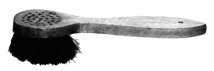 PÅSTRYKARBORSTE (för skokräm). Borstrygg av rödbok, rund, platt, med rakt utstående, platt skaft med spetsig ytterända och avsmalnande inåt samt med rak kant, i skaftet vid ytterändan ett runt hål. Inköpt av Wilhelmina von Hallwyl efter år 1900 hos handlare i Stockholm.