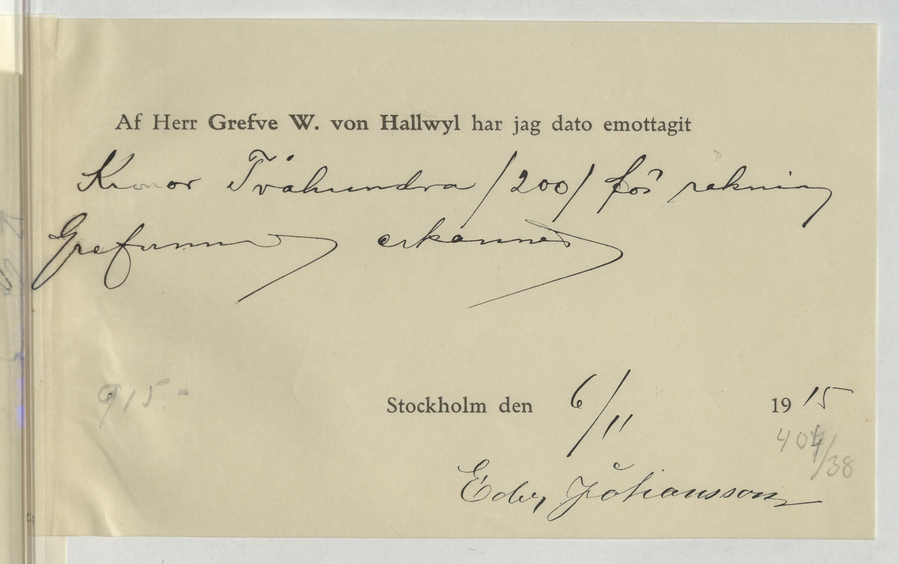 Kvitto från Edv. Johanson, Snickare. Gällande betalning för utfört arbete.