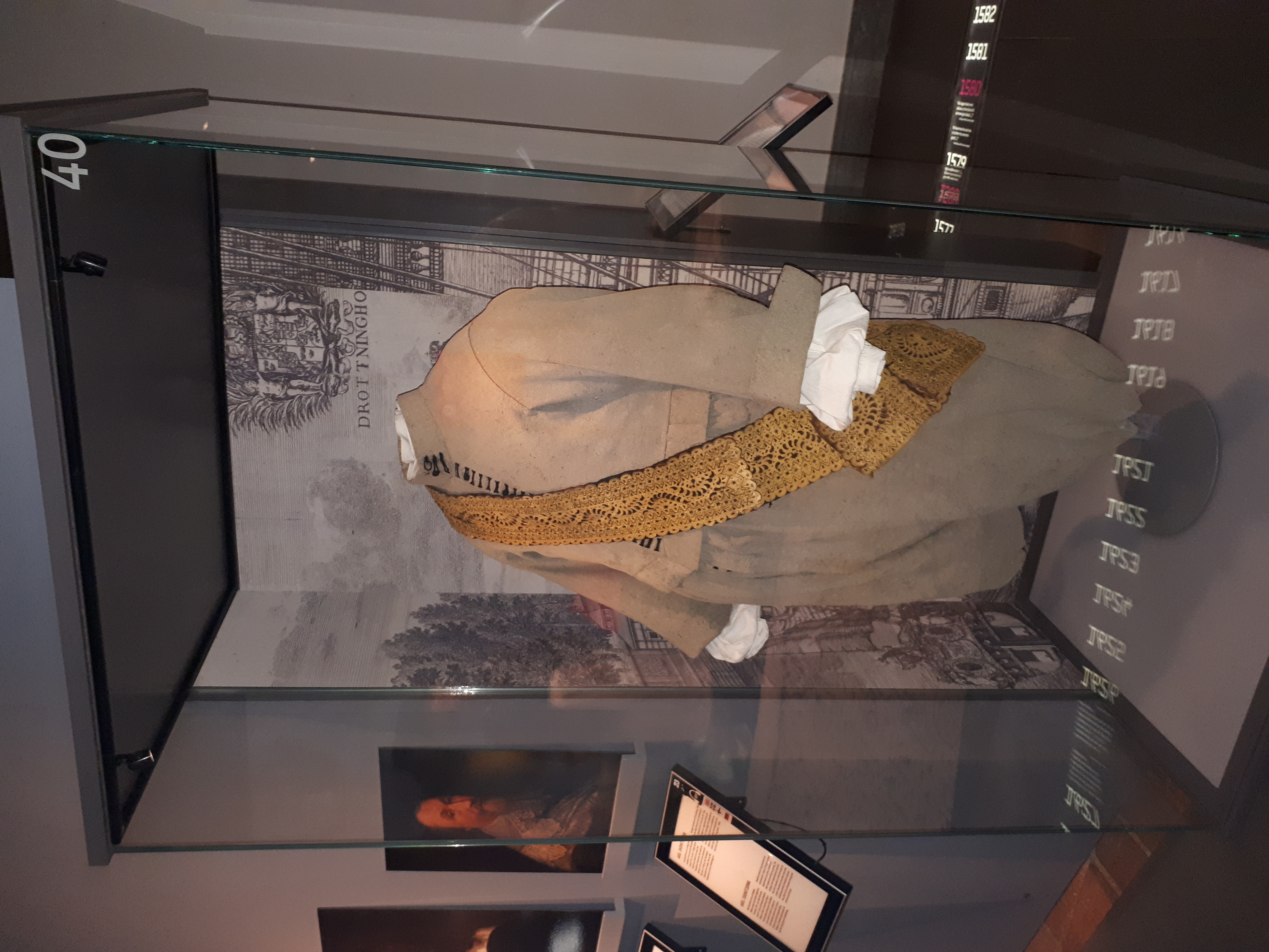 Claes Hansson Bielkenstiernas (1615-1662) dräkt bestående av jacka, byxor, skjorta och gehäng. Jacka och byxor av ljusgrått kläde, vit linnelärftskjorta och gehäng av sämskskinn med utstansad dekor och guldbroderi. Deposition 1878. Utdeposition till Livrustkammaren 1901, inv nr 5793:1 (25600-25602, 21454) (Magnus Green, Katalog över Österhaninge kyrkas textilier, 2004.)