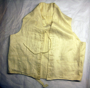 Väst av vitt kypertvävt linne med öppen ståndkrage. Knäppning mitt fram bestående av nio tränsade hål för fästande av knappar samt motsvarande knapphål. På vardera framstycke är iskuret en horisontell ficka, l. 162 mm, med en kantslå, b. 20 mm. På höger framstycke sitter påsytt ett långt vitt knytband av linne. Ryggstycket är av ett tunnare linnetyg. Mitt bak samt i nederkanten sitter påsytt fyra knytband av vitt linne. Västen är på insidan fodrad med vitt linne. På fodret, mitt bak nedanför kragen, står en påskrift med svart bläck: "C. E Cederström".