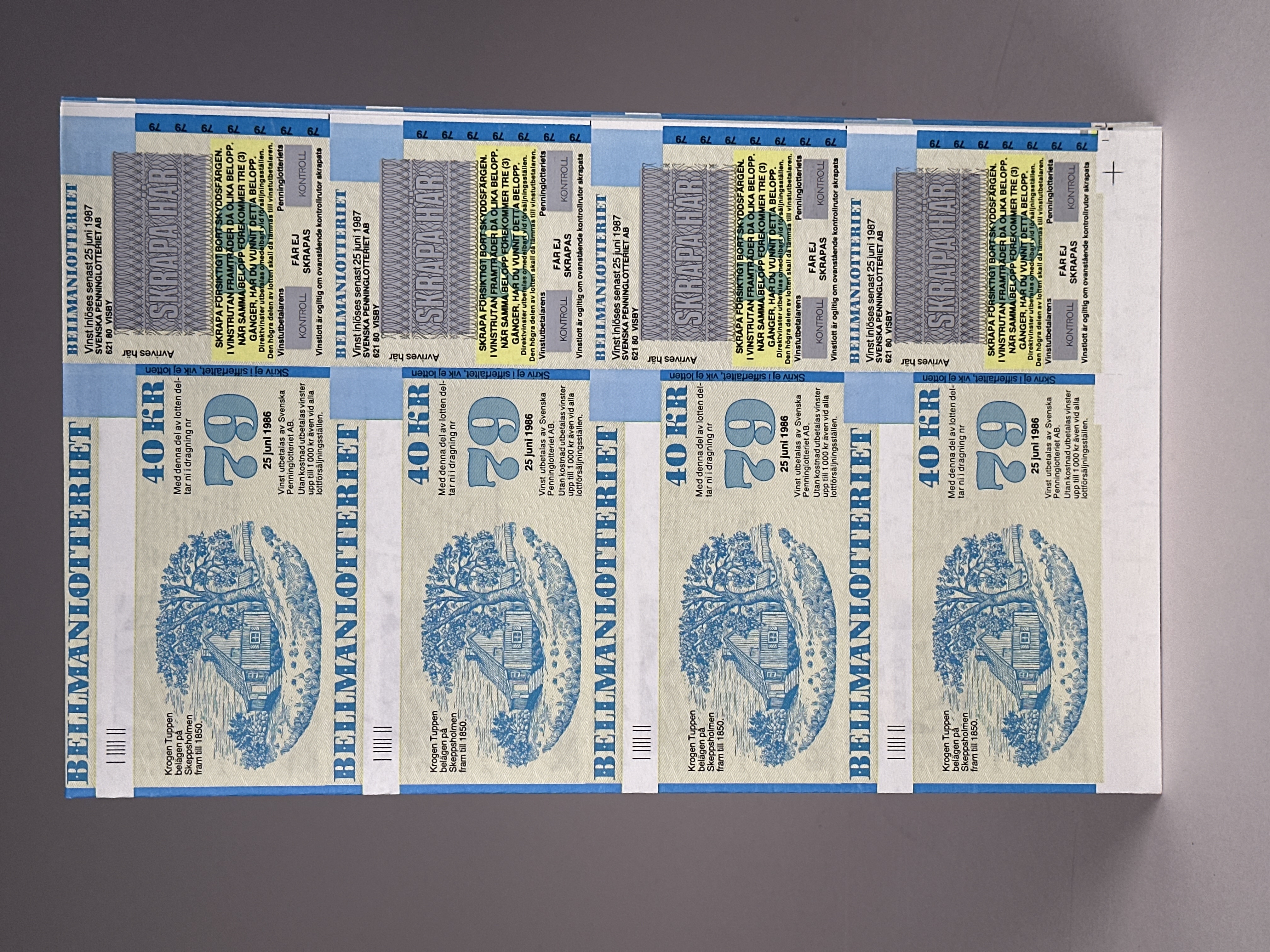 Provark med plats för 28 lotter, vikt. Pris 40 kronor. 79:e dragning, 25:e juni 1986. Lottens vinstplan presenteras på baksidan av lotten. Motiv: Krogen Tuppen Färger: turkos/blå, gul, grå, svart Märkning: området i det övre högra hörnet är överstruket och markerat med ordet "specimen", även märkt "X".