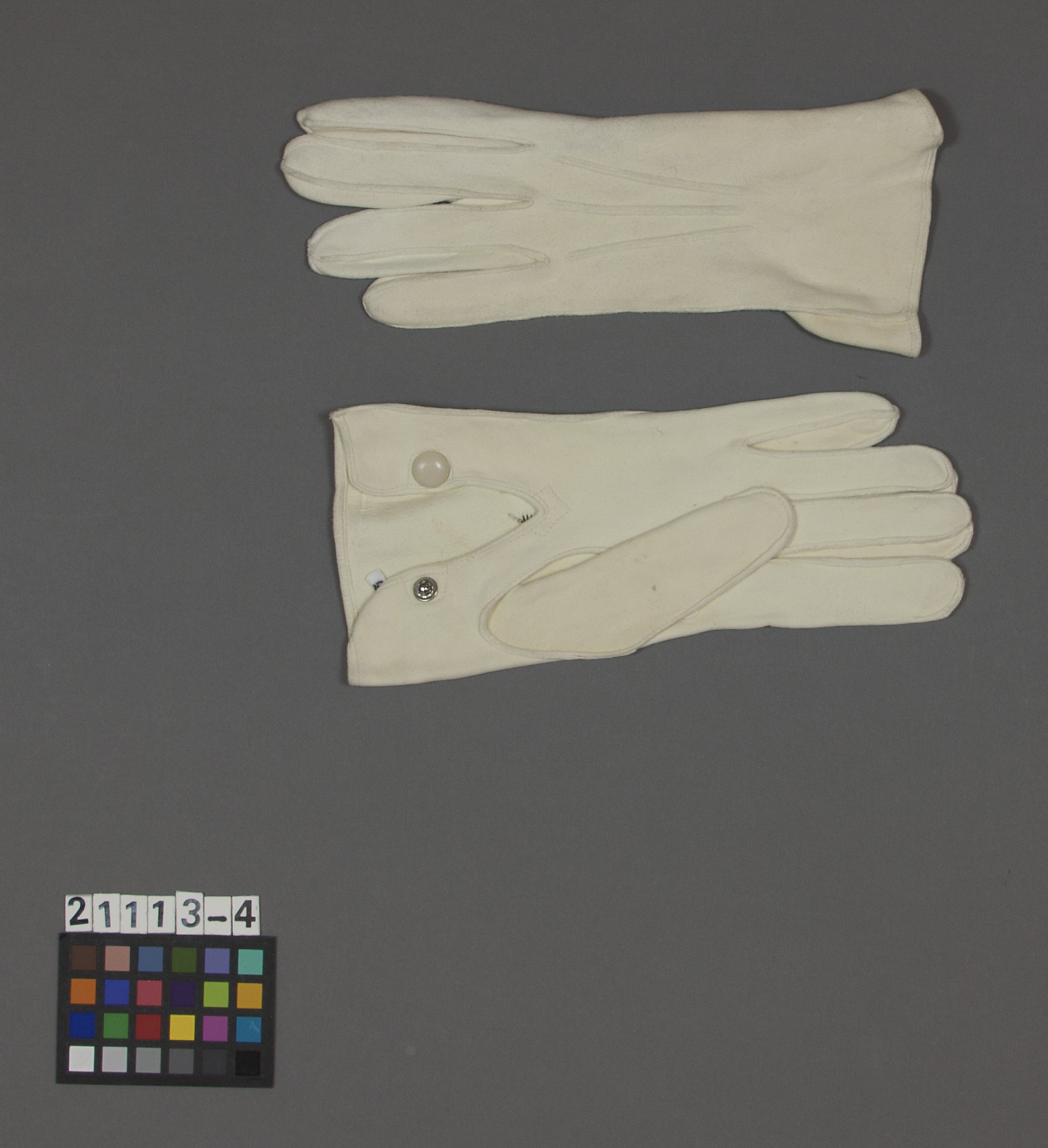 Vänsterhandske av ljusgult sämskat skinn med sömm längs ena sidan. Sprund med knäppning vid handleden med en slät ljusgul tryckknapp med inristad text: "F.P.M. // Lund". På ovansidan tre parallella mönstersömmar. På insidan en svart stämpel med oläslig text.