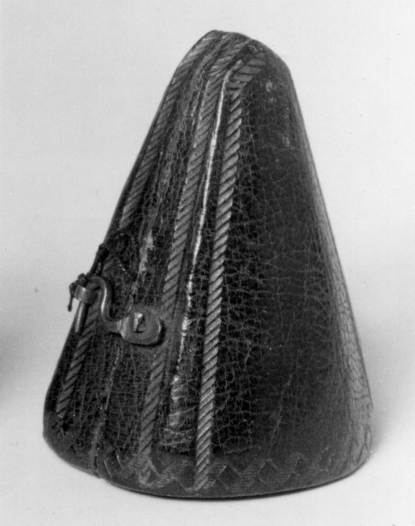 Koniskt etui av trä med oval bottenplatta. Utvändigt klätt med rött skinn. Dekor i guldpressning, guldet till största delen borta, repstavsbårder, längs nederkanten flätband av två sicksacklinjer. På undersidan pressat otydligt namnchiffer, möjligen LVRS. Ursprungligen stängning med hake, haken saknas, ring av mässing. Invändigt klätt med ljusblå sammet, urtag i båda halvorna för signetet.