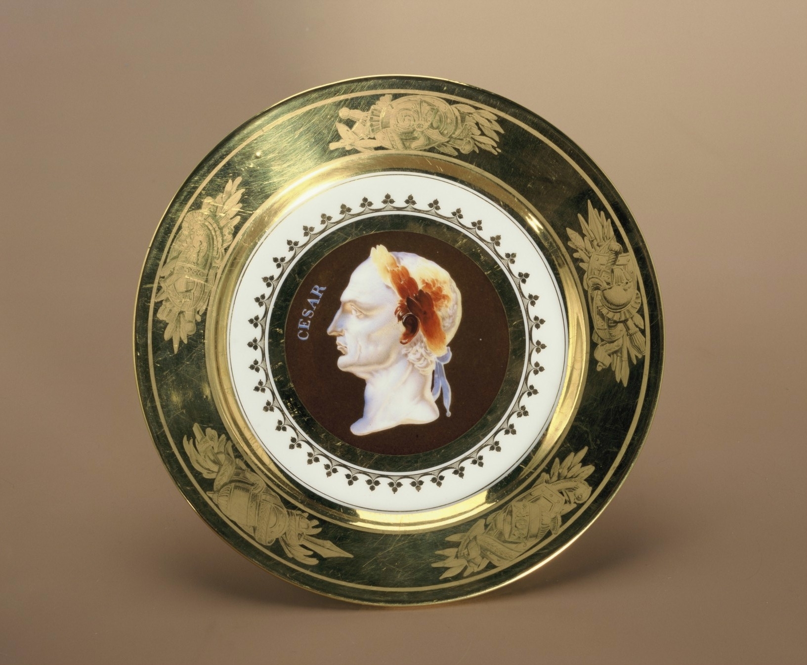 Rund, flat tallrik med kälformig kep och snett utstående, rakt brätte samt på fotkant. Dekor: i mitten en profilbild av Julius Caesars huvud, målad som kamé i ljust gråblått samt ljust och mörkt brunt mot mörkbrun botten. I en krans på kepen i matt guld mot blankt fem trofégrupper. Dessa två (tillsammans med in nr IV:F.a.01) tallrikar tillhör en serie som avbildar Romerska kejsare från Caesar och framåt. Pris: 138 Kr. Tre bröder med efternamnet Darte grundade tillsammans en porslinsmanufaktur vid rue de Charonne i Paris 1795. Samarbetet upphörde 1804 varefter en broder installerade sig vid rue de Popincourt och de två andra bröderna inte långt därifrån, vid rue de la Roquette. Verksamheten där pågick till omkring 1828 då företaget gjorde konkurs.