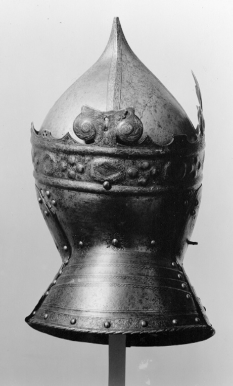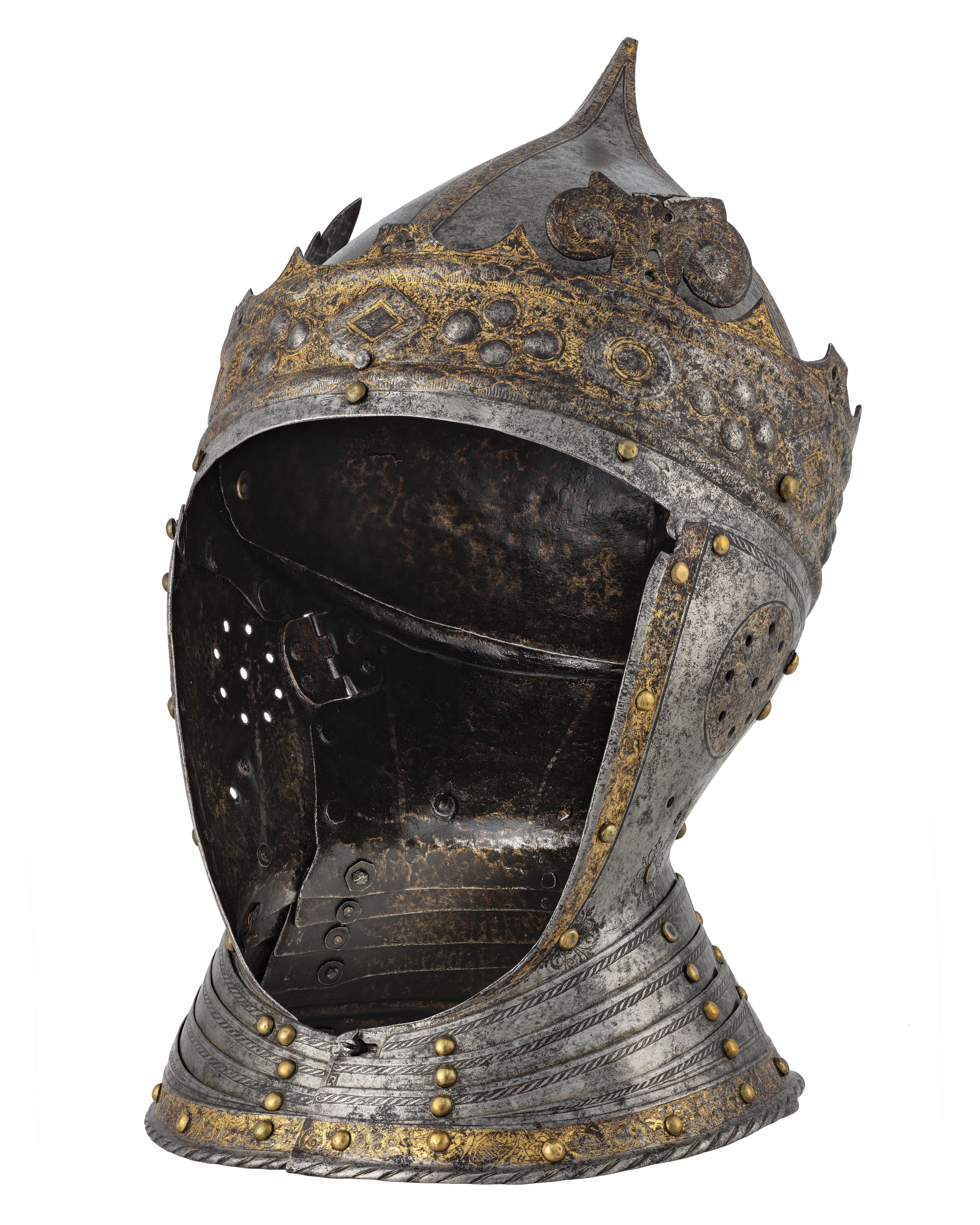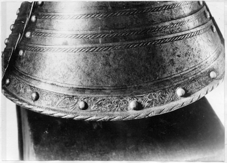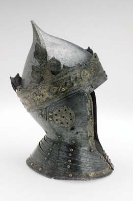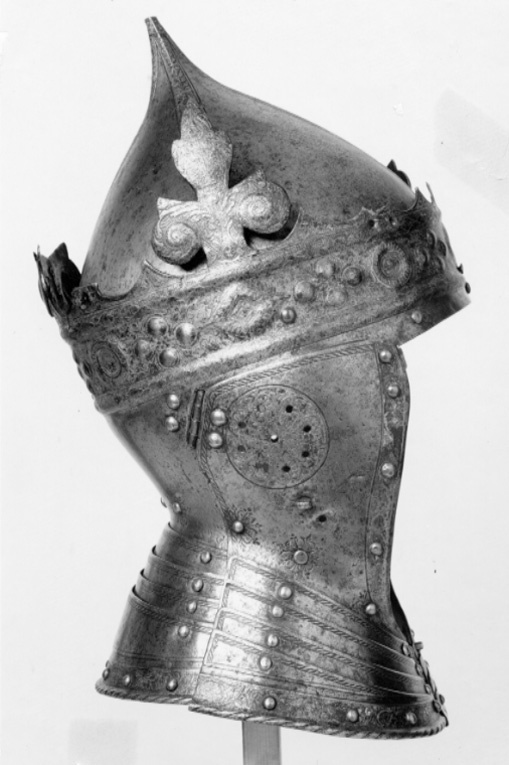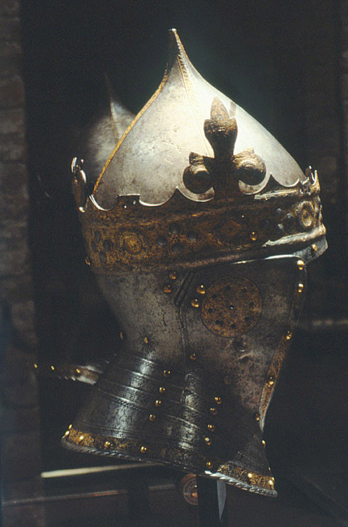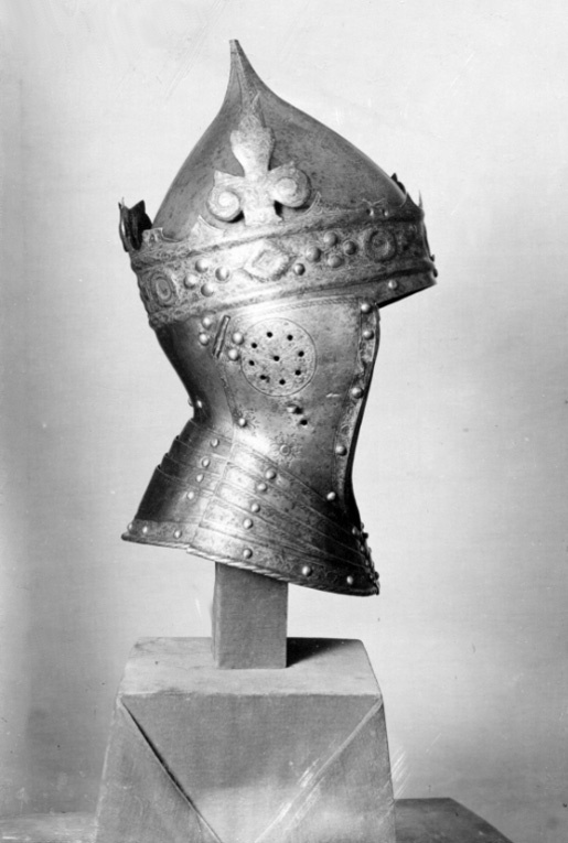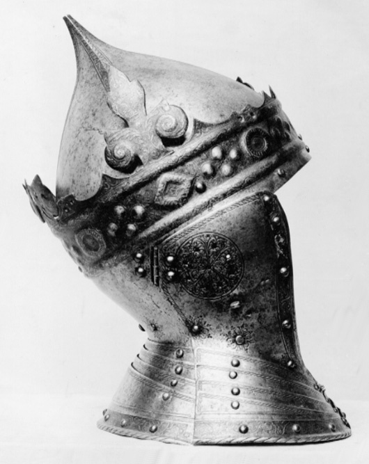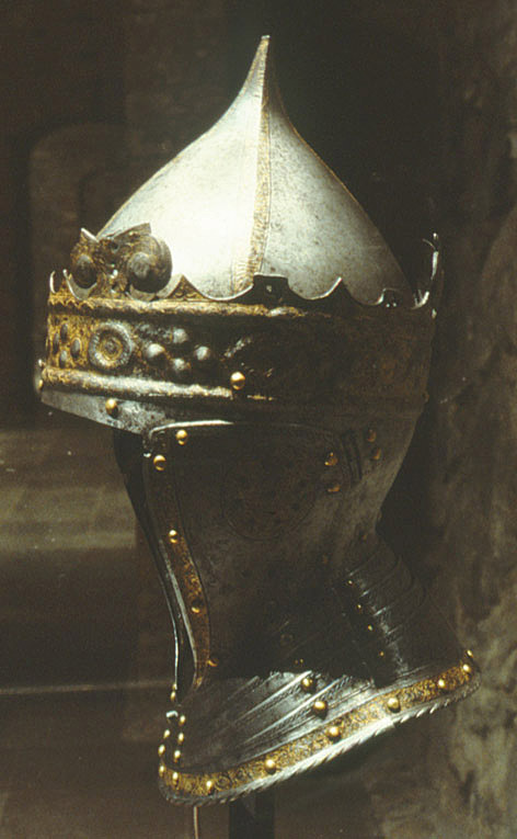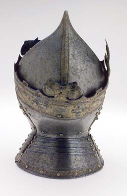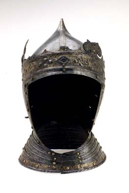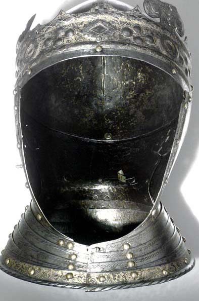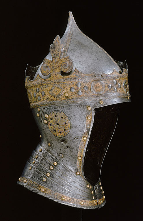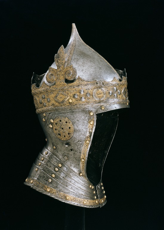 Gustav Vasas hjälm. Krönt hjälm, möjligen tillverkad av Kunz Lochner i Nürnberg cirka 1540, levererad i garnityr.