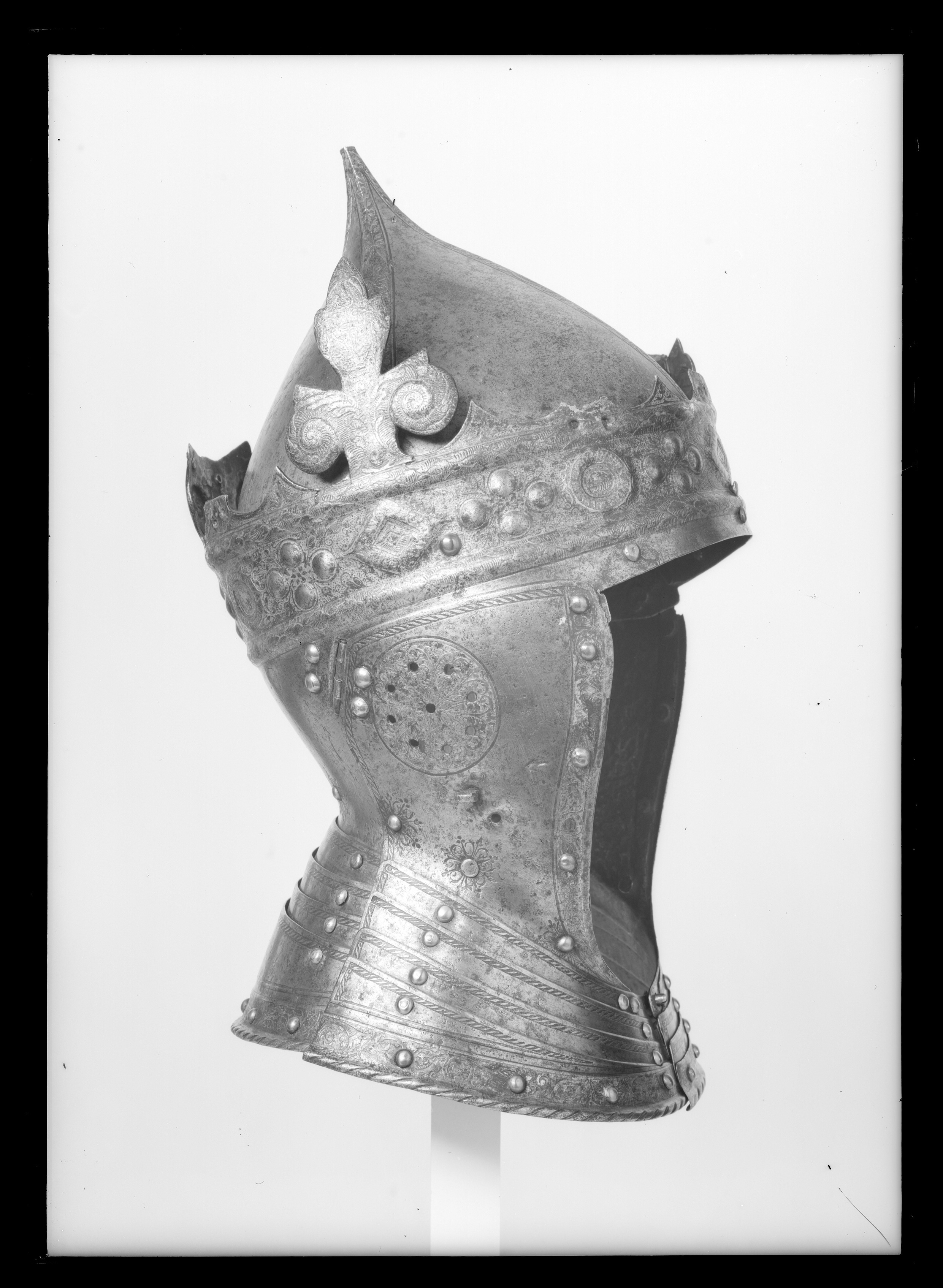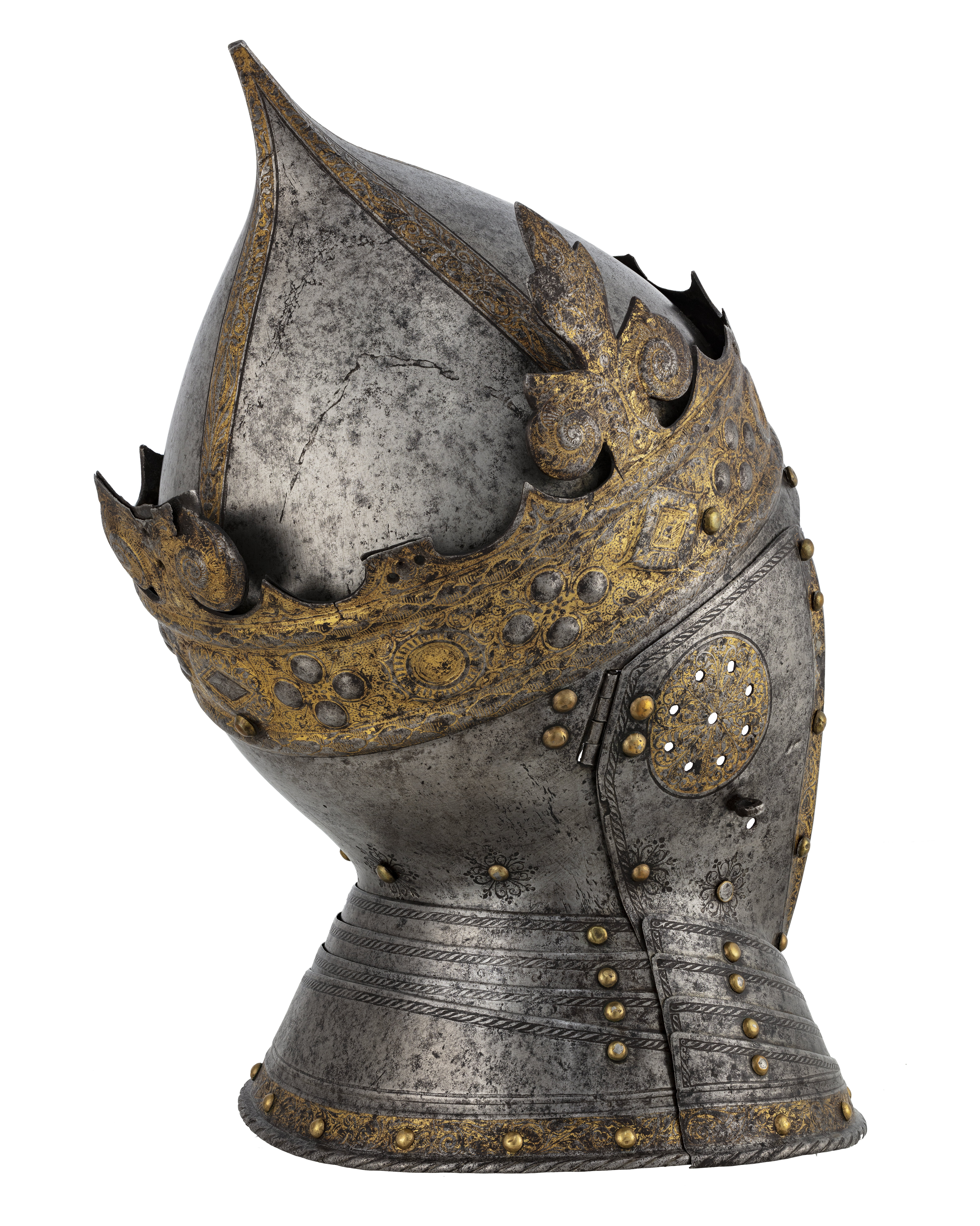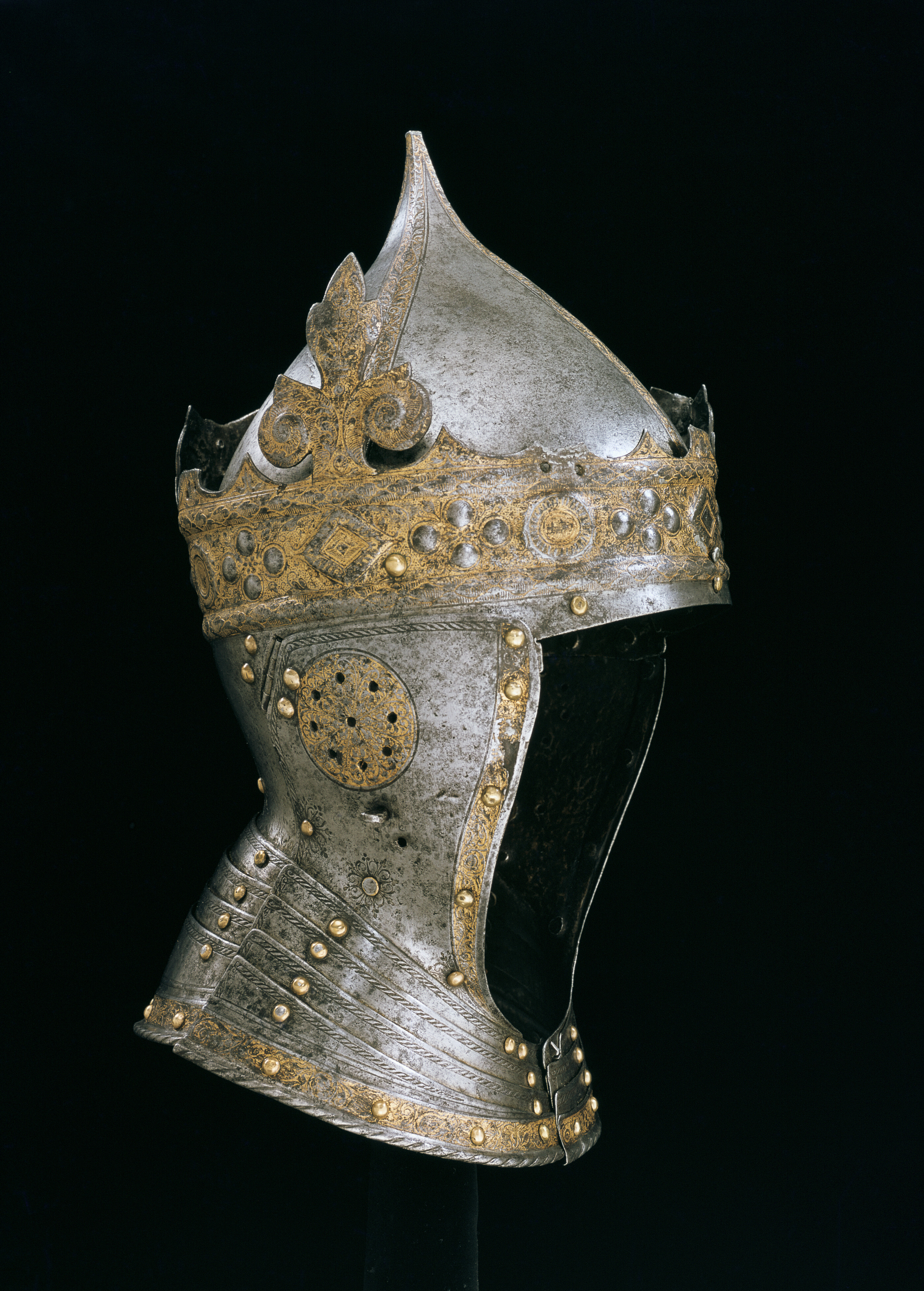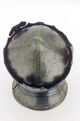 Hjälm smidd i fyra delar förutom halsskenorna. Klocka uppdriven i en hög spets, fyra åsade dekorband med etsad och förgylld rankdekor. Klockan är fäst innanför kronringen med tre nitar, en bak och en vid vardera sidan. Kronring-nackstycke i ett stycke. Kronan är öppen, ursprungligen med 8 drivna klöverblad med sidoblad i form av voluter och toppbladet i tre flikar. Endast ett helt blad återstår vid h. sida, två halva återstår, ett framtill till v och ett bak. Övrigablad är avbrutna vid skaften. Kronring med omväxlande rombiska och runda stenar samt däremellan fyra korsformigt placerade, i låg relief uppdrivna, oförgyllda pärlor. Ringen är upptill och nertill avgränsad av välvda bladstavar. Kronan är i övrigt helt täckt av etsad och förgylld rankdekor. På nackstycket vid halsen mässingsnitar, omgivna av ett symmetriskt rankmönster. Kronan placerad något snett ner mot h. öra. Kindstycken fästade med gångjärn vid örat, fyra mässingsnitar, två på kindstyckena och två på nackstycket. Vid halsen mässingsnitar med rankdekor som på nackstycket. Intill gångjärnens nitar ett runt fält, genombrutet av nio små, runda hål, etsad och förgylld rankdekor. Därnedanför på h. sida en stålögla och på v. sida två hål för fästning av nu förkommet visir. Längs över- och bakkanten enkel repstavsdekor, längs framkanten en etsad, svagt skålad, förgylld rankbård och däri fyra nitar med mässingsskållor (övre niten på v. sida placerad utanför bården). Halsskenor i form av 3x4 lameller, framtill låsta med vridregel. Etsad dekor i form av repstav längs överkanterna, längs nederkanten en etsad och förgylld rankbård med inflikade, olikformade sköldar. Välvd nederkant i form av repstav. Lamellerna förenade med nitar med mässingsskållor, samtliga intakta förutom en upptill på v. sida. Gustav Vasas hjälm är prydd av en gyllene krona - symbolen för hans kungliga makt. Bevarade krönta hjälmar är mycket ovanliga. Hjälmen finns upptagen i Klädkammarinventariet 1548 och skänktes 1557 av kungen till hertig Johan (III). År 1560 fördes den troligen i Gustav Vasas begravningsprocession. Enligt ett tyskt vittne kom där "Nachdem ein ander Rutter, Gabriel person, der hat gefuret der Kon. Mait schilt vnnd helm mit einer gulden krone auff dem helm" - därefter kom ännu en ryttare, Gabriel Persson, som förde Kungl. Maj:t sköld och hjälm med en gyllene krona. Utdrag ur Klädkammarinventariet från den 29 oktober 1548: "Register på harnisk som Klas Heijser haffuer fört i landhät", tillsammans med: "ett blanckt köris mz en gelidher geäst och förgylt" (Livrustkammaren inv nr 26700-26714). "Noch ett höftt harnisk, mz en krona, geäst och förgylt". Skänkt till "min nådige Herre Hertug Johan then 11 augusti" enligt marginalanteckning i Klädkammarinventariet 1557.