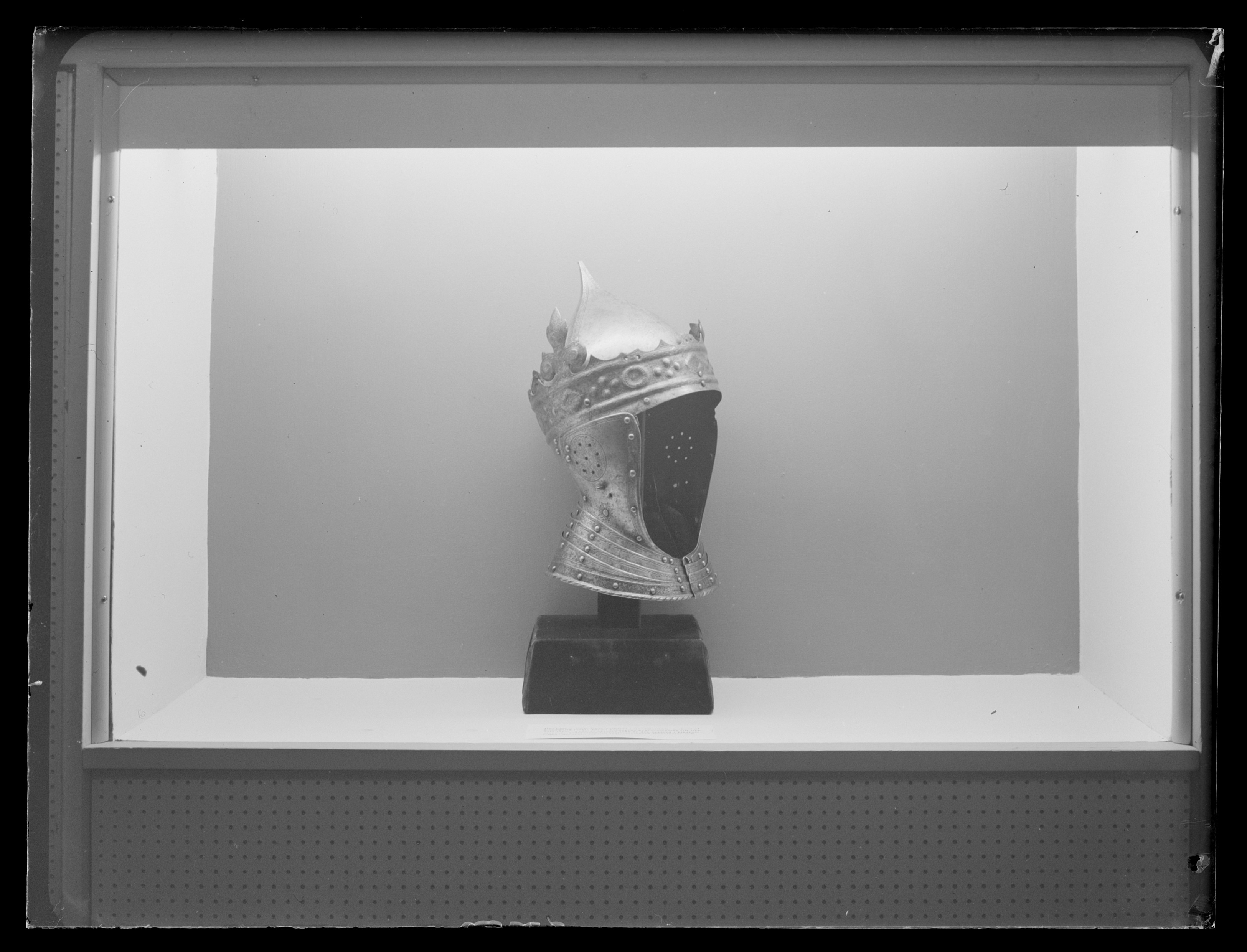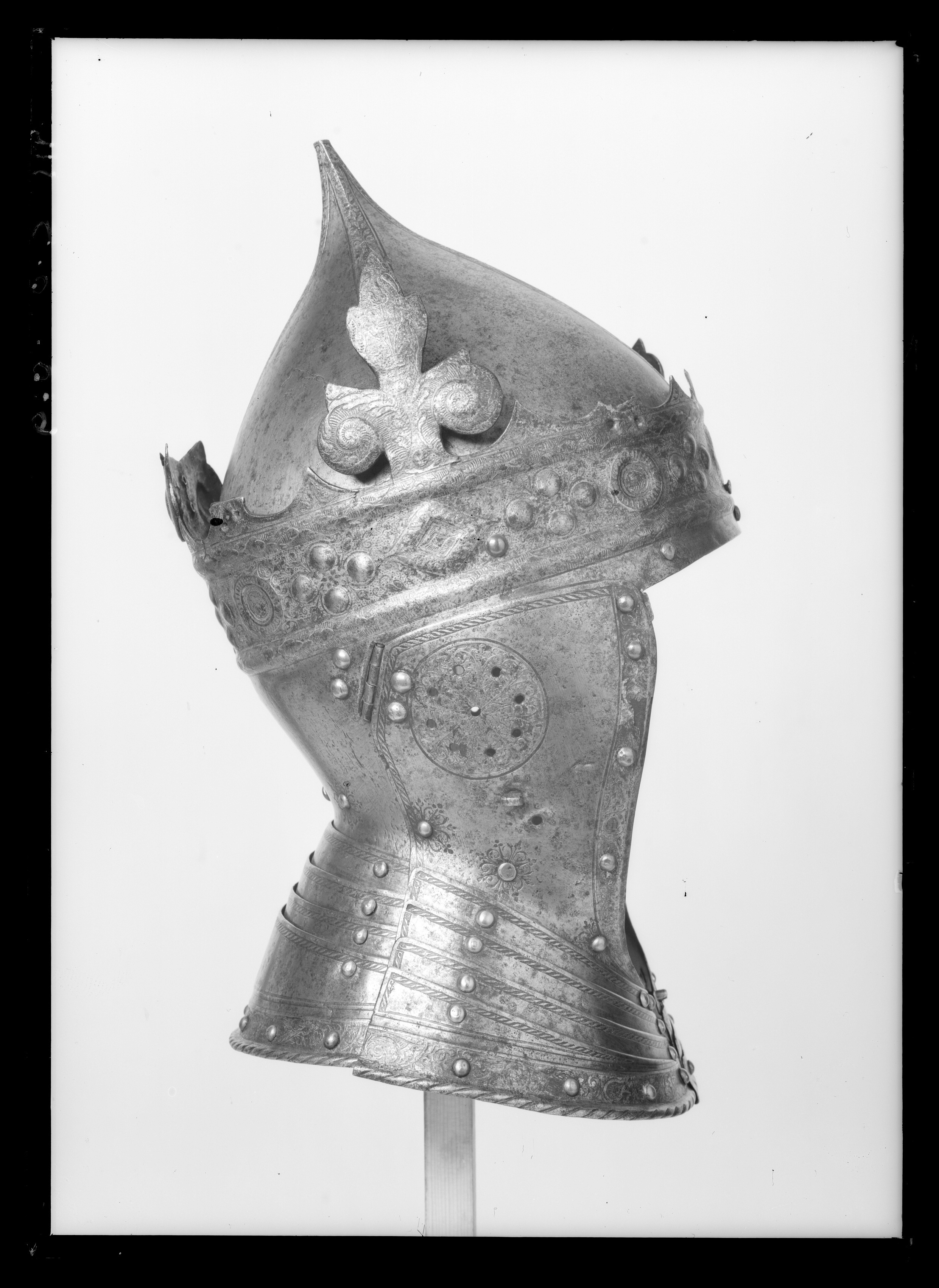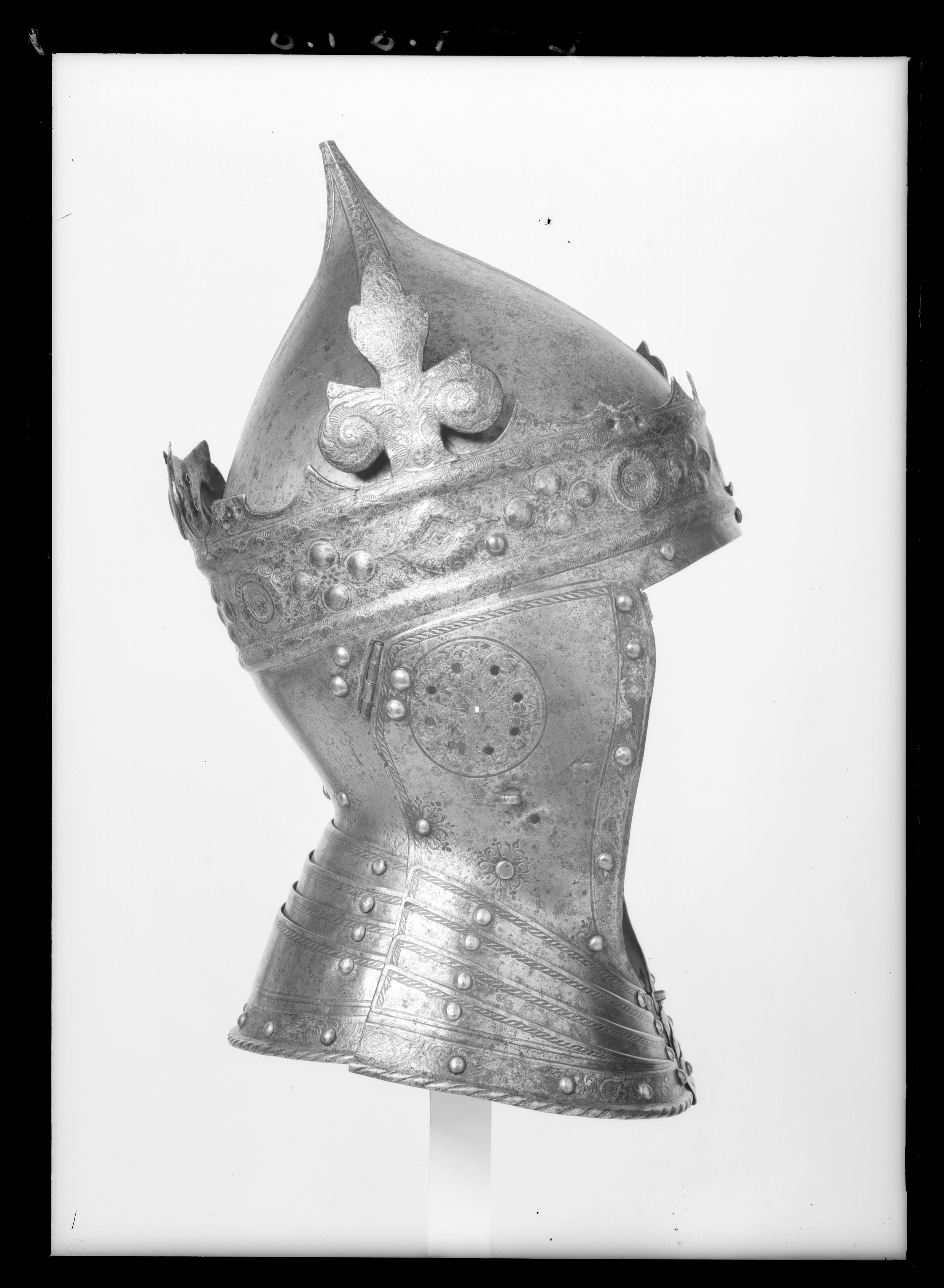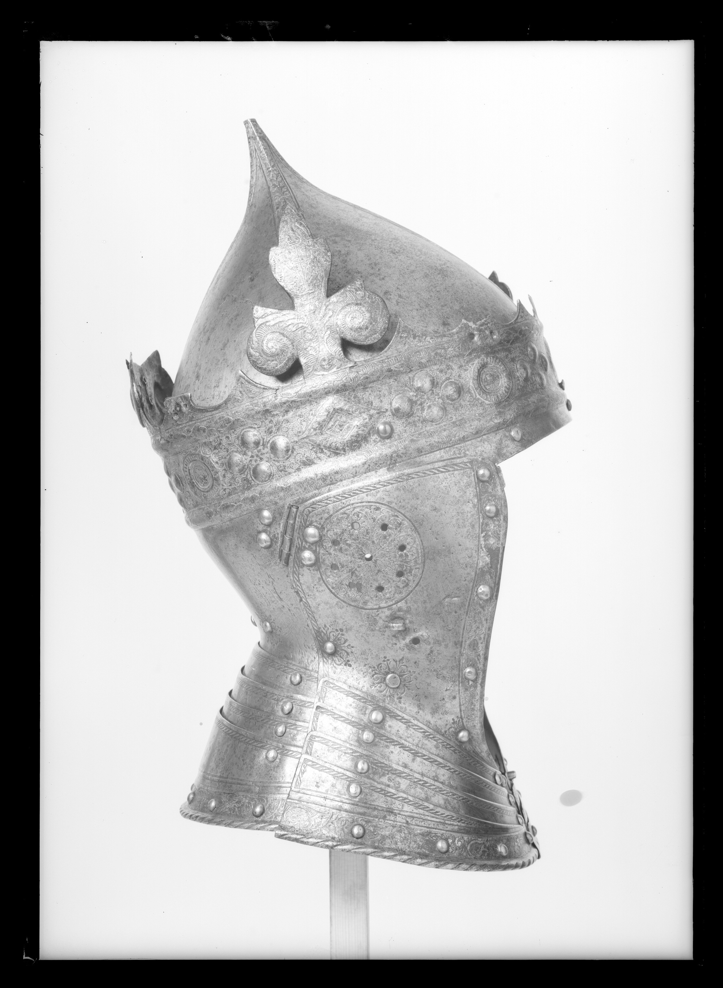 Hjälm smidd i fyra delar förutom halsskenorna. Klocka uppdriven i en hög spets, fyra åsade dekorband med etsad och förgylld rankdekor. Klockan är fäst innanför kronringen med tre nitar, en bak och en vid vardera sidan. Kronring-nackstycke i ett stycke. Kronan är öppen, ursprungligen med 8 drivna klöverblad med sidoblad i form av voluter och toppbladet i tre flikar. Endast ett helt blad återstår vid h. sida, två halva återstår, ett framtill till v och ett bak. Övrigablad är avbrutna vid skaften. Kronring med omväxlande rombiska och runda stenar samt däremellan fyra korsformigt placerade, i låg relief uppdrivna, oförgyllda pärlor. Ringen är upptill och nertill avgränsad av välvda bladstavar. Kronan är i övrigt helt täckt av etsad och förgylld rankdekor. På nackstycket vid halsen mässingsnitar, omgivna av ett symmetriskt rankmönster. Kronan placerad något snett ner mot h. öra. Kindstycken fästade med gångjärn vid örat, fyra mässingsnitar, två på kindstyckena och två på nackstycket. Vid halsen mässingsnitar med rankdekor som på nackstycket. Intill gångjärnens nitar ett runt fält, genombrutet av nio små, runda hål, etsad och förgylld rankdekor. Därnedanför på h. sida en stålögla och på v. sida två hål för fästning av nu förkommet visir. Längs över- och bakkanten enkel repstavsdekor, längs framkanten en etsad, svagt skålad, förgylld rankbård och däri fyra nitar med mässingsskållor (övre niten på v. sida placerad utanför bården). Halsskenor i form av 3x4 lameller, framtill låsta med vridregel. Etsad dekor i form av repstav längs överkanterna, längs nederkanten en etsad och förgylld rankbård med inflikade, olikformade sköldar. Välvd nederkant i form av repstav. Lamellerna förenade med nitar med mässingsskållor, samtliga intakta förutom en upptill på v. sida. Gustav Vasas hjälm är prydd av en gyllene krona - symbolen för hans kungliga makt. Bevarade krönta hjälmar är mycket ovanliga. Hjälmen finns upptagen i Klädkammarinventariet 1548 och skänktes 1557 av kungen till hertig Johan (III). År 1560 fördes den troligen i Gustav Vasas begravningsprocession. Enligt ett tyskt vittne kom där "Nachdem ein ander Rutter, Gabriel person, der hat gefuret der Kon. Mait schilt vnnd helm mit einer gulden krone auff dem helm" - därefter kom ännu en ryttare, Gabriel Persson, som förde Kungl. Maj:t sköld och hjälm med en gyllene krona. Utdrag ur Klädkammarinventariet från den 29 oktober 1548: "Register på harnisk som Klas Heijser haffuer fört i landhät", tillsammans med: "ett blanckt köris mz en gelidher geäst och förgylt" (Livrustkammaren inv nr 26700-26714). "Noch ett höftt harnisk, mz en krona, geäst och förgylt". Skänkt till "min nådige Herre Hertug Johan then 11 augusti" enligt marginalanteckning i Klädkammarinventariet 1557.