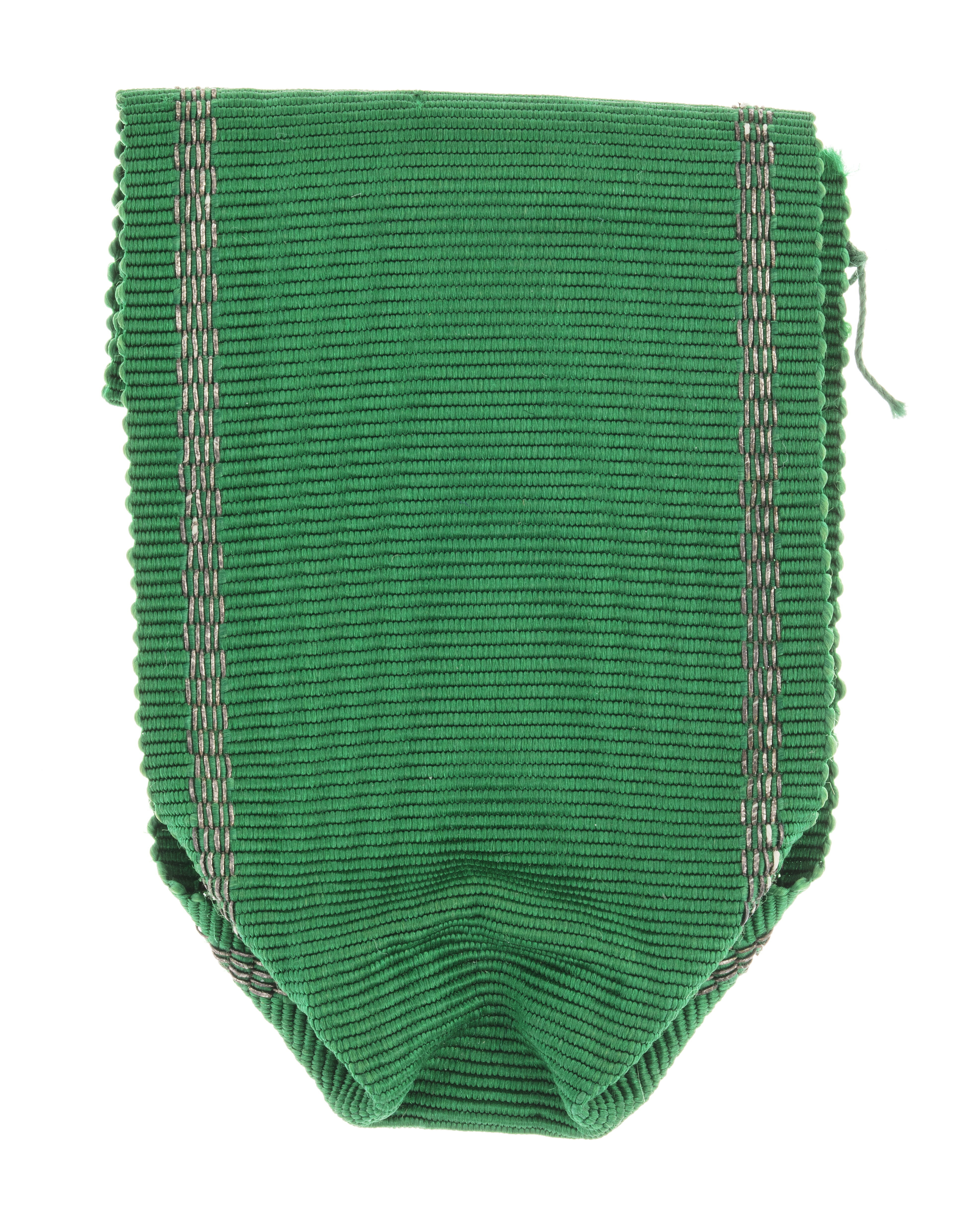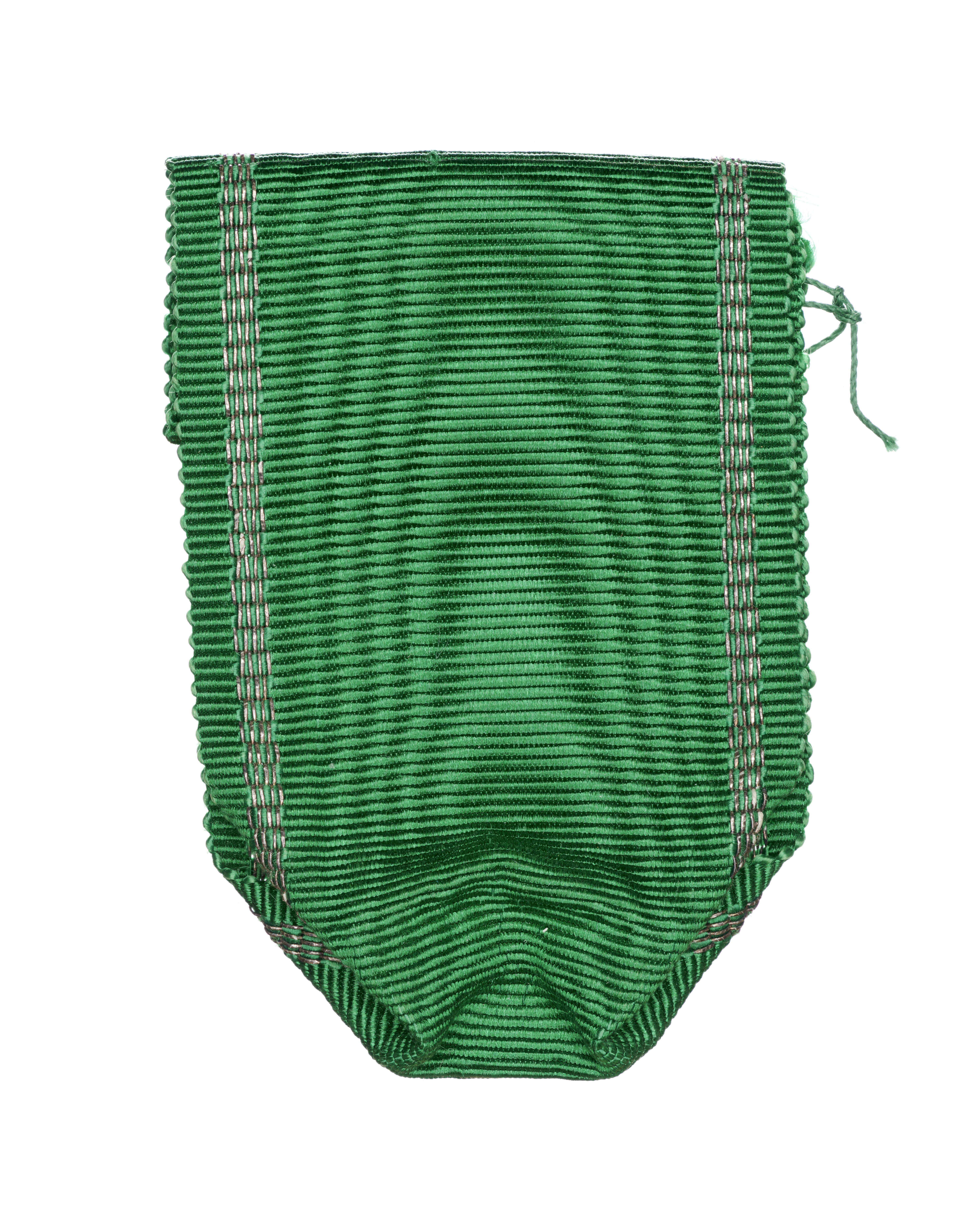 Omonterat bröstband av smaragdgrön, sidenmoaré med 2 mm breda kantränder av invävd silertråd, 3 mm från kanten.