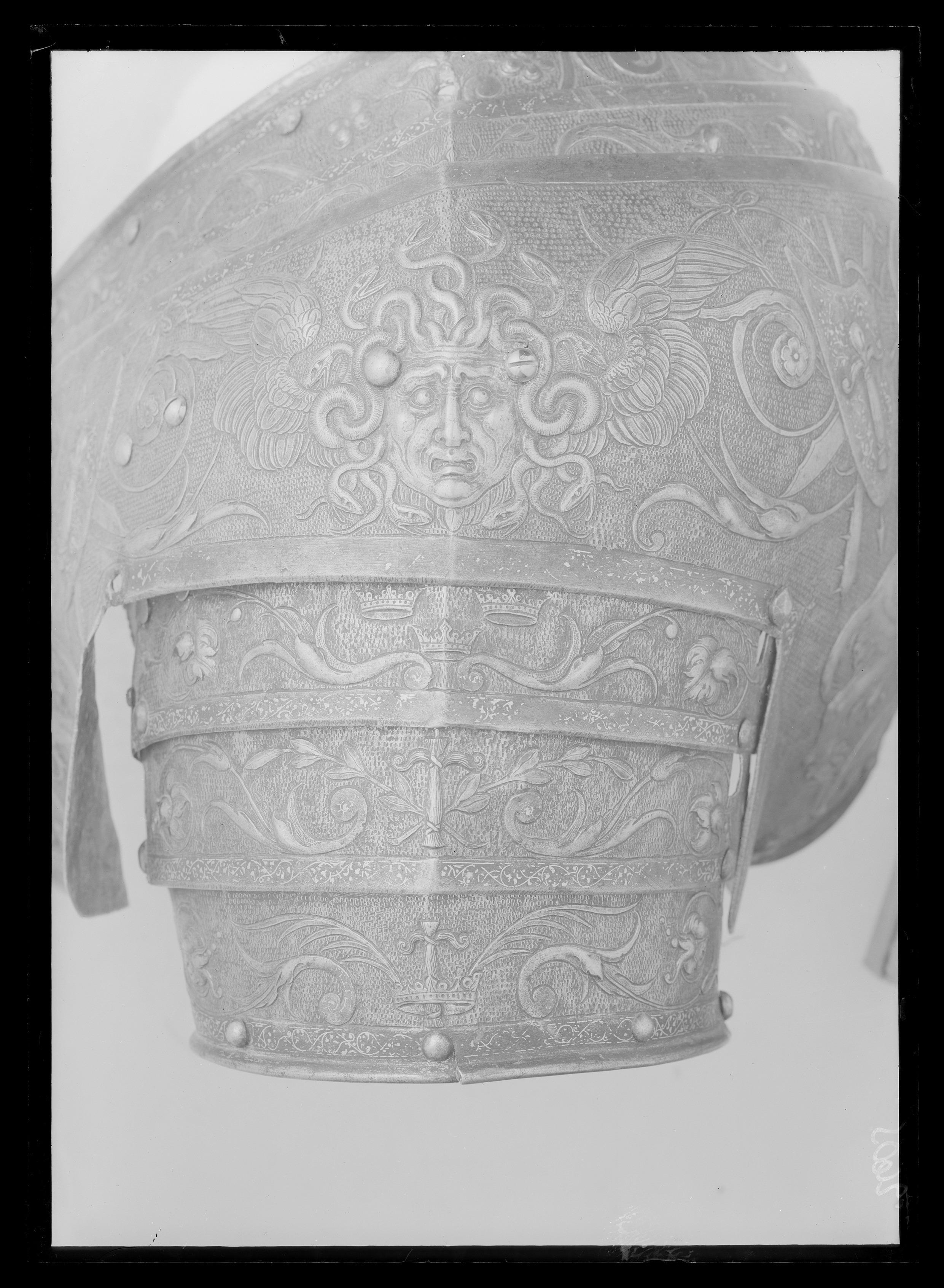 Axelpansar med extraordinär dekor. Krönta lejon, sköldar med Vasakärven mm. Axelpartiet består av tre stora lameller och tre mindre där ärmen börjar.