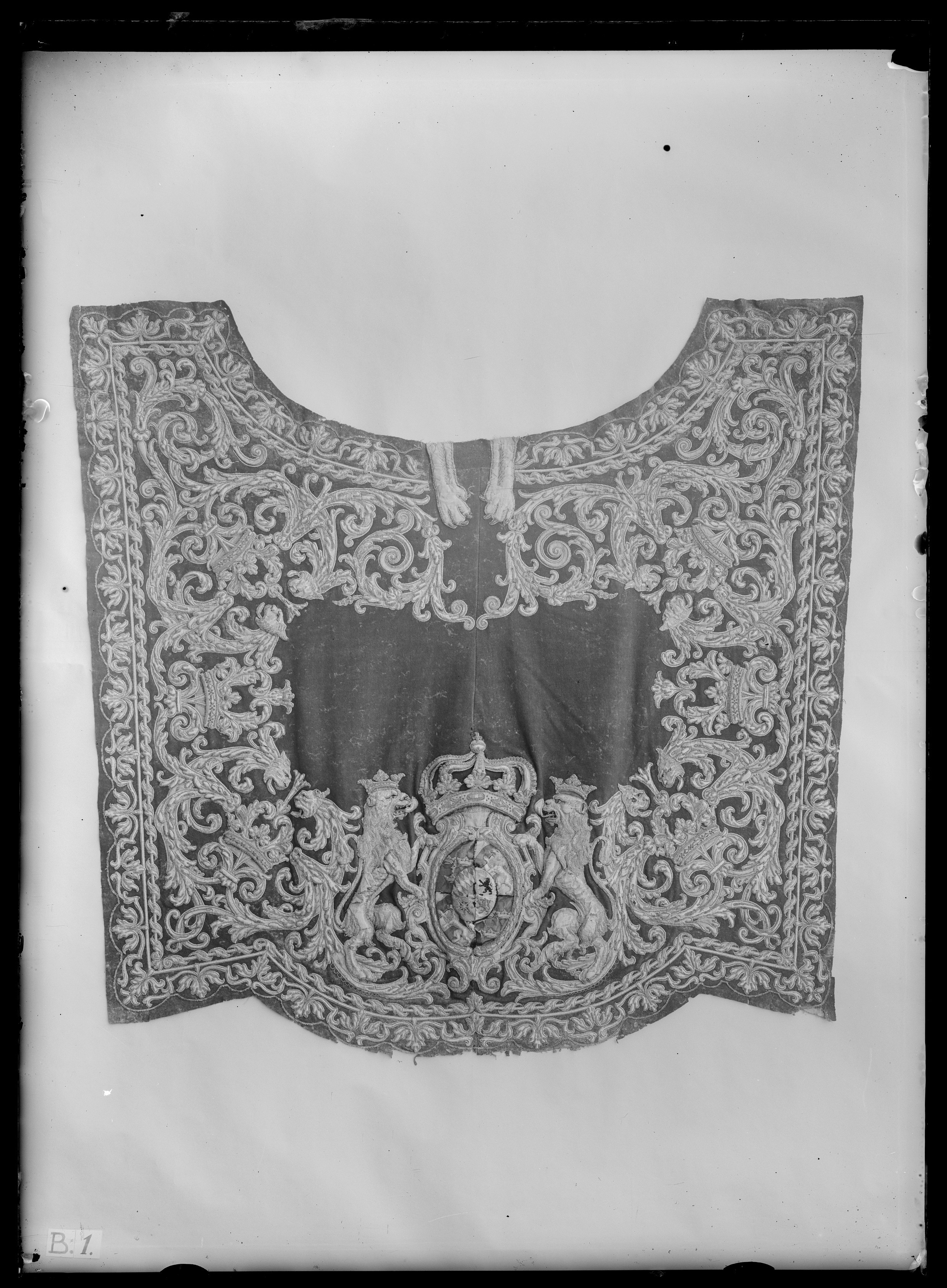 Täcke av blått kläde med applikationer av kläde i flera färger, huvudsakligen gult och vitt. Samma typ som nr 4061 men skiljer sig från detta i följande avseenden: Ingen kil framtill. De sköldhållande lejonen har silvertänder. Istället för lejonmaskaron framtill två lejontassar av ljust gulbrunt siden med klor av silvertråd i reliefsöm. Inga monogram på långsidorna, i rankverket inflätade öppna kronor, en i varje hörn samt en på vardera långsida. Kantning saknas. Underlag av oblekt linnelärft. På baksidan nedanför inskärningen framtill sitter en vågrät rad av sex vita skinntränsar från sen tid med ringar av gulmetall. I vart och ett av sidostyckena sitter en linneträns.
