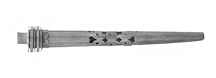 Blånad, konisk med oval genomskärning, å framsidan fyra längdgående kälar, mellan dessa och vid sidorna en bård av våglinjer och smala ränder.