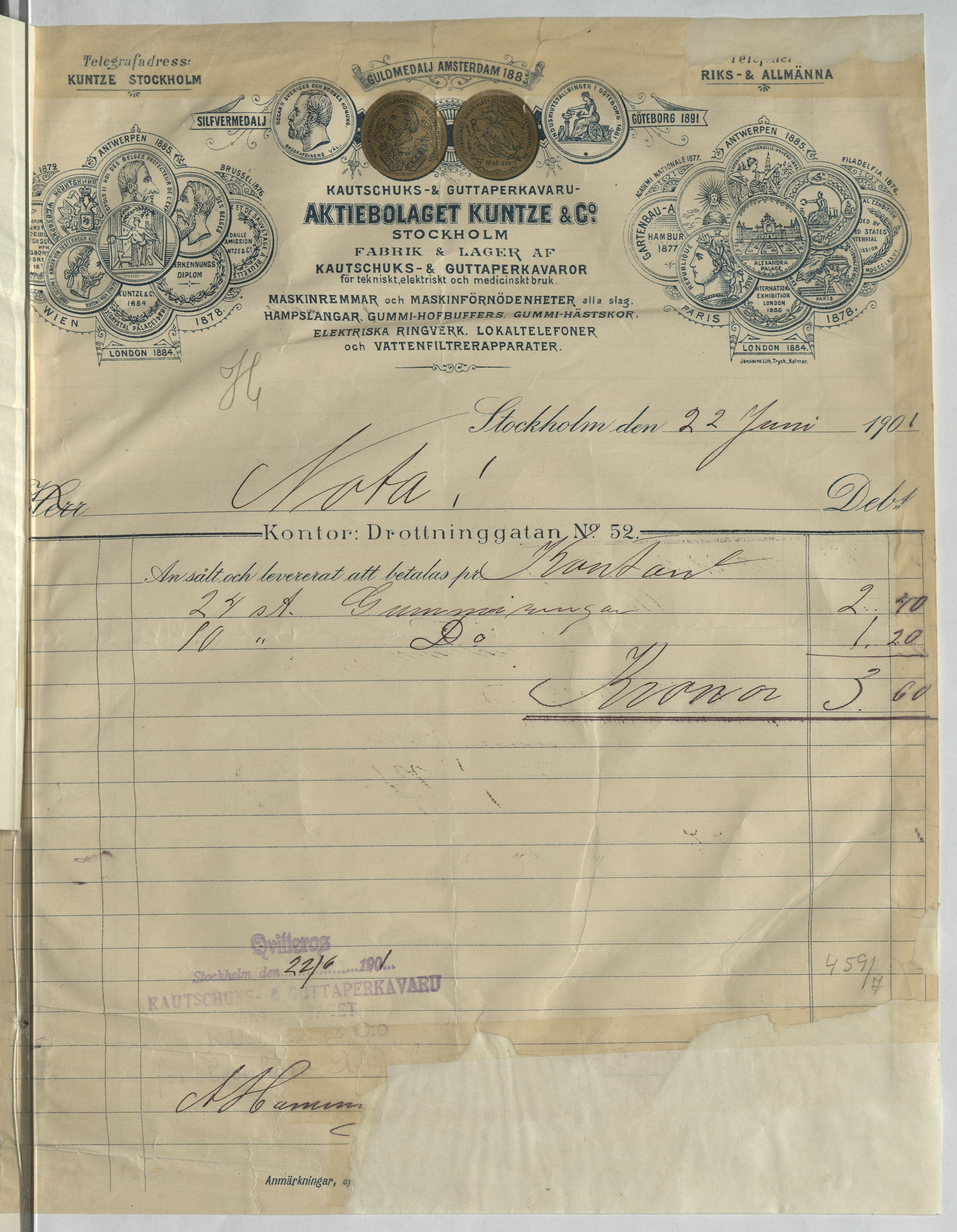 Kvitto från Kautschuks- & Guttaperkavaru-Aktiebolaget Kuntze & Co. Gällande 34 stycken gummeringar. Stockholm, 1901.