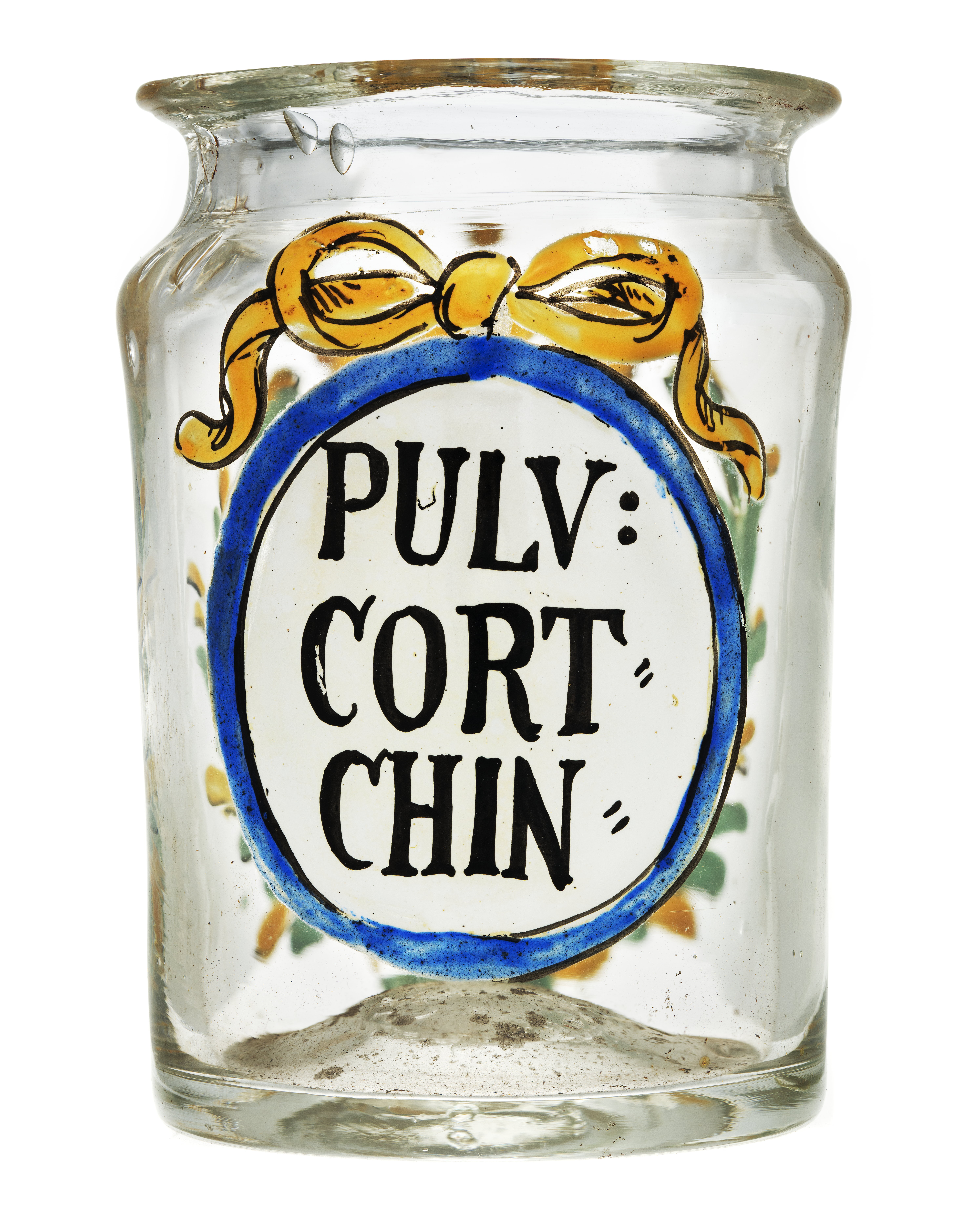 Tillhört Fredrik I, Sverige 1720-1751. Rund glasburk, svagt vidgad uppåt med något smalare hals med utsvängd kant för överbindning. Dekor i emaljmålning, på ena sidan en vit sköld, krönt av öppen krona i gult och rött, i skölden Fredrik I:s namnchiffer, spegelmonogram F (svart) krönt av en kunglig krona och omgivet av de tre svenska kronorna, allt i guld. Runt skölden en lagerkrans i grönt och guld. På motsatt sida en vit textoval med blå kant, upptill prydd med en gul rosett. I ovalen svart, latinsk text: "PULV: CORT:CHIN" (pulvriserad kinabark - medel mot frossa mm).