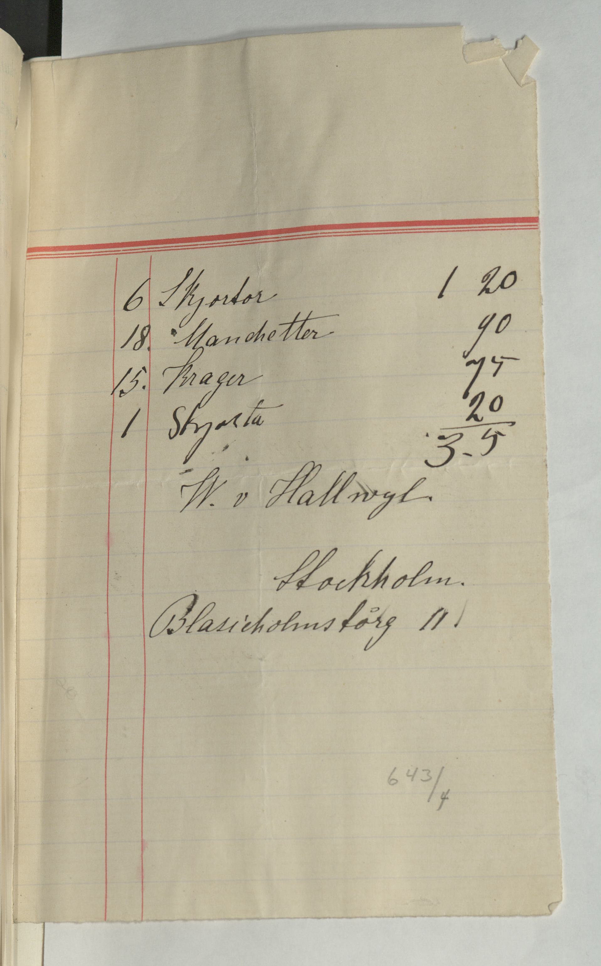 Kvitto från Fru Pettersson, Skjorttvätt, för 6st skjortor, 18 manchetter och 15 kragar. 3:50Kr betald av Greve Hallwyl. Odat.