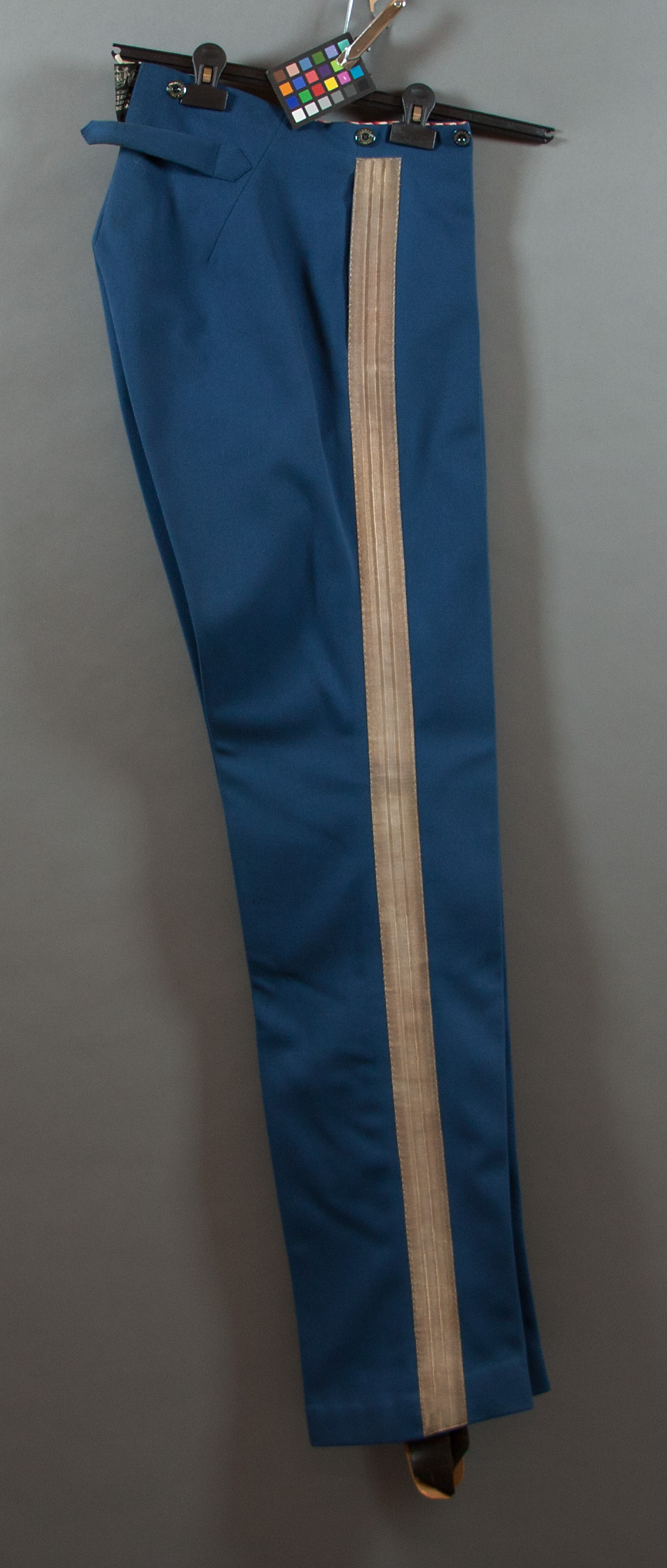 Långbyxor av mellanblått kläde, knäppta med gylf med fyra knappar. I linningen sju knappar. Samtliga blånerade, d: 17 mm, och med text: "SOLIDE, NEUHEIT". I sömmen mitt bak v-format sprund med infällning av svart siden med firmamärke. "KONGL.HOFSKRÄDDAREN // FR. KAEDINGS // EFTERTRÄDARE // STOCKHOLM" därnedanför spänntampar med svart lackerad stålsölja med text: "FW&S". Fickor i sidsömmen, utmed denna en 40 mm bred silvergalon. Nedtill hälla av svart läder, 39 mm bred, knäppes under foten med liten mässingsknapp. Foder i linningen av röd-rosa randigt siden samt vitt siden. Fickor av vit bomull.