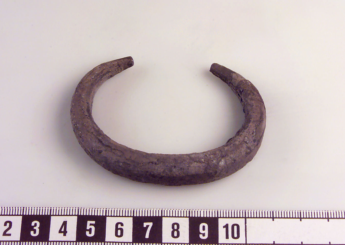 Rektangulärt tvärsnitt, avsmalnande i ändarna. Skadat ytskikt.