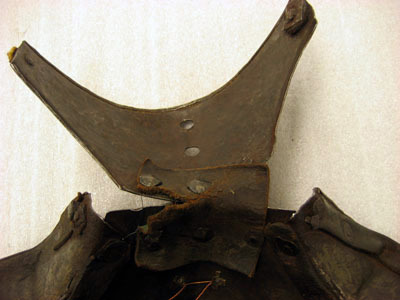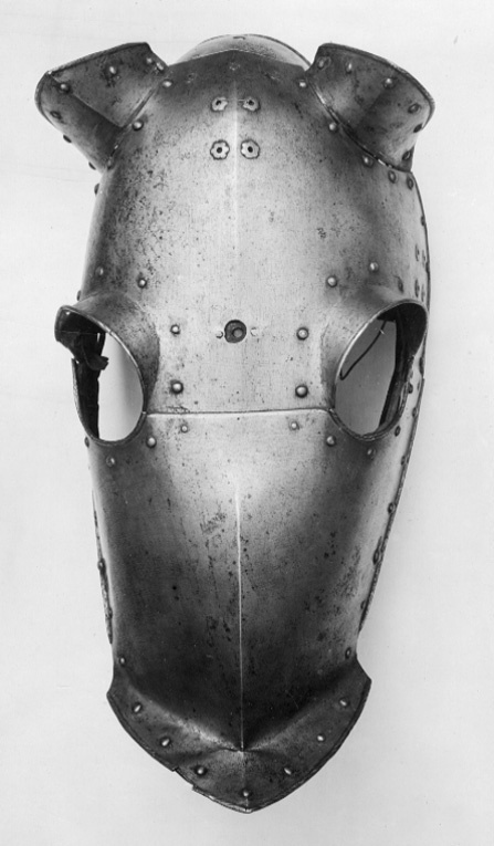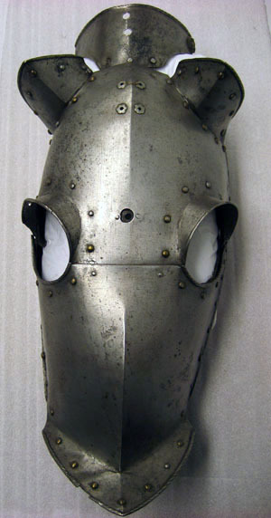 Driven stålplåt med blankslipad utsida. Sammanlagt fem delar sammanfogade med nitar. Pannplåt med driven längsgående mittås, mittpartiet plant. Övre kanten rundad. Rundade urtagningar för öronen med nitade plåtar, välvda med mittås och riktade uppåt och utåt, högre i framkant. Rundade urtagningar för ögonen med övre kanten driven till en skärm, bredast över mitten, 35 mm, med avsmalnande sidor. Tillsammans med urtagningar i undre stycket bildar dessa två hål för ögonen. Nertill över mulen en svagt utåt driven krage, b 55 mm, framtill välvd och spetsig. Alla yttre kanter omvikta, rundsmidda och med filade snedställda linjer. Längs kanterna nitar i rad med kullriga mässingsöverdragna skallar. Upptill över nacken en med läderband fäst plåt. Välvd med i främre kanterna rundade urtagningar. I bakre kant två hål i rad, diam 5 mm, och i var sida ett hål, diam 3 mm, det högre med rombisk plåt och rester av läderband. Vid varje kind och upptill mellan öronen fyra hål ställda i kvadrat med blomformig skoning, för plymhållare. I pannans mitt cirkulärt hål, diam 15 mm, med på insidan förstärkning av rektangulär plåtbit, för spets. Insidan svärtad med kantband av svärtat läder, b 16 mm. Vid kinderna i nederkant ett dubbelvikt läderband.