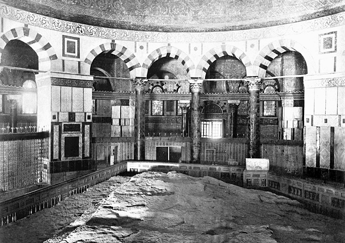 Interiör från Omarmoskén i Jerusalem. Text på originalet: "The Rock Moriah./Interieur de la Mosquée d'Omar. La Roche." Fotografierna LXVI:N.01.-180. kommer från resan till Palestina och Syrien som Wilhelmina och Walther von Hallwyl gjorde den 30 mars-27 april 1901. De lämnade Sverige den 5 november 1900 för Egypten, där de stannade till den 28 mars 1901, då de fortsatte till Palestina. Med på resan var Wilhelminas sällskapsdam, fröken Ida Uhse. Den 27 april fortsatte de till Turkiet och Mindre Asien. De mindre fotografierna (utom de från Samos) LXVI:N.90.-100. är tagna av Wilhelmina själv, under en resa till häst från Jerusalem till Damaskus 8-20 april 1901. Övriga fotografier är inköpta av Wilhelmina i Jerusalem, Damaskus och Beirut. Alla uppgifter kommer från Ida Uhses reseanteckningar.
