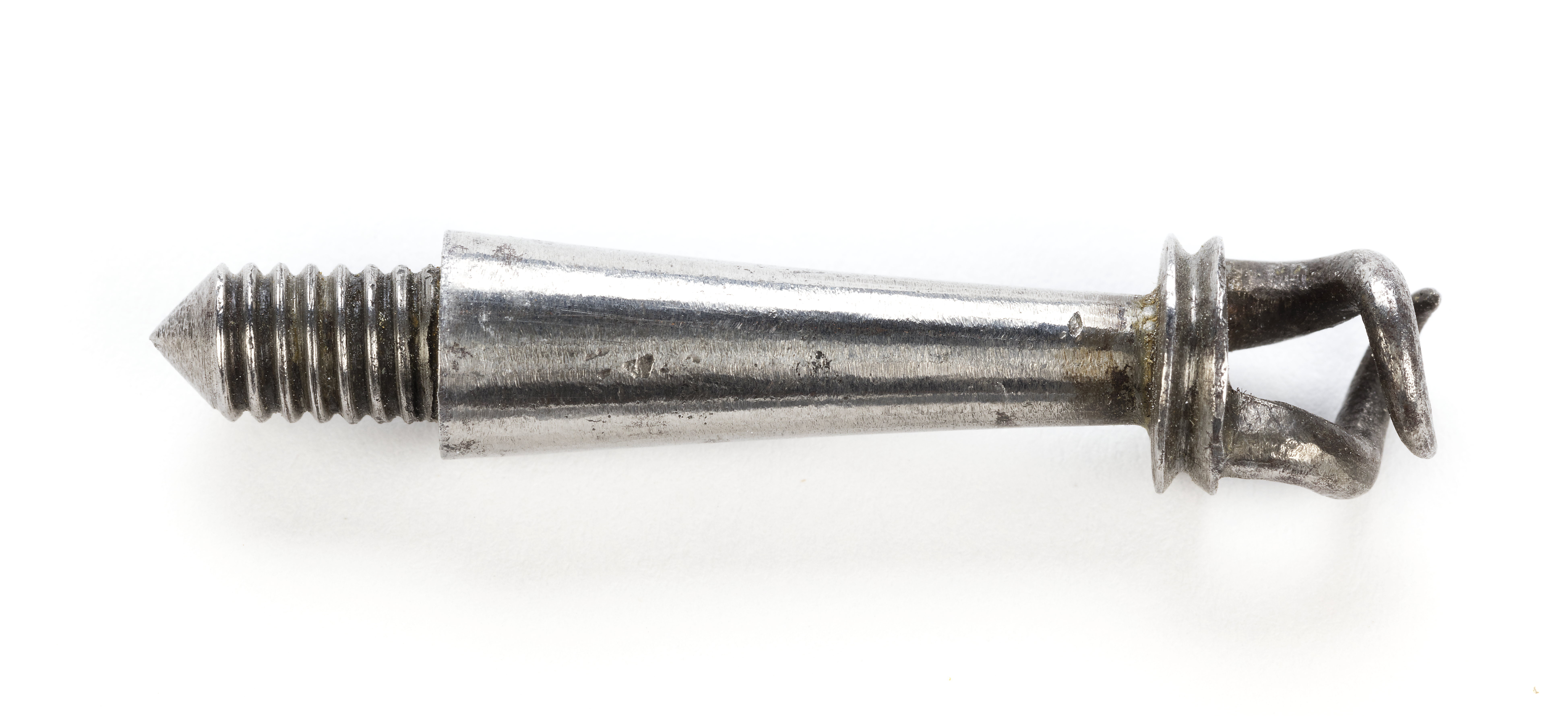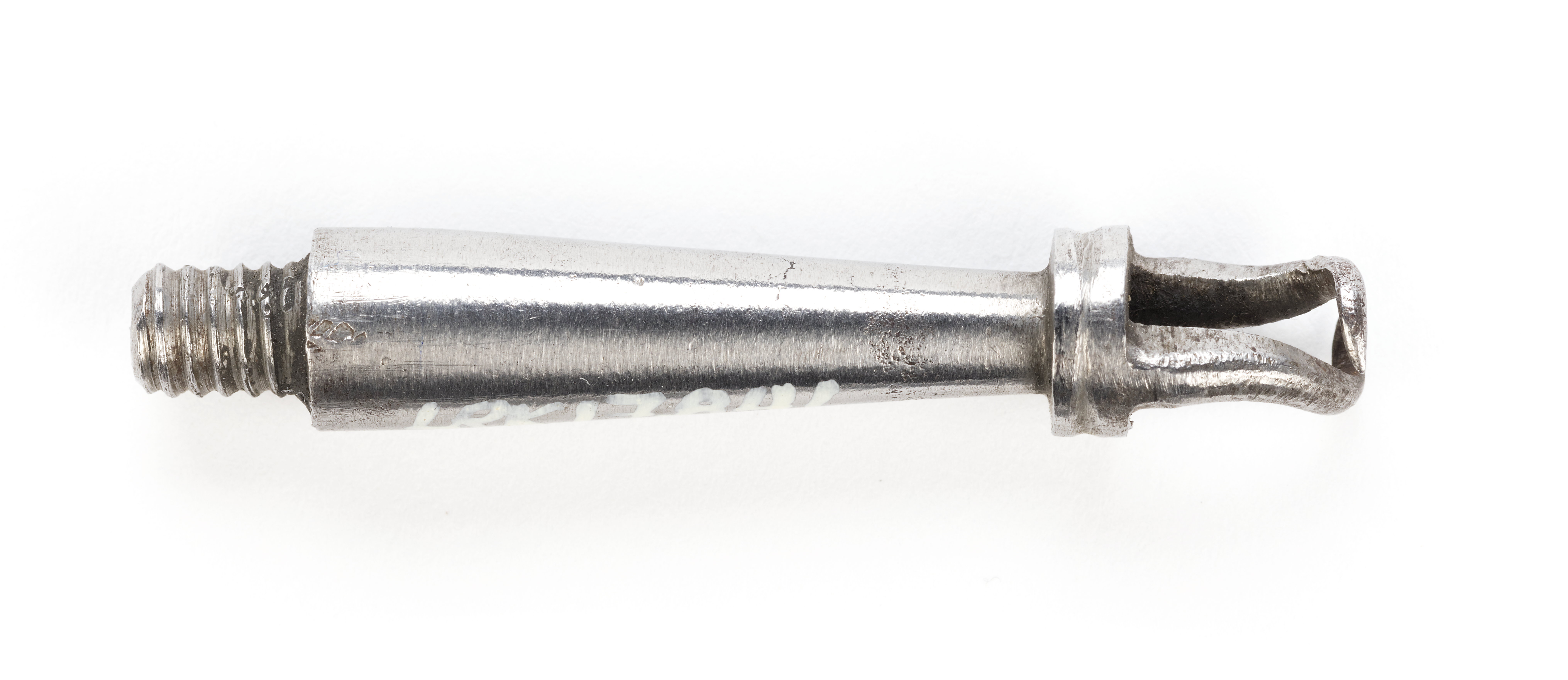 Krats bestående av en gängad del, l: 6 mm, framåt avsmalnande del, l: 28 mm samt en skiva med infilad skåra runtom och två framtill om varandra böjda spetsar. Förvaras i kolvlådan.