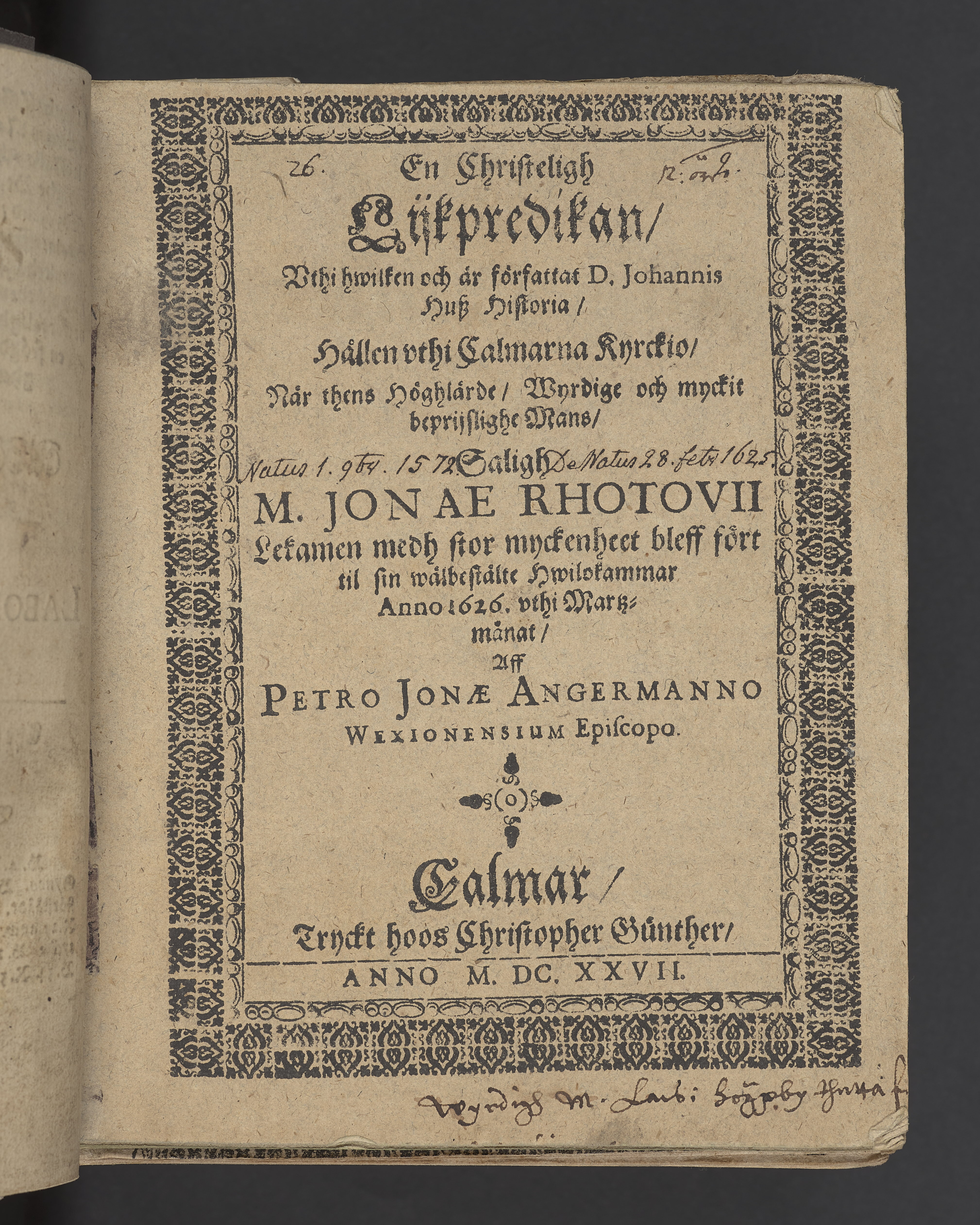 En christelig lijkpredikan ... hållen vthi Calmarna kyrckio, när ... M. Jonae Rhotovii lekamen medh stor myckenheet bleff fört til sin wälbestälte hwilokammar anno 1626. vthi martz månat, aff Petro Jonæ Angermanno ... Calmar, tryckt hoos Christopher Günther. Anno MDCXXVII.