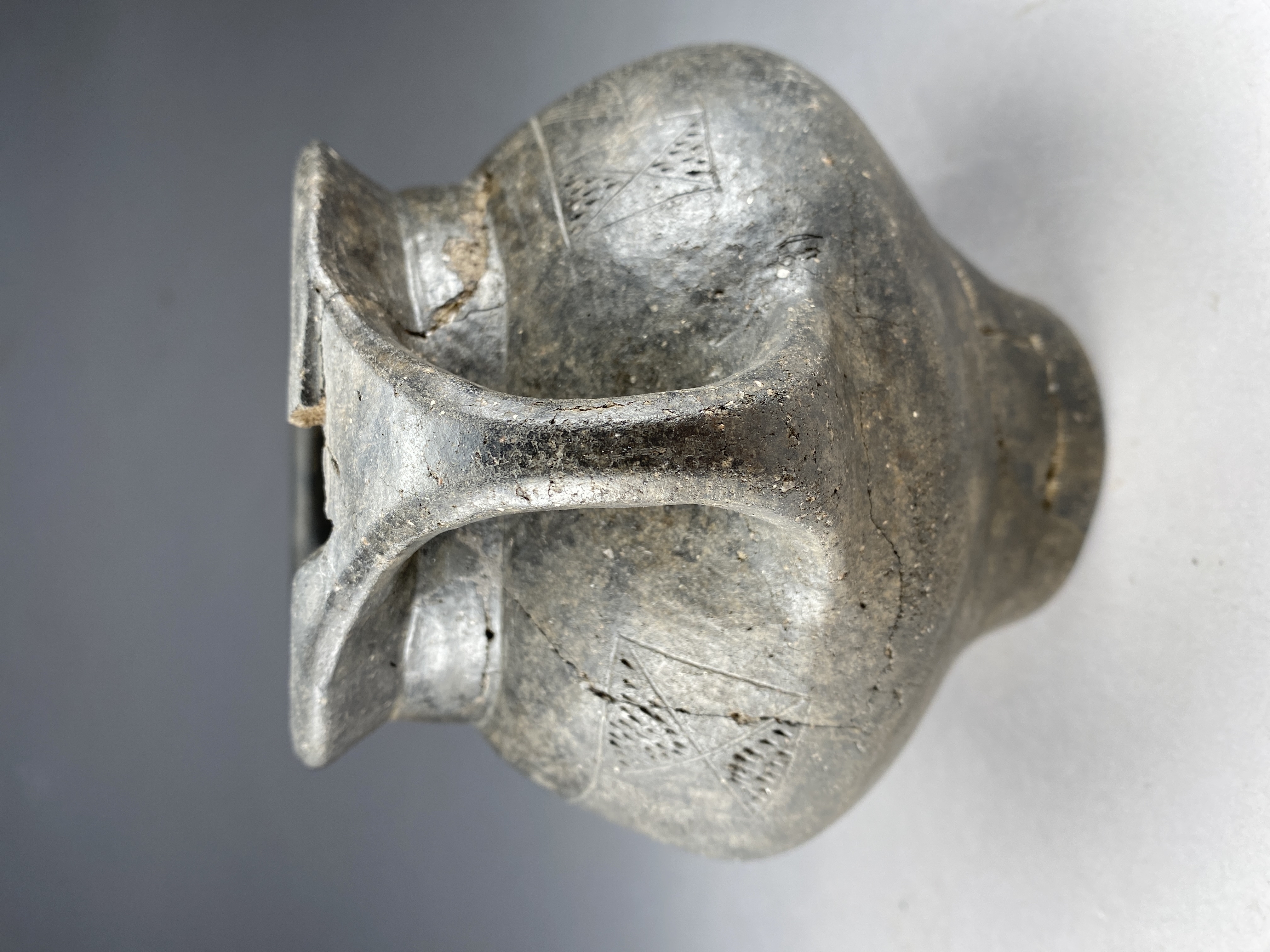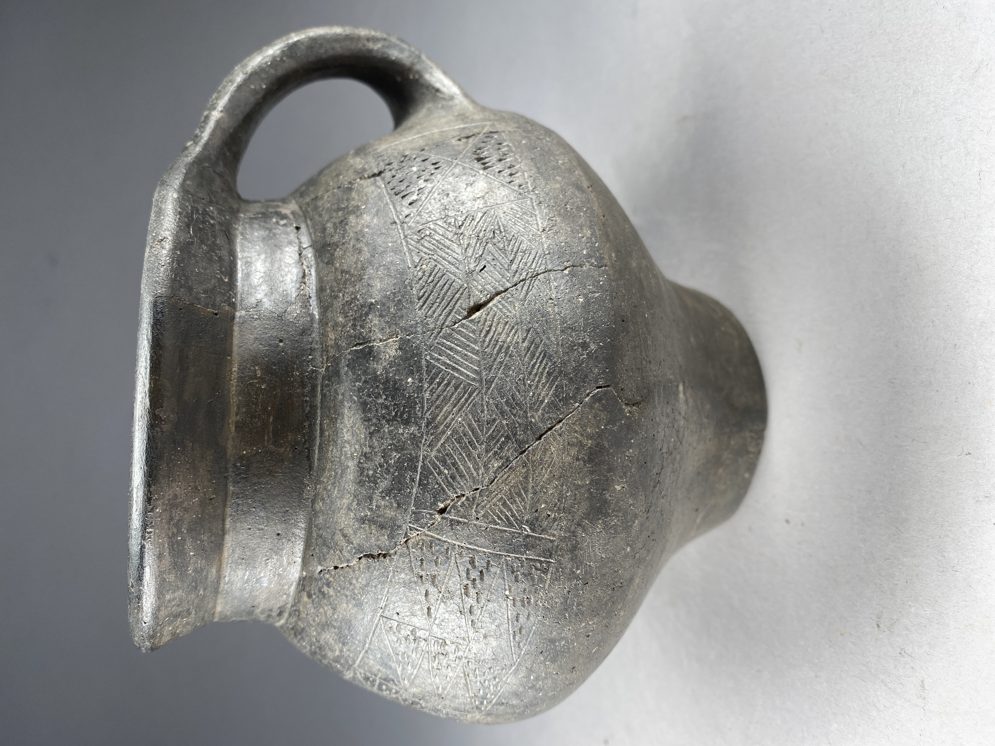 Dubbelkonisk form av mörkt tunt glättat gods. Högt placerad skuldra, indragen kort och rak hals. Facetterat, X-formad hänkel, insvängt fotparti. Ornering på skuldra, linjebandsinramade romber och trianglar fyllda med små streck. H. 14, bottendiam ca 7 cm.