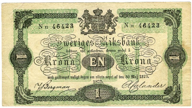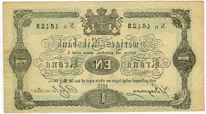 Upphov: Sveriges riksbank. Media: Statens historiska museer. Ekonomiska museet - Kungliga myntkabinettet/SHM, (PDM) Upphovsrätten till detta verk har gått ut och är därmed fritt att använda på alla sätt. Ange gärna upphovsperson om denne är känd.