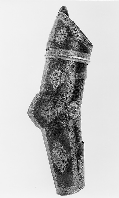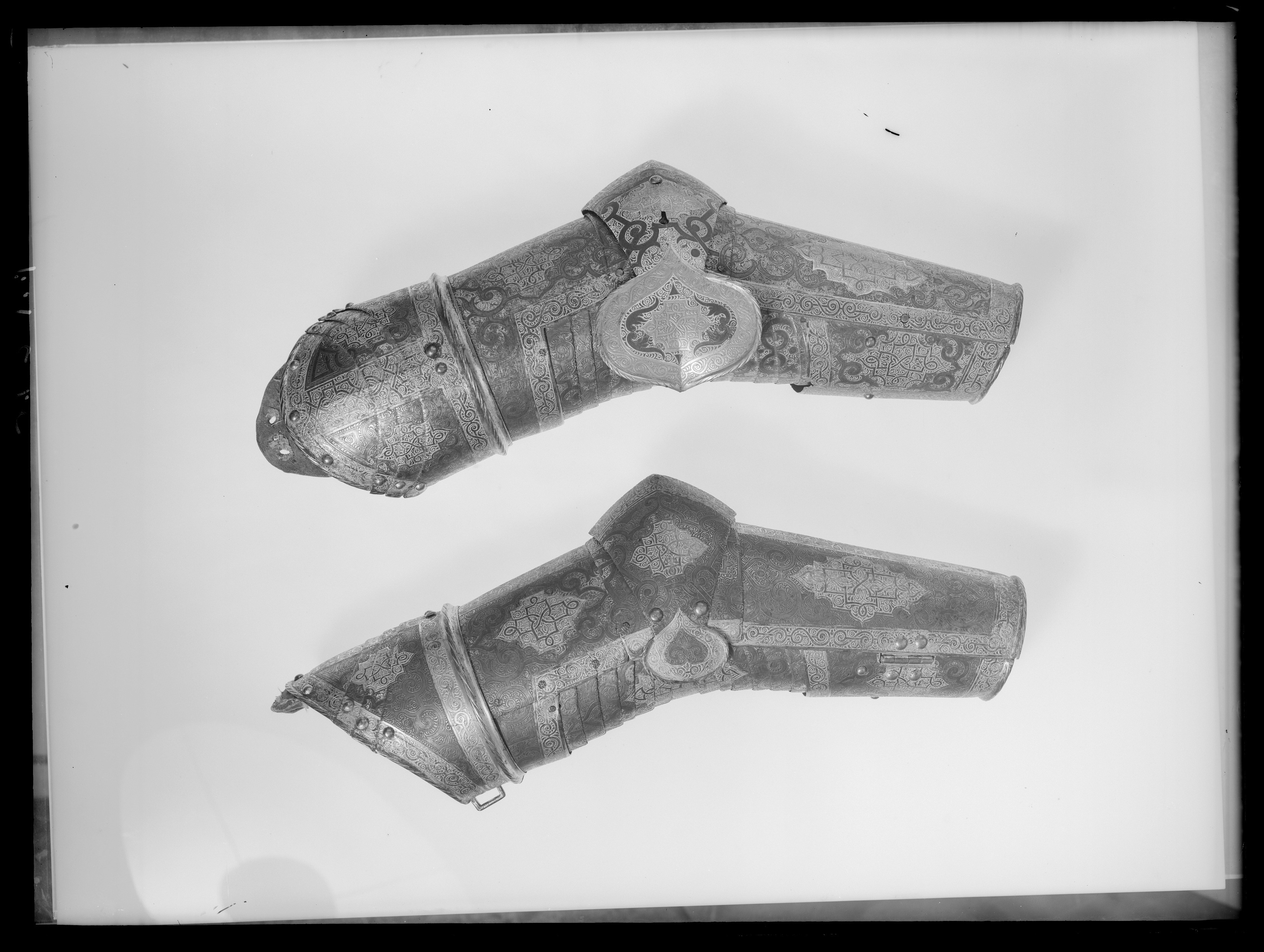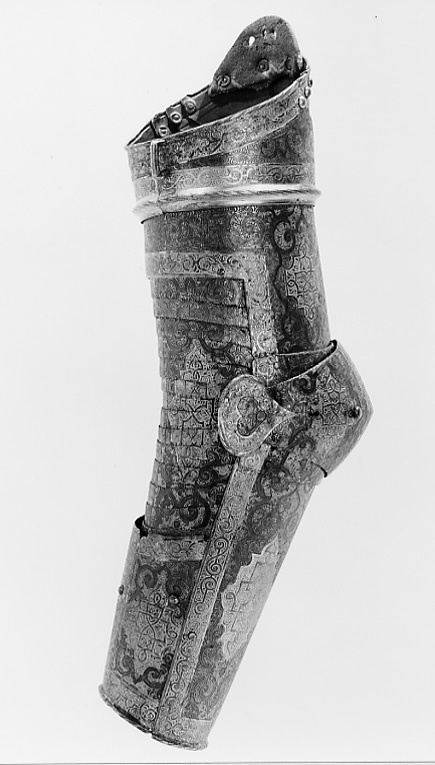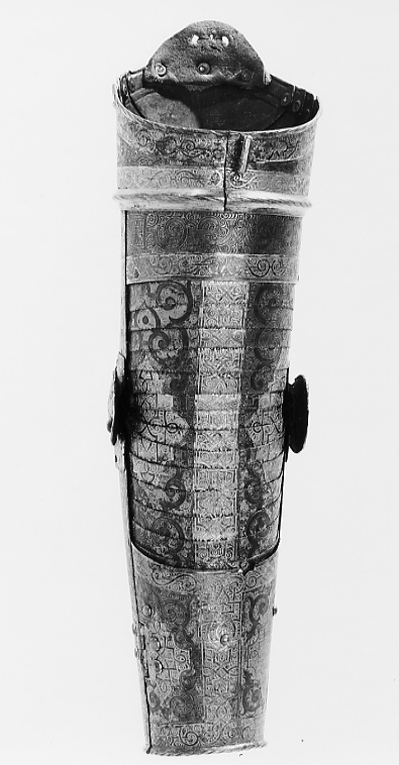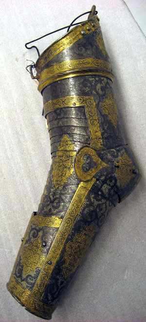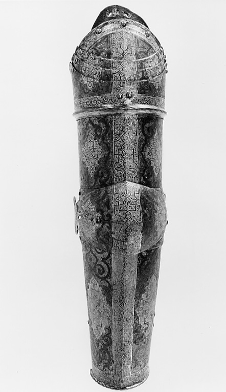 - 1 rustning af jern, helt och hållet etsad i ornamenter, hvilka äro dels förgyllda dels ifyllda med en hvit massa, rustningen, som uppgifves hafva tillhört konung Christian II, består af: hjelm i 5 delar med slutet visir, hakbetäckningen att öpna på midten, kammen hög, starkt bakåtsluttande, för hjelmbusken en hylsa, muttern på ena sidan af visiret jemte knappen till fjedern på öfre visiret borta, hjelmen invändigt fodrad med stoppning, öfverklädd med sidensars,