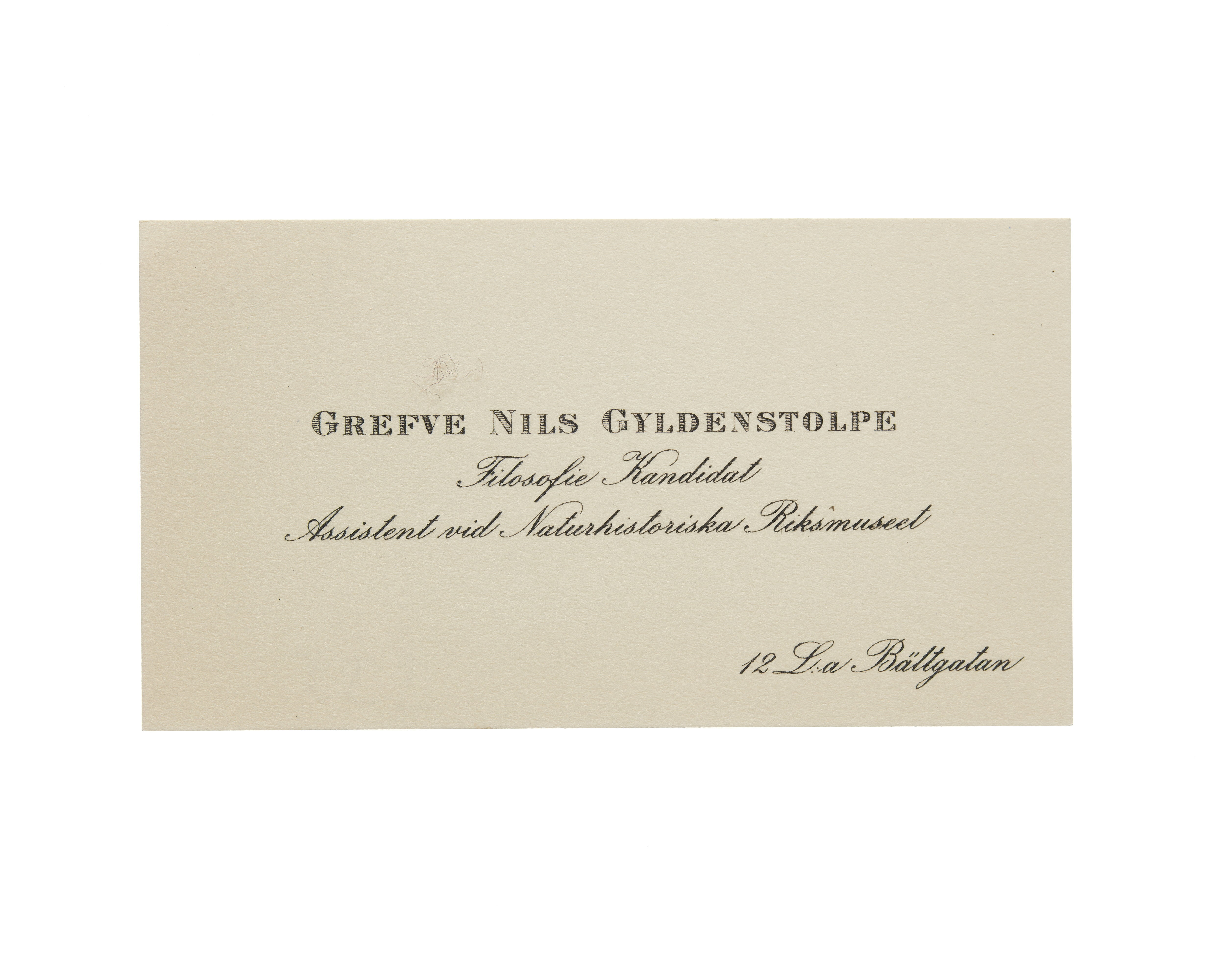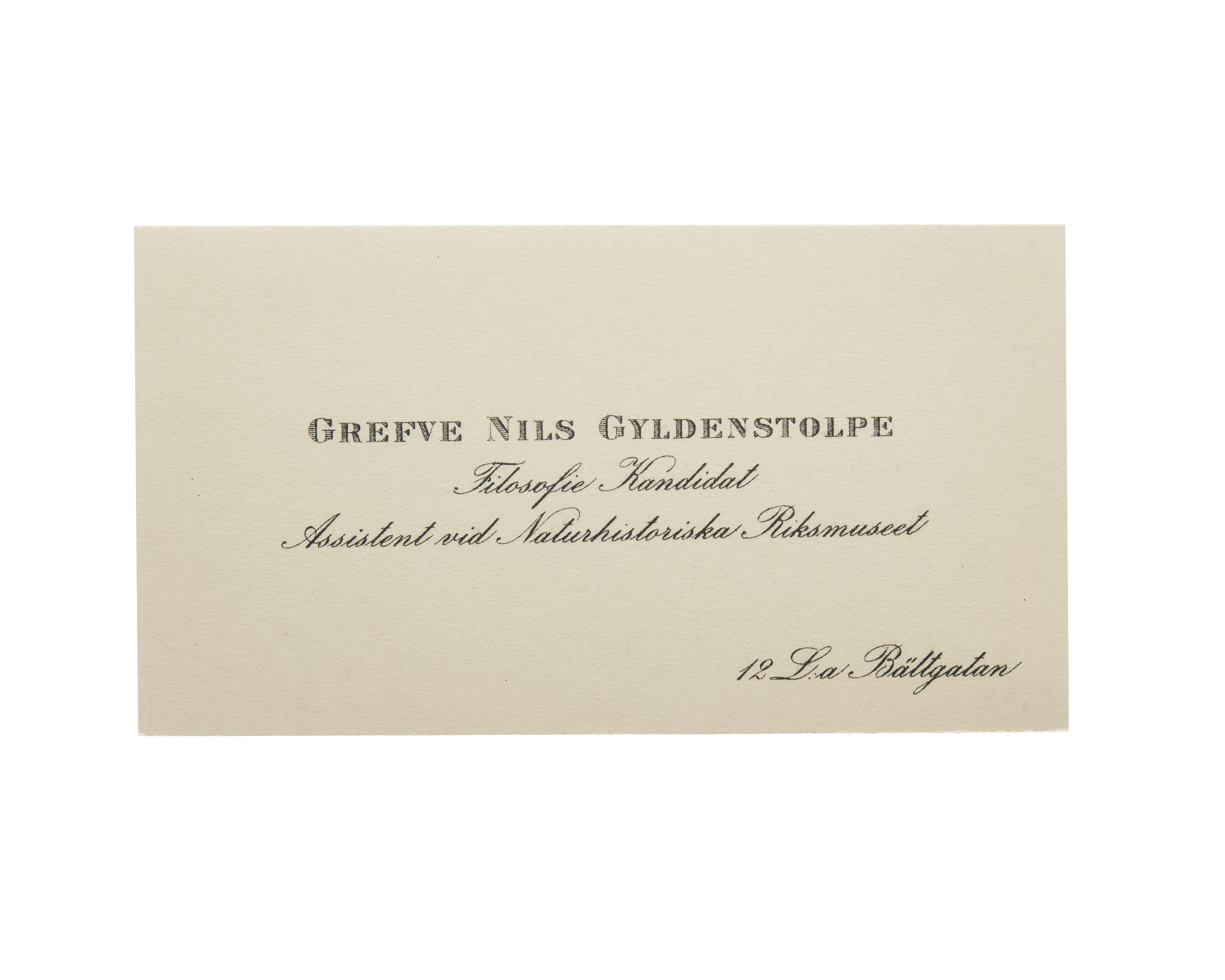 Visitkort från Greve Nils Gyldenstolpe, Filosofie Kandidat Assistent vid Naturhistoriska Riksmuseet.