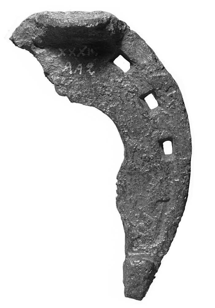 HÄSTSKO Fragmentarisk. Ena skänkeln avbruten. Den bevarade skänkeln relativt bred, bakåt avsmalnande med tundad ytterkontur. Klink- och tåhakar stora. Sömfåra med tre sömhål. Ursprunglig längd: 10,7 cm