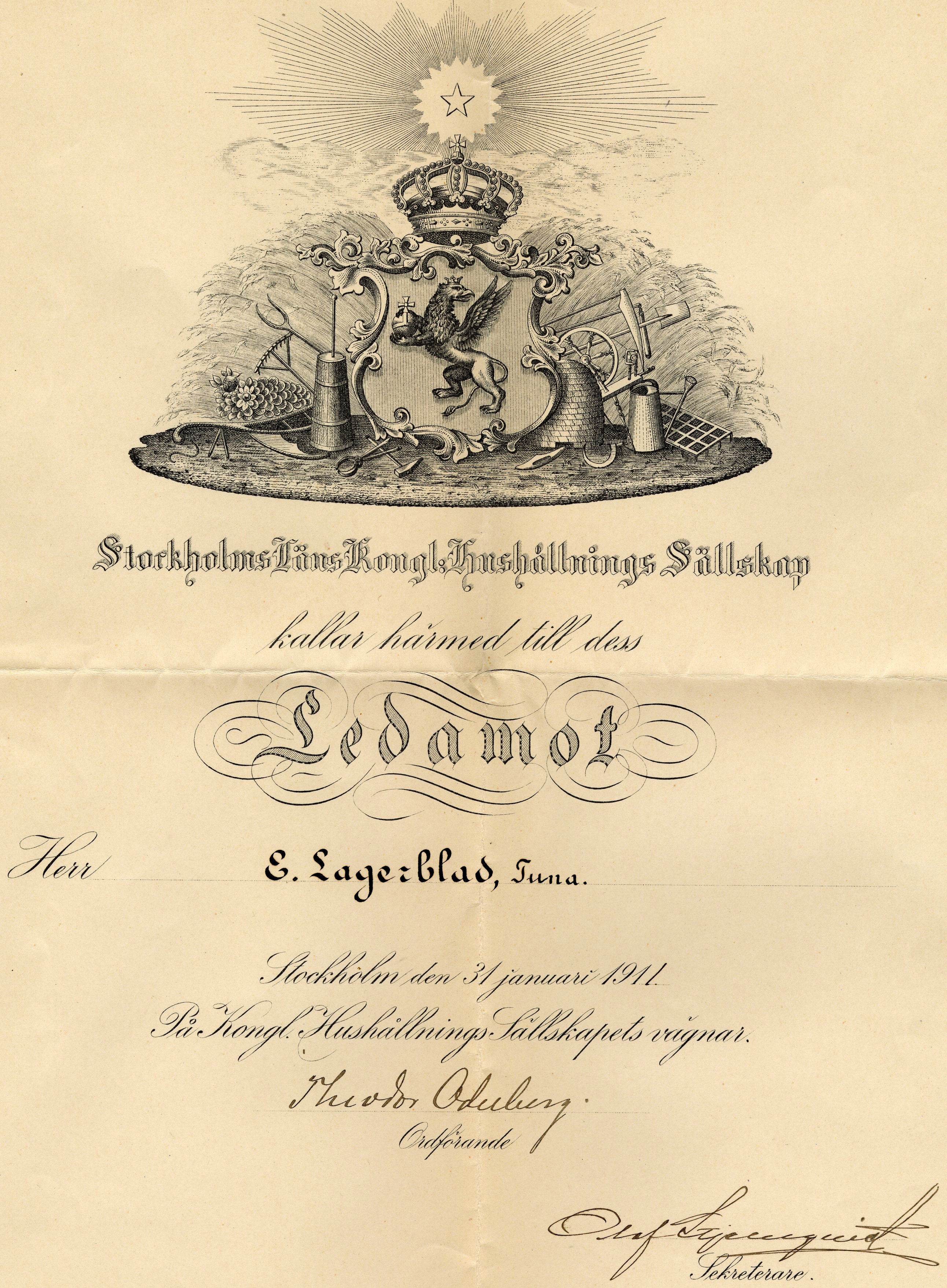 Dokument med karaktär av diplom eller motsvarande, med texten "Stockholms Läns Kongl. Hushållnings Sällskap kallar härmed till dess Ledamot Herr E. Lagerblad Stockholm den 31 januari 1911 På Kongl. Hushållnings Sällskapets vägnar. [Thord?] [Odelberg?] Ordförande [Olof Tjernquist?]