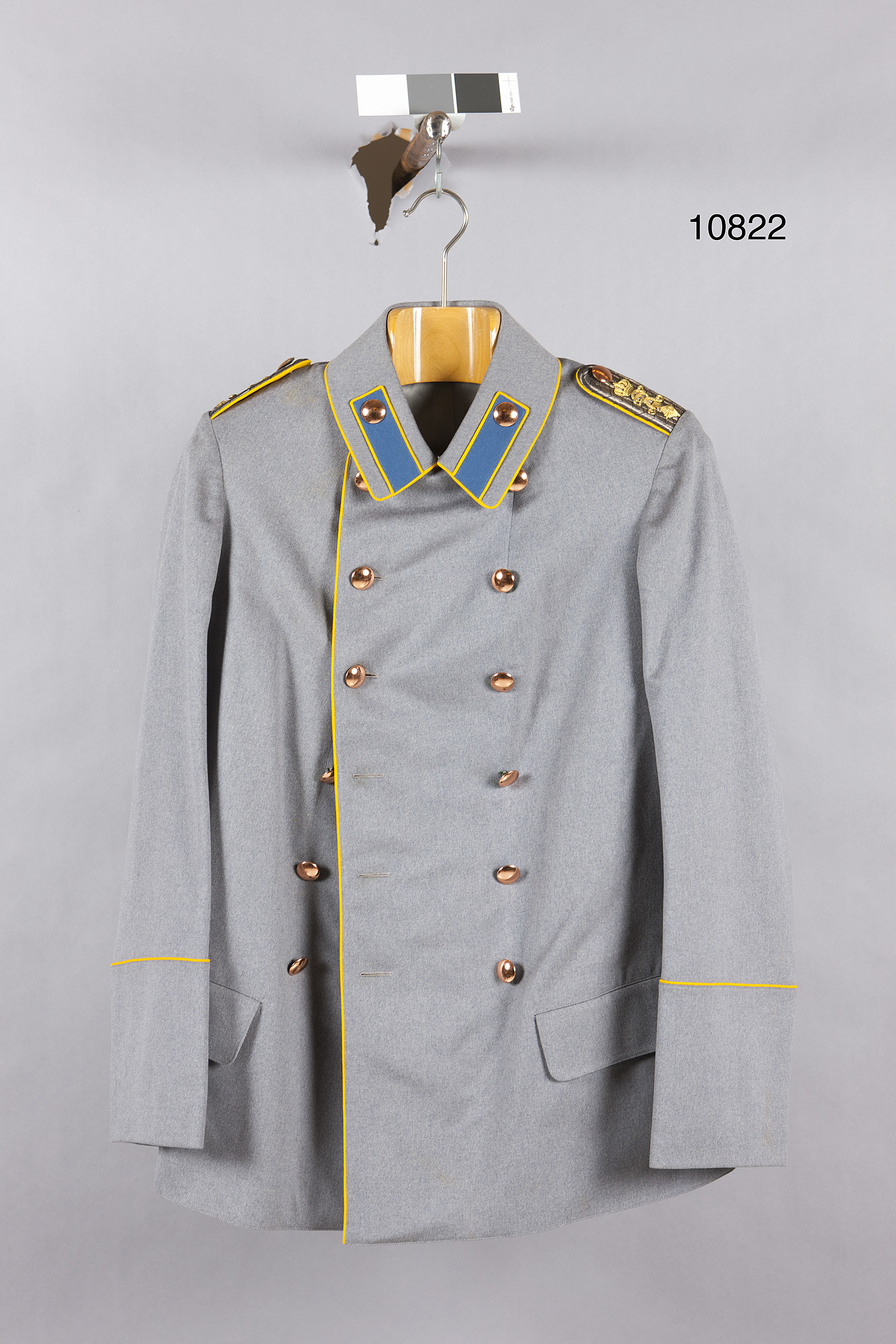 Vapenrock av ljusgrått kläde, kantad med gul passpoal, tvåradig, med fällkrage. Sex knappar i varje rad, något kupiga, med slät kopparglänsande yta. På insidan firmamärke: "J ROBRECHT BERLIN". Axelklaffar täckta av silvergaloner med Fredrik III:s namnchiffer: "FR III" (Fredricus Rex) krönt av sluten krona samt kvadratisk knapp med radiellt ordnade strålar. Fällkrage med knapphål 85 mm långa av blått kläde. Ärmuppslag 155 mm breda. Nedtill fickor med lock. Foder av kyprat grått siden med en innerficka. I ärmarna vitt siden.