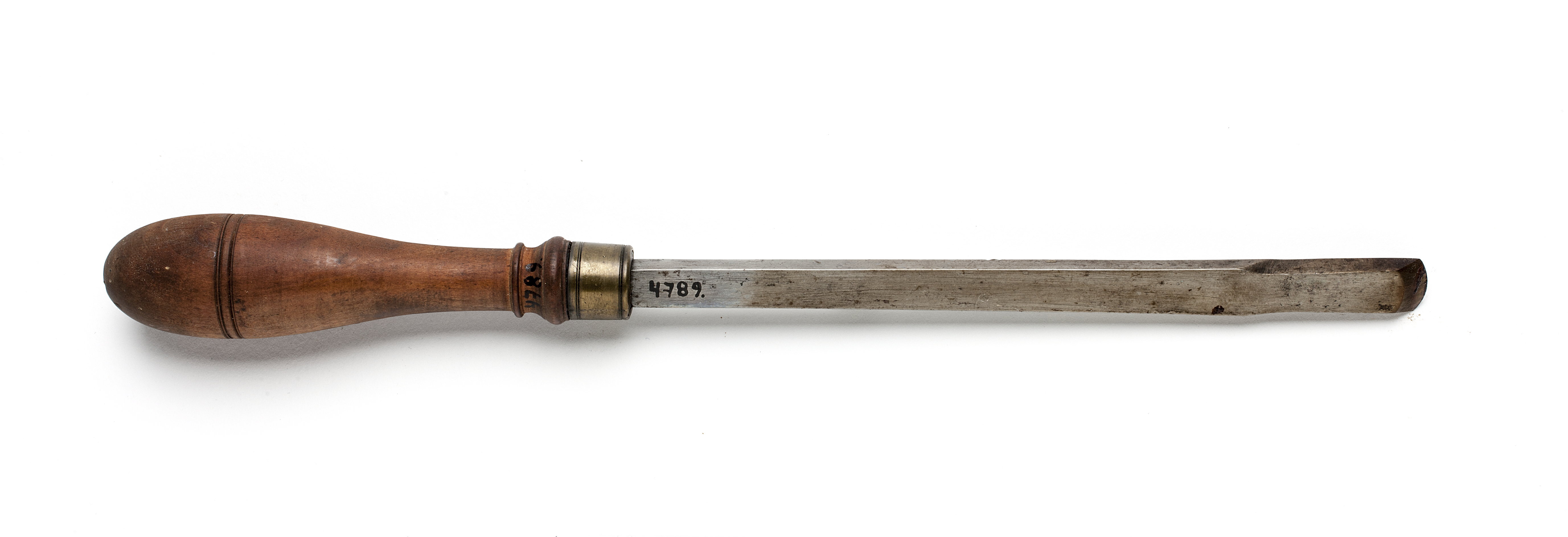 Klinga med rektangulär genomskärning, något bredare mot änden. Svarvat skaft av päronträ med två vulster nedtill ("skoklostertyp"). Mässingsring. Stämpel i skaftets ände vid fästet: "81" med stansar nr 5375.