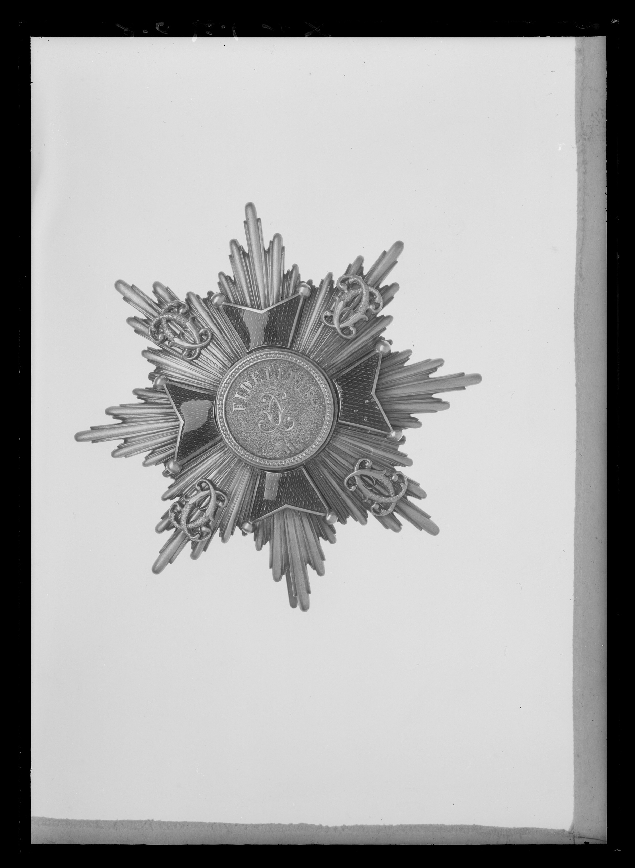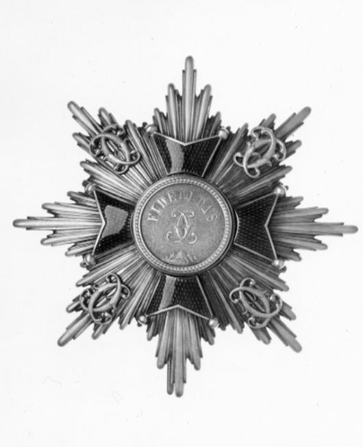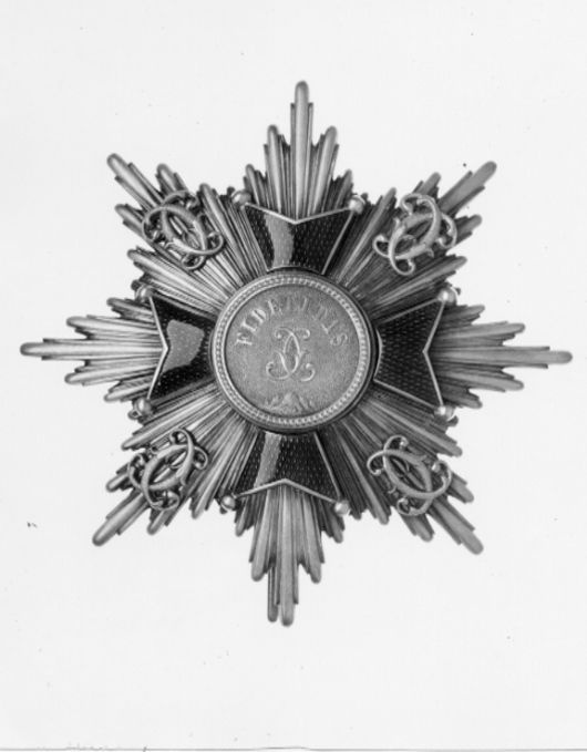 Åttauddig strålstjärna av silver, varannan stråle konvex, varannan konkav. Därpå fäst ett malteserkors av förgyllt silver, armarna täckta med röd genomsynlig emalj, kulor på spetsarna. Medaljong av förgyllt silver med i relief mot punsad botten: "FIDELITAS", spegelmonogram C och nertill bergstoppar. På stjärnans fyra diagonala strålknippen fäst spegelmonogram C av förgyllt silver. På baksidan fäst vertikalt placerad säkerhetsnål- av silver. På nålens utsida stämplat:"L. PAAR", samt Karlsruhes stadsstämpel, krönt sköld med Badens balk.