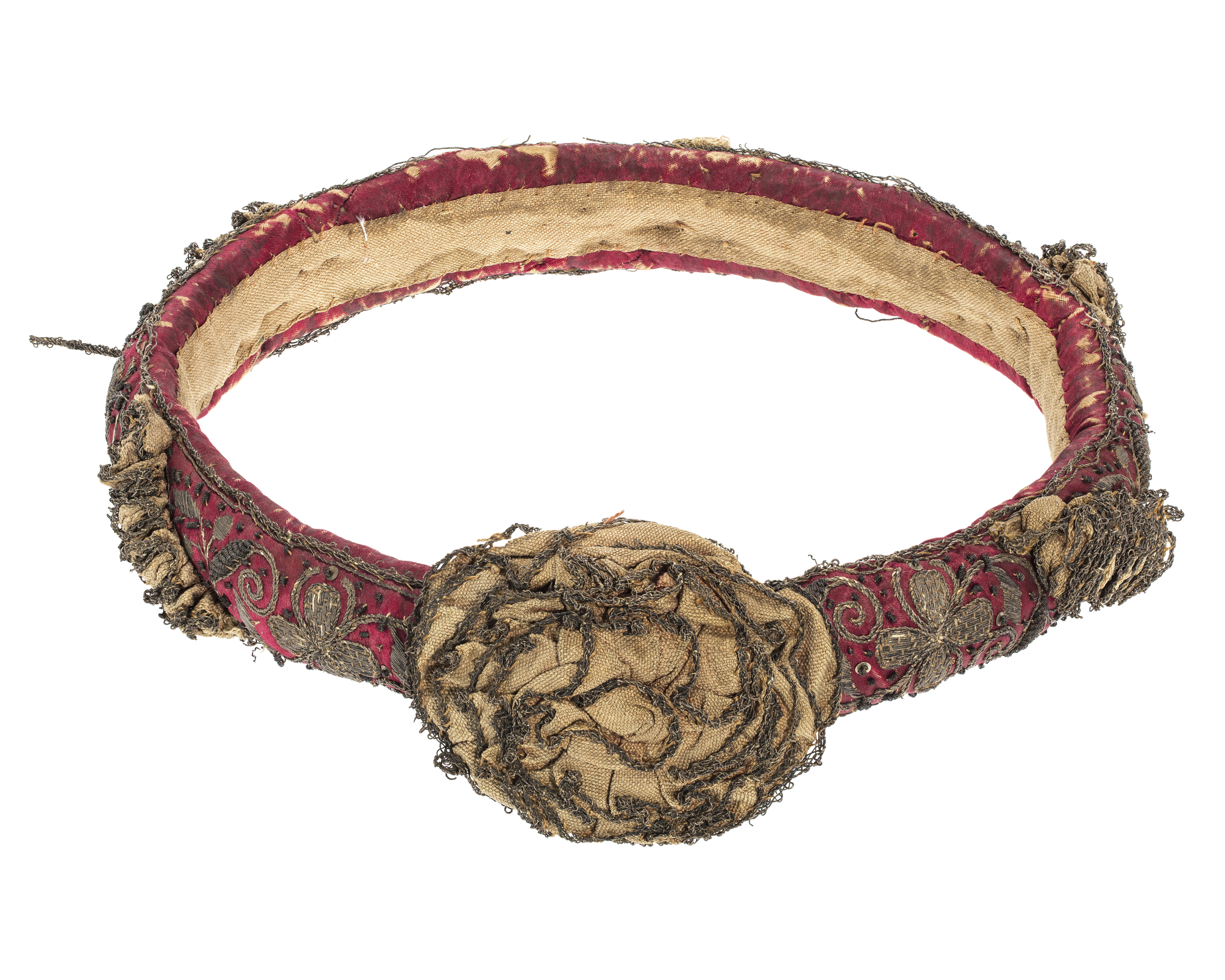Hjälmkrans, sannolikt tornerpris, s.k. "faveur", från 1600-talets början. Kransen är på utsidan klädd med rött atlassiden med broderi i form av blommor och bladslingor. Broderiet utfört med metalltråd (silver- och guldtråd) i läggsöm, kantiljer samt paljetter. Mitt fram finns en rund "rosett" (ca. 8 cm x 5,5 cm) formad av ljust röda band. I bandets ytterkant finns ett smalt band av silvertråd, ca. 3 mm brett. Rosetten är uppbyggd på en stomme av 4 runda läderplattor, den översta minst och den understa störst. På kransen finns även 5 diagonalt fastsydda tygdelar, formade av det ljusröda bandet som veckats, även här finns ett smalt silvertrådsband påsytt i kanten av bandet. Invändigt är kransen fodrad med ett ljusrött band av siden/linne, ca. 2 cm brett. Framtill syns på baksidan av kransen delar av stadkanten på det röda sidenet, stadkanten är randig i grönt och benvitt och har ytterst en rosa rand. Jämför inv.nr 12604 och 12605, två mycket lika kransar, samt rosett inv.nr 25942. Jämför även inv.nr 12606. Enl. kat. 1932:537 kallade "Hatteband, gammalt mode" i inv.1672 och ingående bland livréerna.
