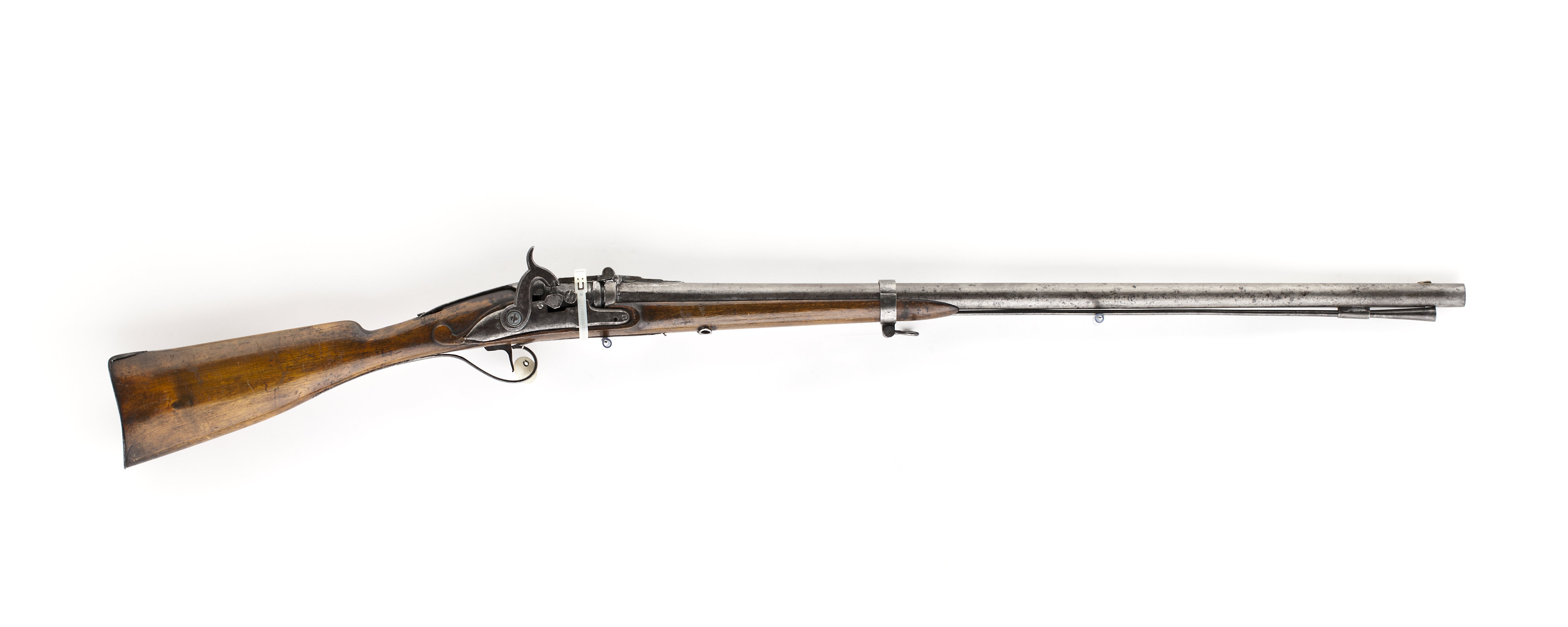 Rund, slätborrad pipa av stål med plan siktbana till kornet. Vid bakänden pålött ring och på banan platta, framåt avtrappat i tre avsatser, baktill försedd med gångjärn och vridbar platta. Pipan fäst med band runt framstock och pipa. På undersidan rörka. Åttsidig kammare, framänden med rundad fals, därbakom pålött en stoppring, avtagen jäms med pipans översida. På h. sida iskruvat oregelbunden, kantig snäcka med iskruvad tändhattsnippel, därframför iskruvat tapp med cylindriskt huvud. På undersidan djupt islagen E-liknande stämpel. Svansskruv med långt blad, därpå fastlött stålbleck med halvcirkelformig, böjd främre del (har möjligen tidigare varit löst och fjäder- belastat för att hålla fast patronen). Slaglås med välvt låsbleck, främre delens kanter fasade, igensatta hål för flint- låsets delar. S-formigt svängd plan hane med fasade kanter, hanskruv med bricka. S-formigt svängt slaghuvud, mun med hak på h. sida. Nöt utan studel. Två låsskruvar. Rak avtryckare. Halvstock av trä med långt, kraftigt kindstöd. Beslag av stål. Bakplåt med kort flik på kolvryggen, fasade kanter två skruvar. Långt sidbleck, bakänden ringformig, däri rörlig skivknapp, framänden utdragen och böjd under framstocken, två fästskruvar, en vid ringen, en på framstockens h. sida. Avtryckarbleck och varbygel av stål, bygel med lång främre arm avslutad med rombiskt blad. fästskruven saknas, bygeln baktill övergående i lång bakre arm, två skruvar. På pipbandet rembygel. Tillbehör: Laddstock av stål, L: 866 mm, framtill konisk. I paket bärrem av läder överklädd med fragmentariskt blått tyg.