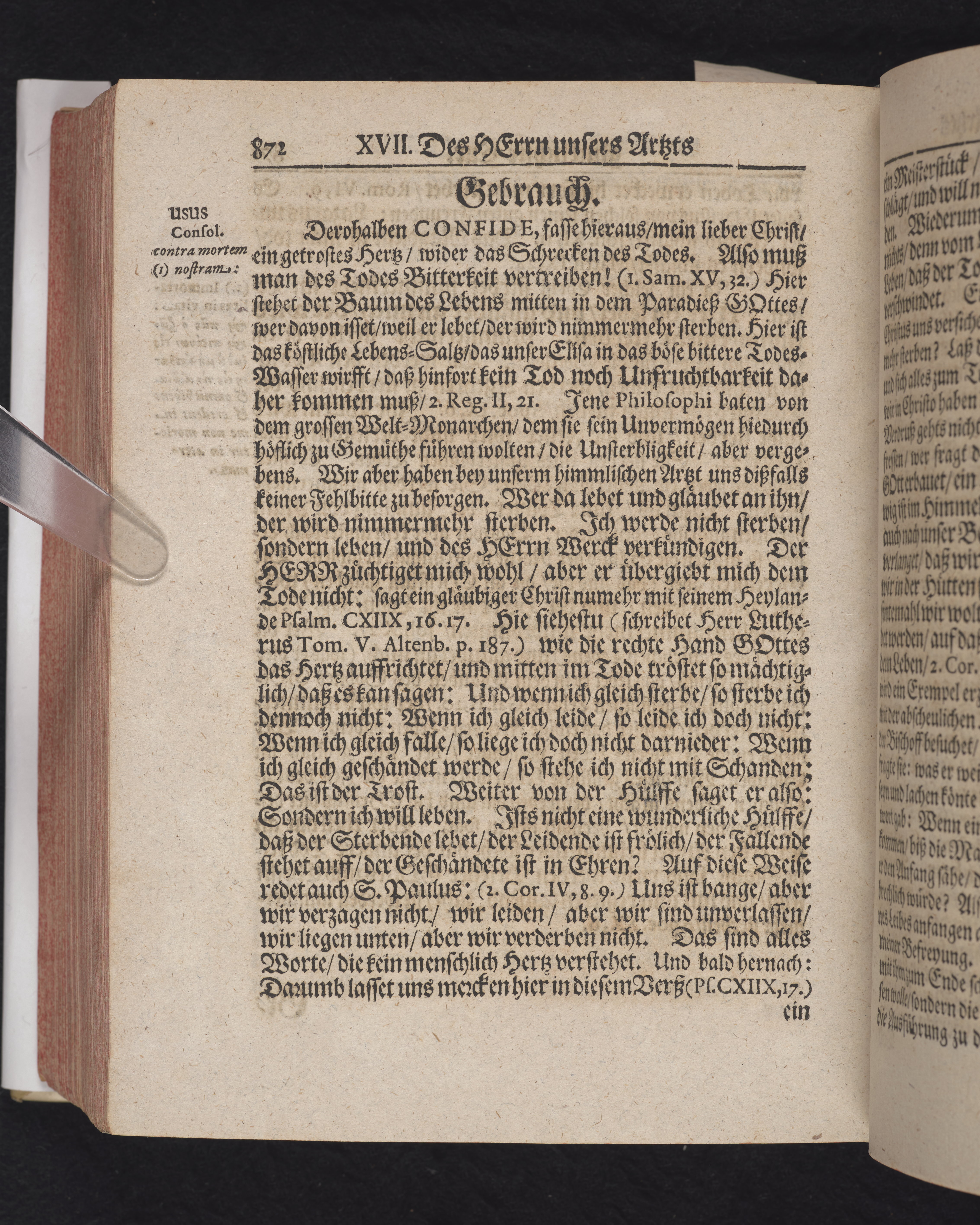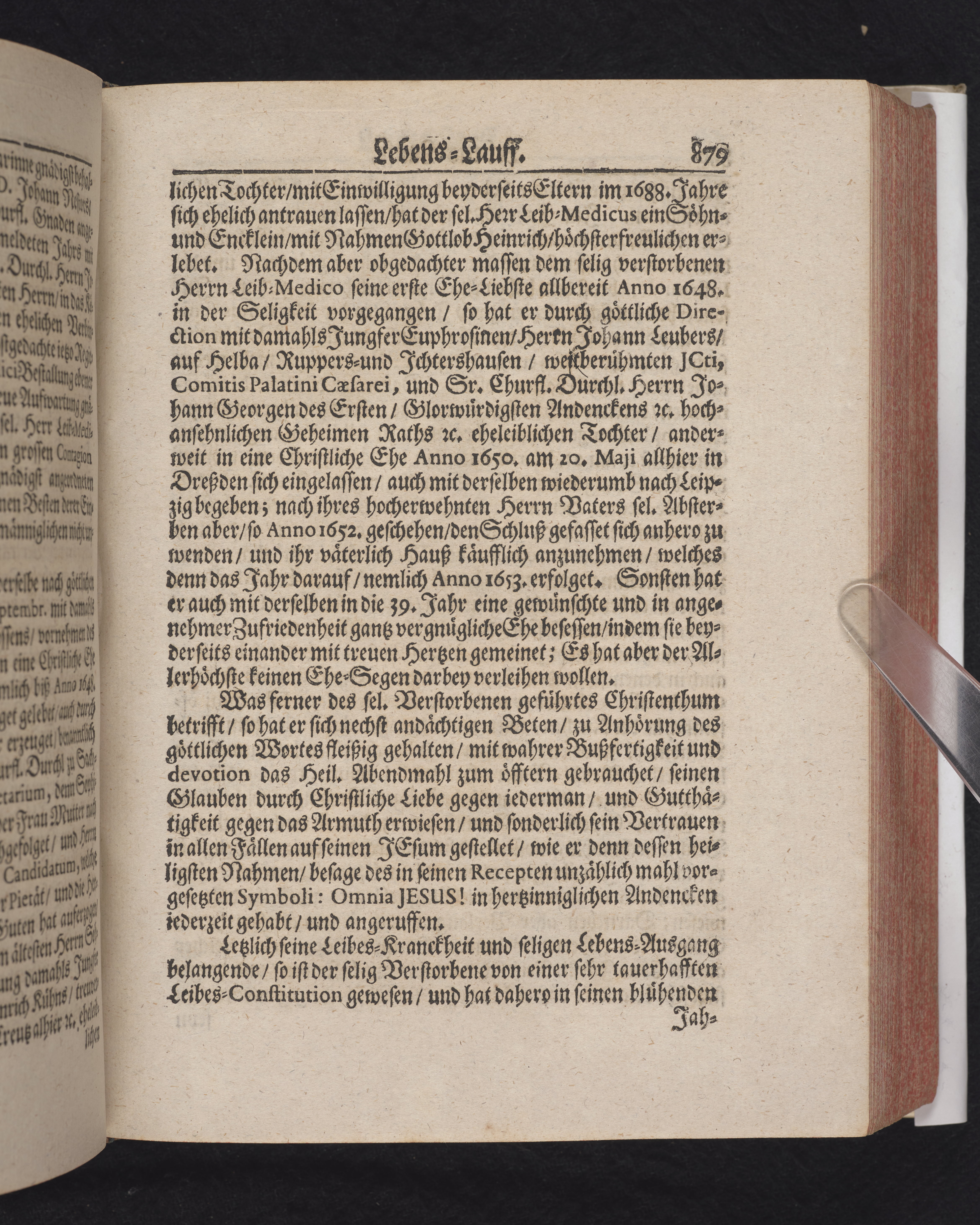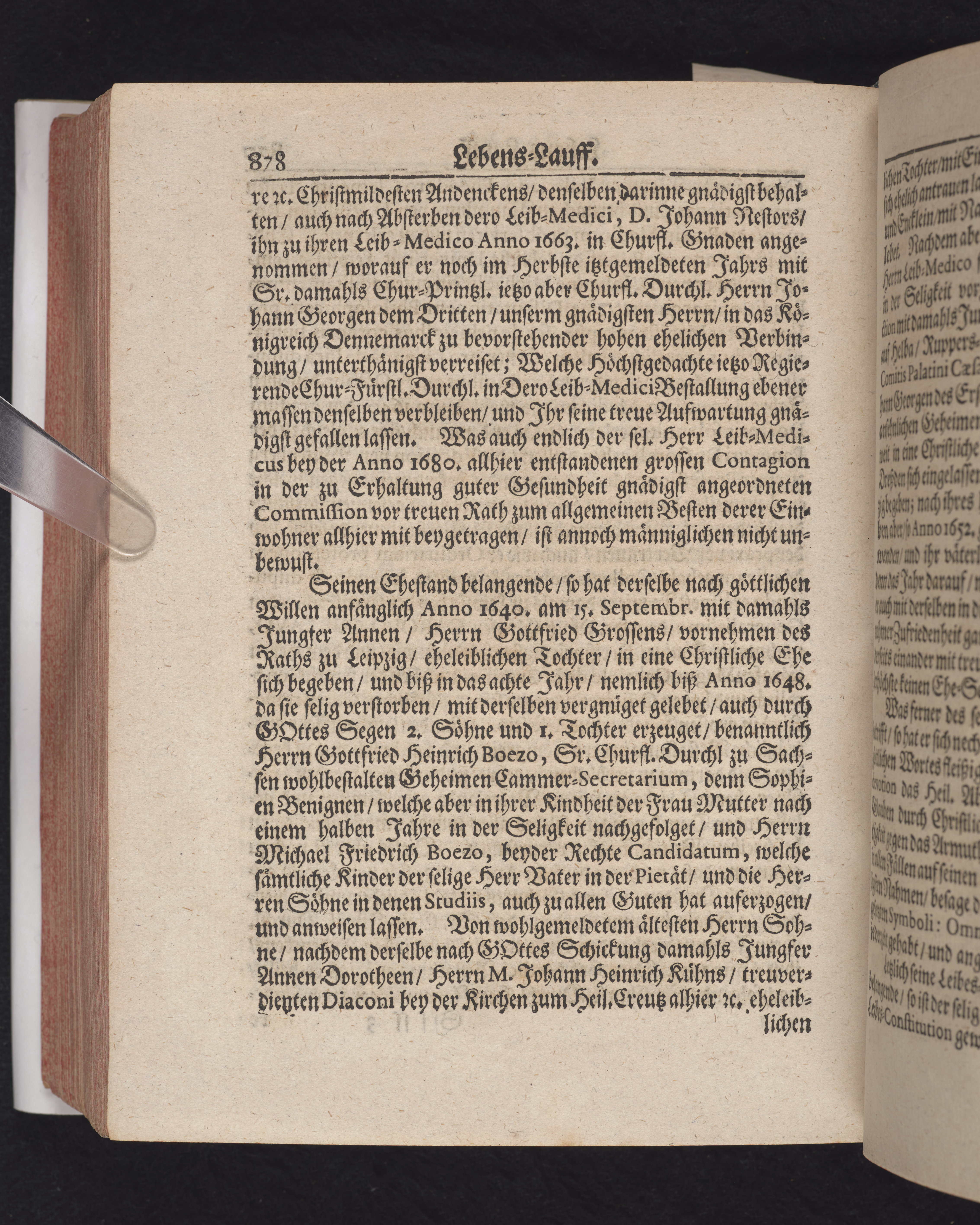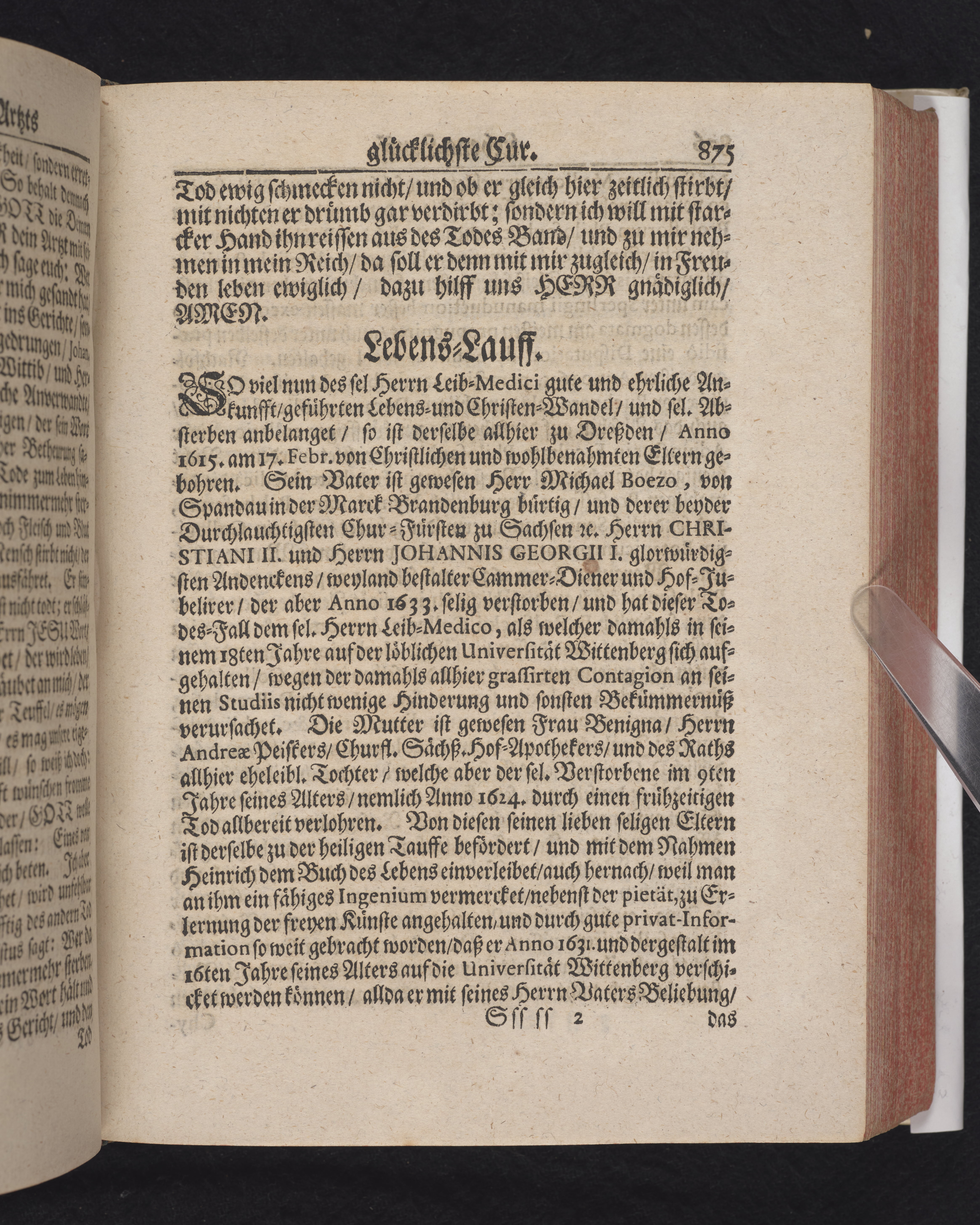 Ingår i en utgiven samling med 28 likpredikningar av Samuel Benedikt Carpzov: Grünende Gebeine, oder Leich-Predigten... Tryckt innehållsförteckning och register. Handskriven innehållsförteckning över de 28 likpredikningarna med bläck på främre försättsbladet (recto och verso).