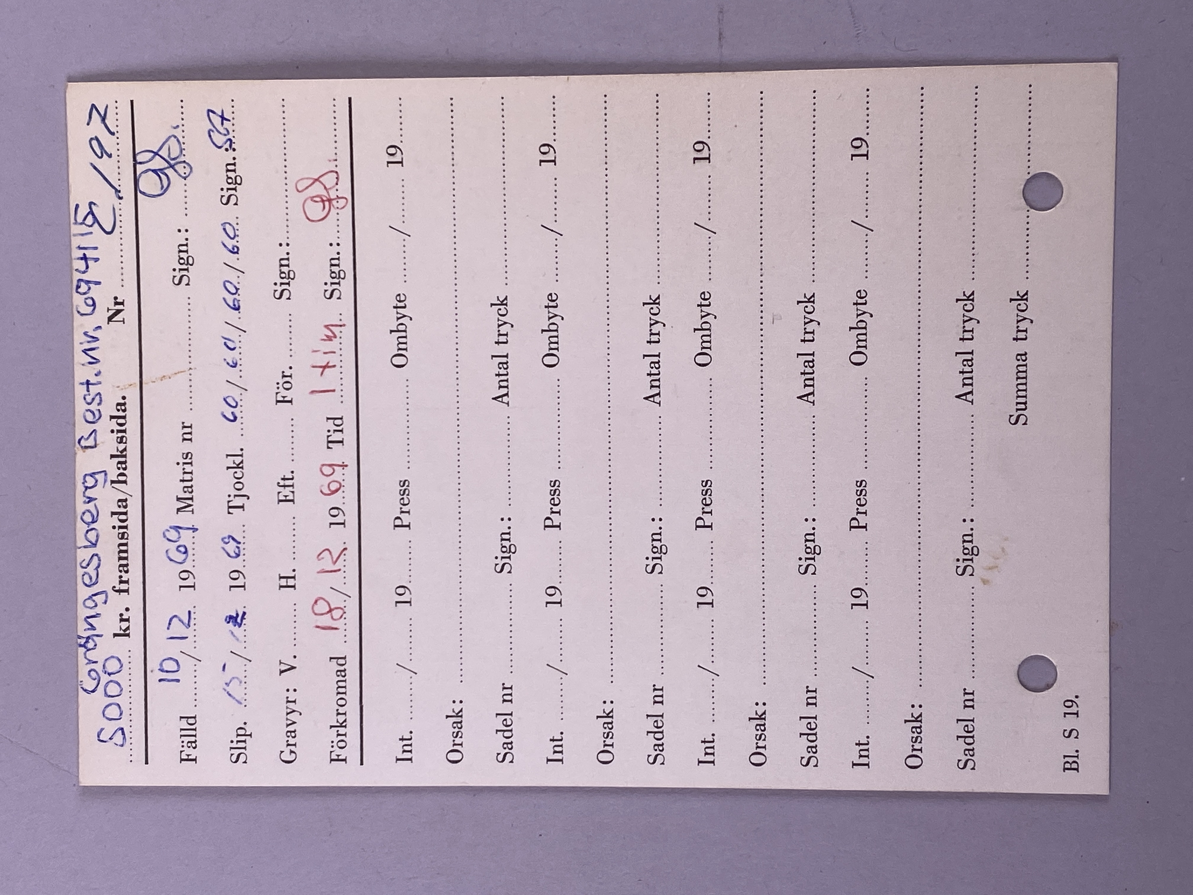 Tryckplåt för aktiebrev på 5000 kr från Trafikaktiebolaget. Med tillhörande kuvert. Rektangulär plåt tillverkad i rostfritt stål och koppar. Framsidan av plåten med gravyr föreställande ram med flera ornament, däribland fyra vapensköldar. Två vapensköldar med korslagda pilar, en sköld med grip och en sköld med tre vulkaner. Innanför ramen graverad påskrift: "Aktiebrev. TRAFIKAKTIEBOLAGET GRÄNGESBERG-OXELÖSUND". Plåten stämplad: "C197", samt med senare inskrift: "694115".
