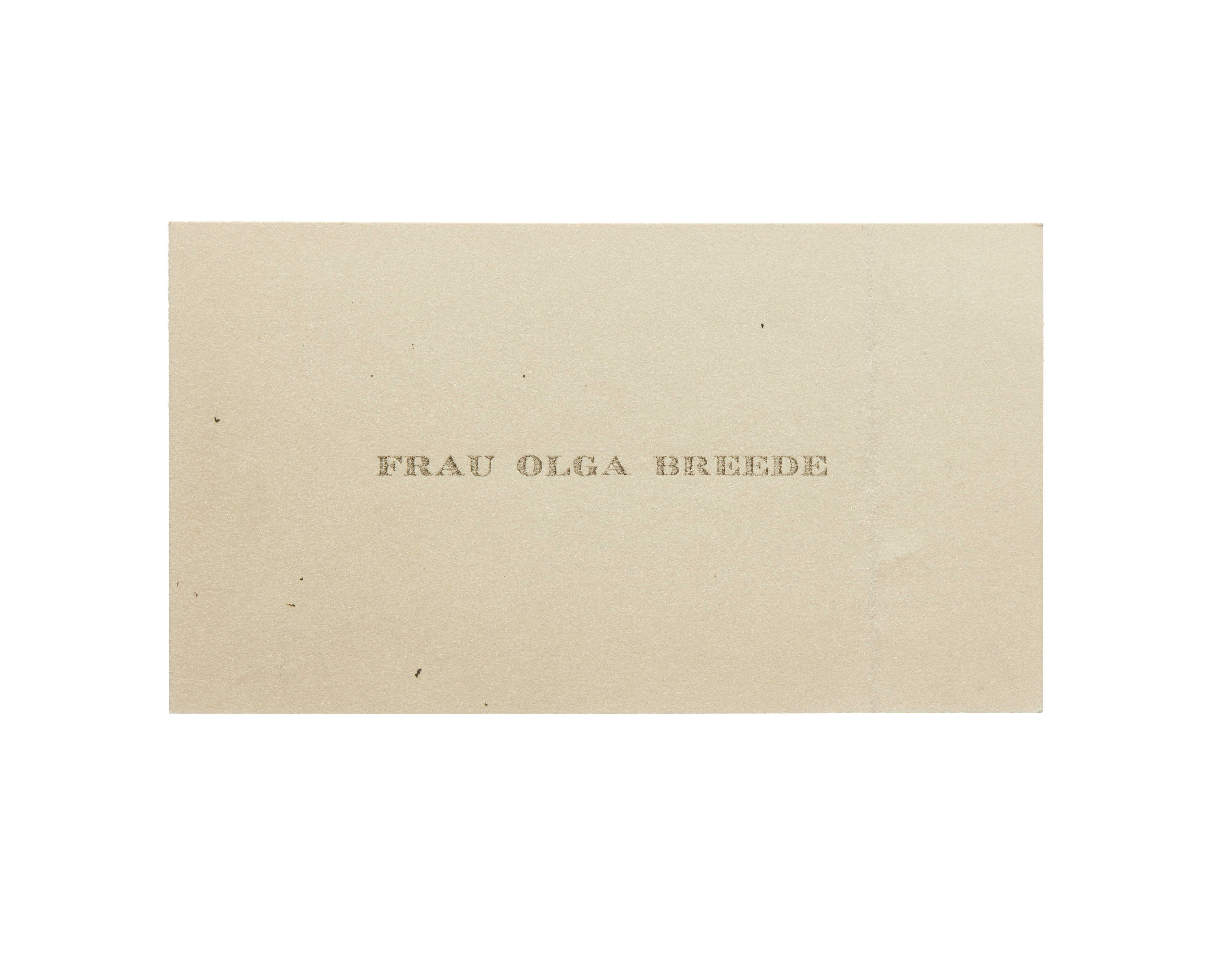 Ett visitkort från Fru Olga Breede. Daterat 1930, vikt i högra sidan.