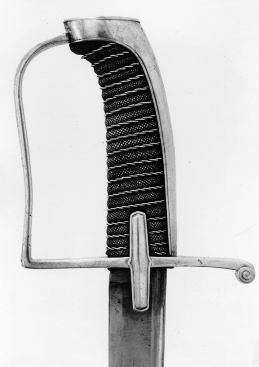 Fäste av silver. Ryggbeslag med plan överdel, silverstämplar, oval med tre värjfästen (svärdfejarämbetet), kontrollstämpeln "R.2" och "I G" (se Svenskt Silversmide 1520-1850 nr 1317). Plan, svagt sformad bygel. Rak parerstång med nedböjd ände. Styrskena med smal gravaerad rand. På parerstångens undersida samma stämplar som tidigare. Dessutom en oval stämpel med en dolk och två sablar (?). Dessutom graverat "v 46 1/2". Kavel av fiskskinn lindad med tvinnad silvertråd. Eneggad klinga med plan rygg, uppåtböjt spetsparti, som är tvåeggat 260 mm långt. Klingan har en längsgående hålkäl intill ryggen.