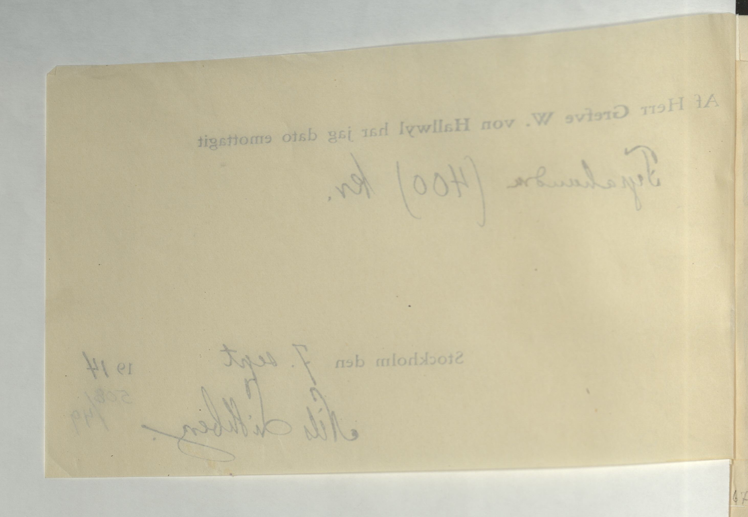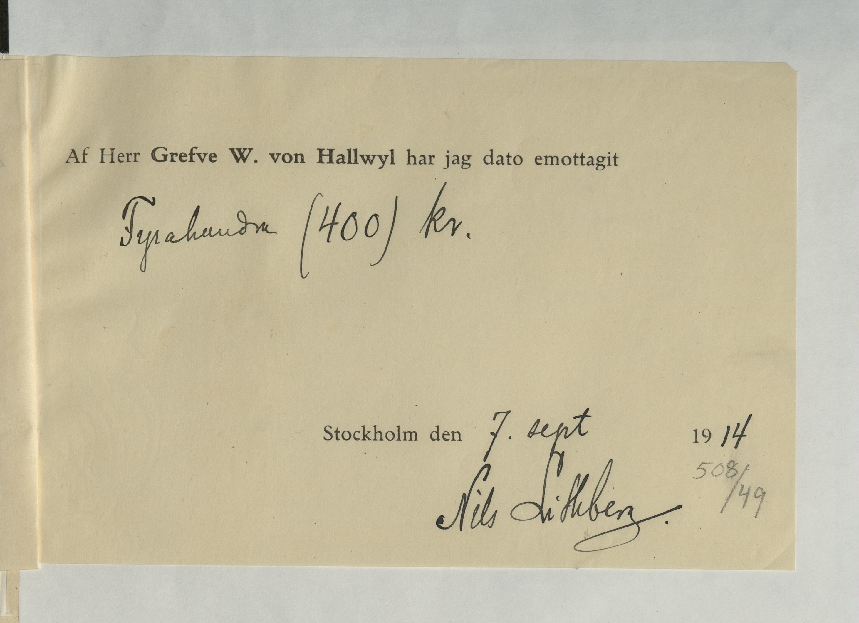 Emottagande av arvode från greven Walther von Hallwyl till Nils Lithberg, 7 september 1914.