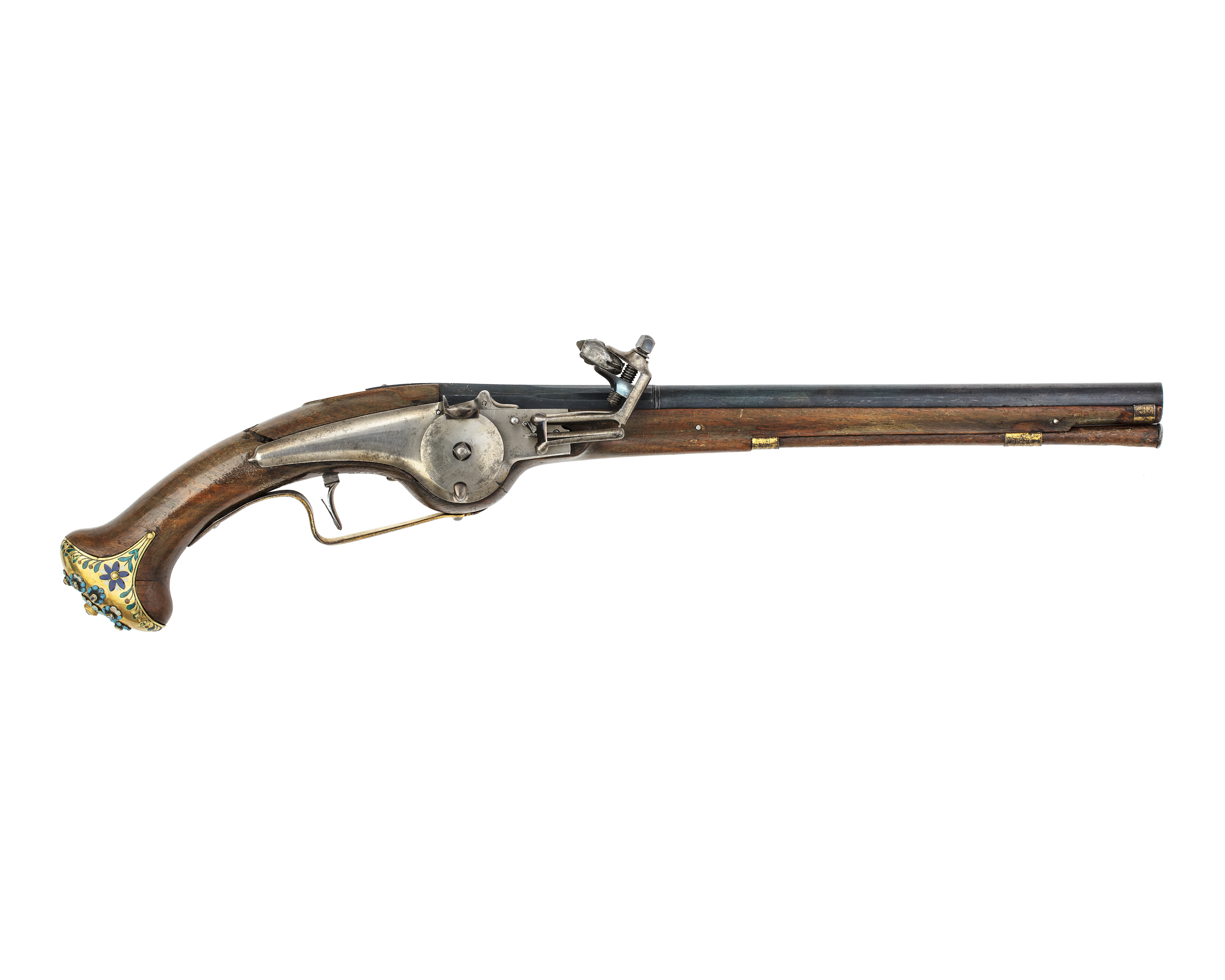 Ett par Pistoler med Hjul Lås, med Laddstakar af Valnöteträd, beslagne med Silfver förgyldt, beslagne nederst på Kolfven af Guld emailleradt med emaillerade Rosor och infattade Stenar.