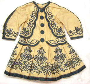 Barndräkt av utställd modell med veckad kjol fastsydd i livet. I sömmen mellan livet och kjolen sitter två skört med ett 38 mm långt glapp vid mitten. På dräktens baksida sitter de två skörten dikt an och det är också där de är som bredast. På livets framsida sitter två platta volanger som liknar framkanten av en väst eller jacka. De båda volangerna går från halslinningen ner till midjesömmen. Från halslinningen lutar de sig utåt nertill, där de också är som bredast. Mellan dessa volanger sitter en lodrät knapprad med fem större sammetsknappar (d: 30 mm) och två mindre (d: 20 mm). De mindre sitter vid den översta stora knappens ovansida. Mellan dem är en silverfärgad flätad tråd lindad som en liggande åtta. De stora knapparna är fastsydda i ett lagt veck. På livets baksida finns dräktens knäppning. Den består av nio lodrätt sittande mässingshakar som hakar i små sydda hål (d: 2mm). Mässingshakarna är dolda på undersidan av den högra delen av bakstycket. Dräkten har långa ärmar och de har en mjukt böjd form. Dekoren på dräkten består av blå sammetsband som löper runt halslinningen ner längst de båda volangernas kanter. Ett sammetsband går även i sömmen mellan fram- och bakstycke och fortsätter ner på ärmarna. Det går även runt ärmens nederkant. De blå banden återfinns längs underkanten på de skört som sitter i sömmen mellan liv och kjol, samt längs kjolens underkant. I alla de blå sammetsbanden löper ett tunnare flätat silverfärgat band. En annan dekor är Suttage- broderierna som finns på kjolen och på alla skört samt vid nederkanten på ärmarna.