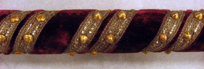 Lång rund bärstång av trä med förstärkning av metallskoning upptill, 22mm. Klädd med röd sammet och dekorerad med ett vävt band av gulbeige silkestråd, silvertråd och silverlan virat runtom, med två rader intill varandra. På bandet sitter förgyllda nitar. I övre delen en 240mm lång metallspets fästad vid en rund ring av metall. Botten ej täckt av sammet utan trät blottas.