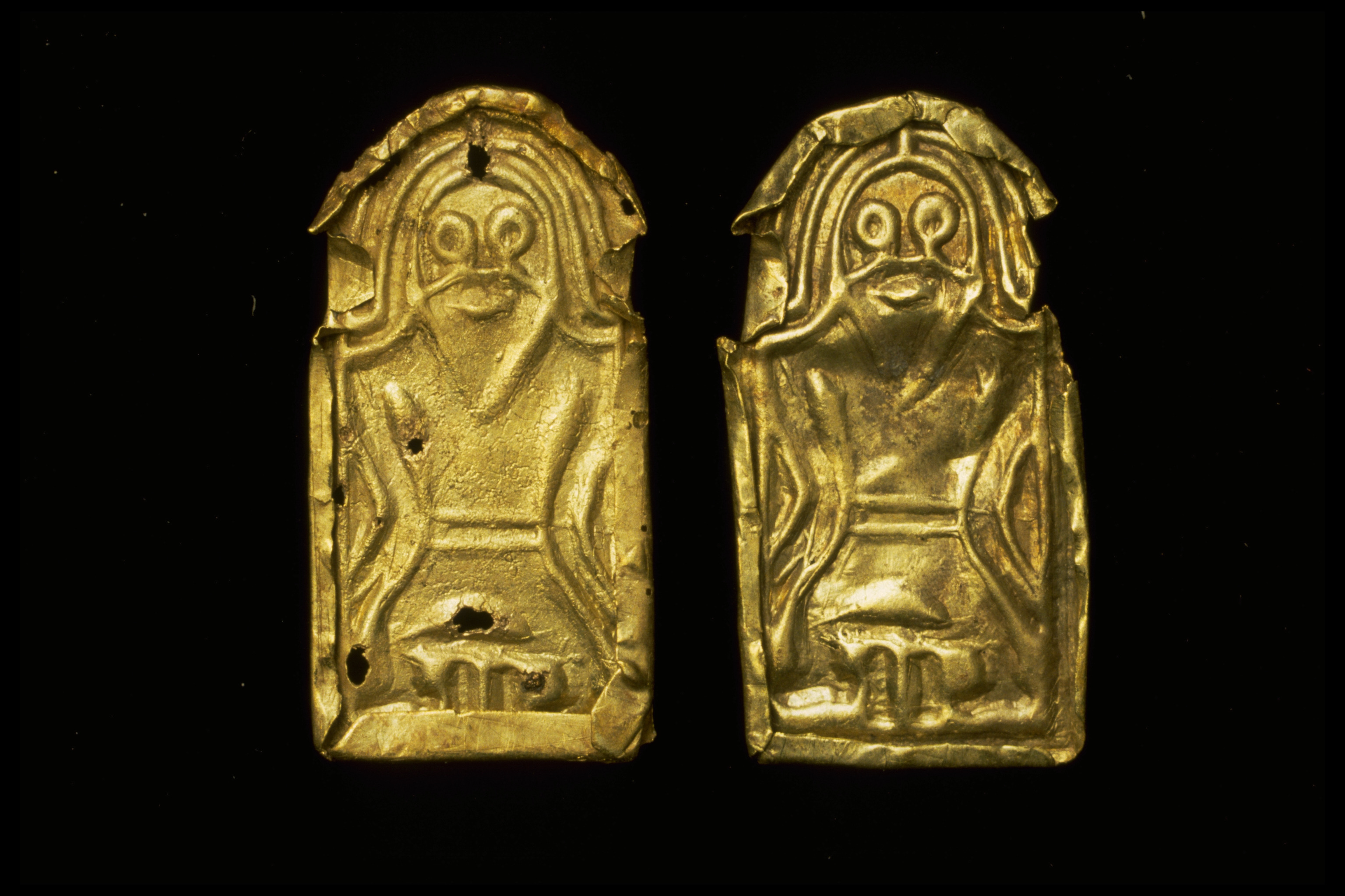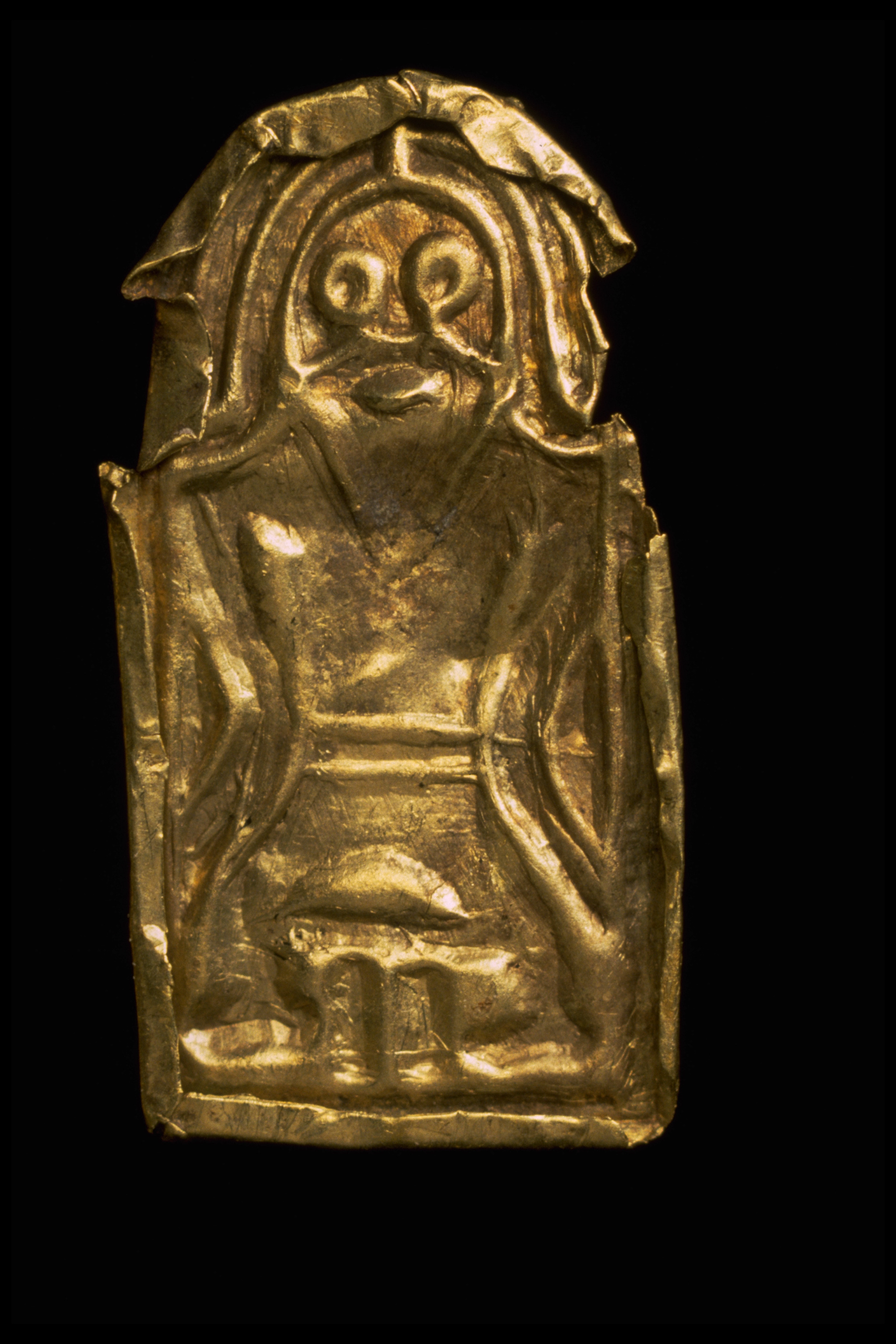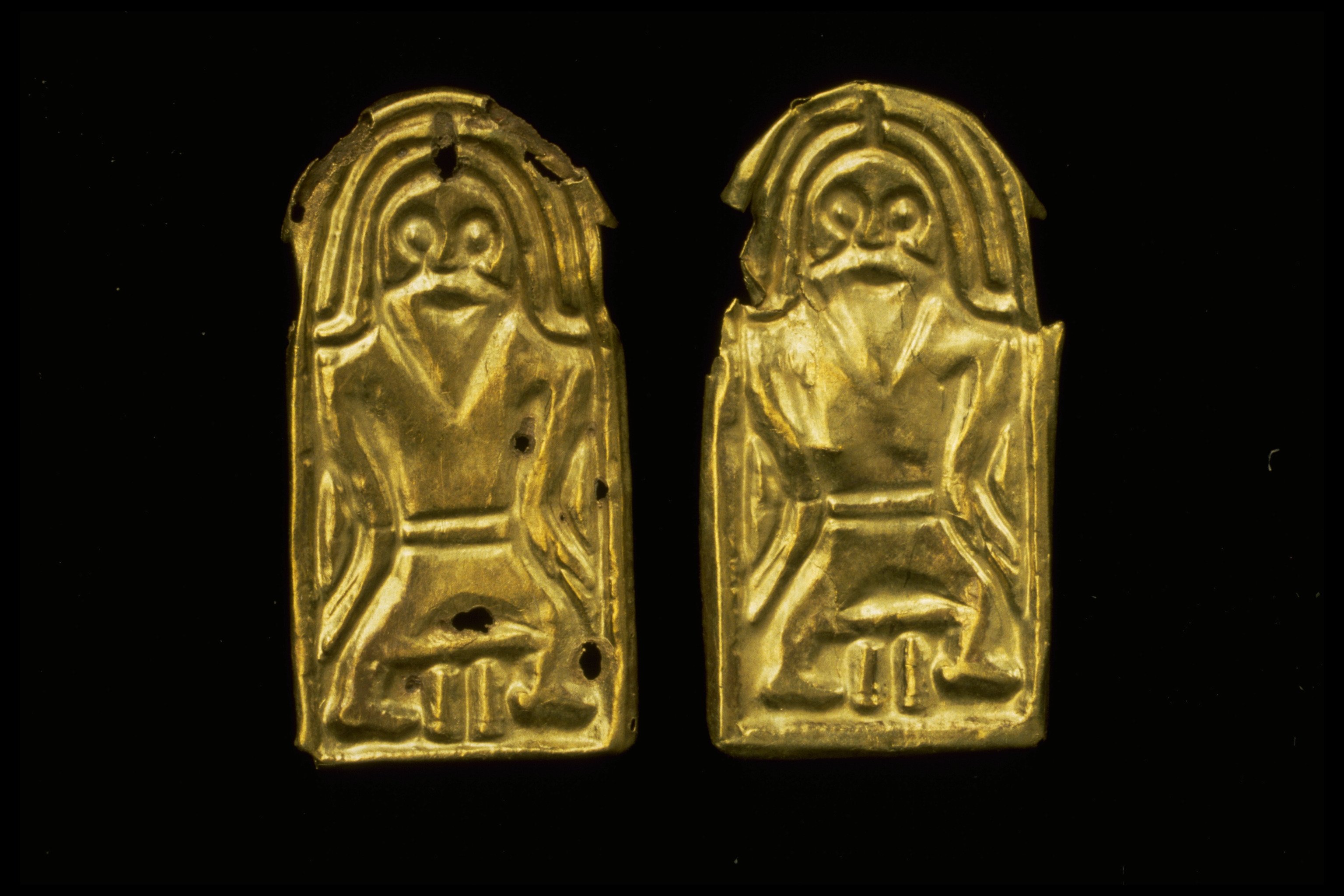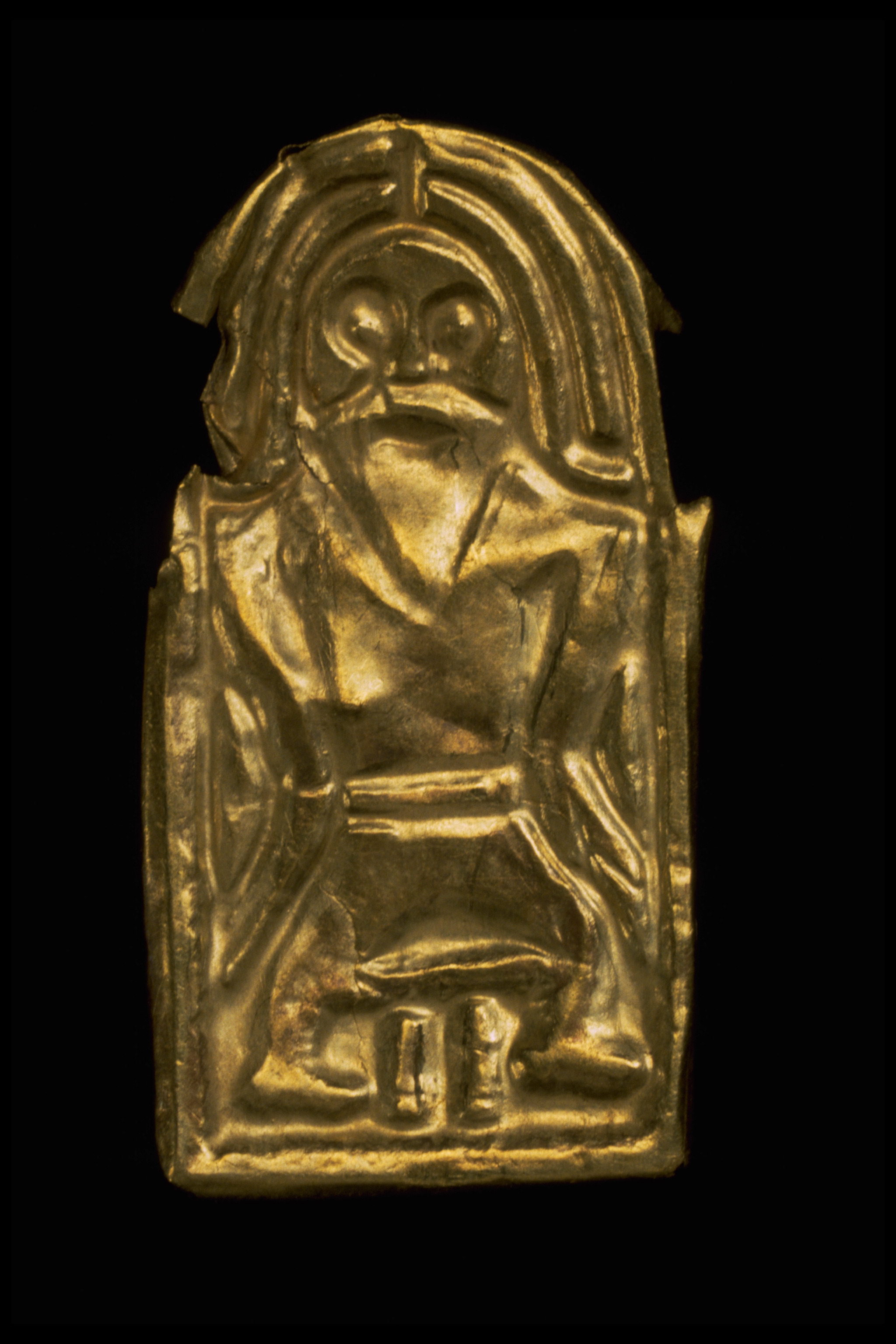 Guldgubbe med framställning av en sittande man, på baksidan är bleckets kanter invikta.