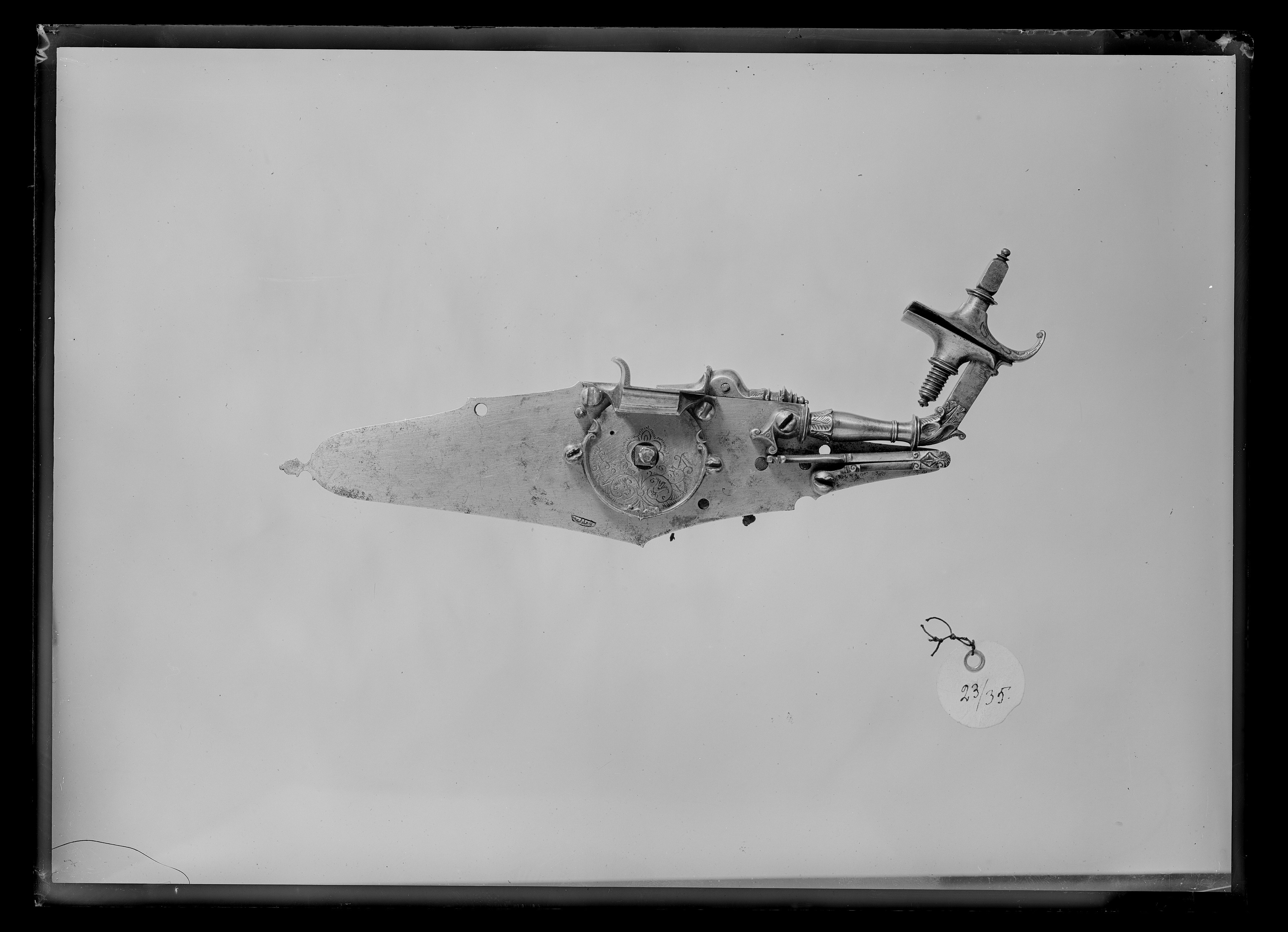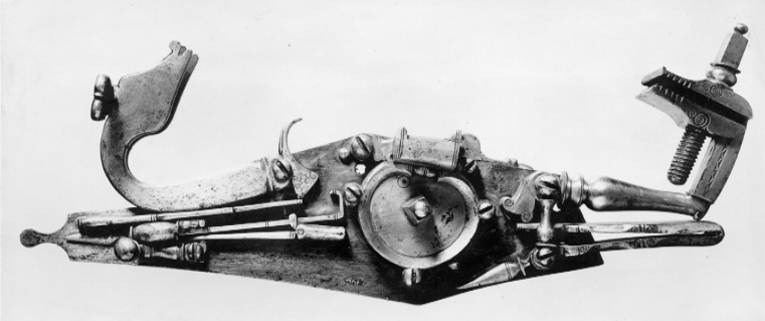 Kombinerat lunt- och hjullås av stål med rombiskt, plant låsbleck med rundad knopp på bakre änden. Utvändigt hjul fäst med ring och tre skruvar kl 3, 6 och 9. Kantig hjulaxel med rund knopp. Kantig fängpanna med två skruvar. Fängpannelock med rörlig arm och fingergrepp med spolformig spets. Bakom hjulet en platt lunthane med kantig häl och spetsigt nedböjd tå. Luntklämma, klämskruv med trepassformigt, genombrutet huvud. På blecket en stångfjäder. Framför hjulet en hjullåshane med balusterformig kropp, plan hals med sicksackband på mitten. Käkarna tandade och graverade med spiraler. Underkäken lös. Fyrsidig hanskruv med knopp och svarvad bas. Balusterformig hanstudel. Graverad hanfjäder med delvis fasade kanter, droppformig, välvd flik. På låsblecket under hjulet en stämpel med båglinje (hästsko?) och krona, kronan flankerad av bokstäver (VF?). Säkring: Virvelsäkring.